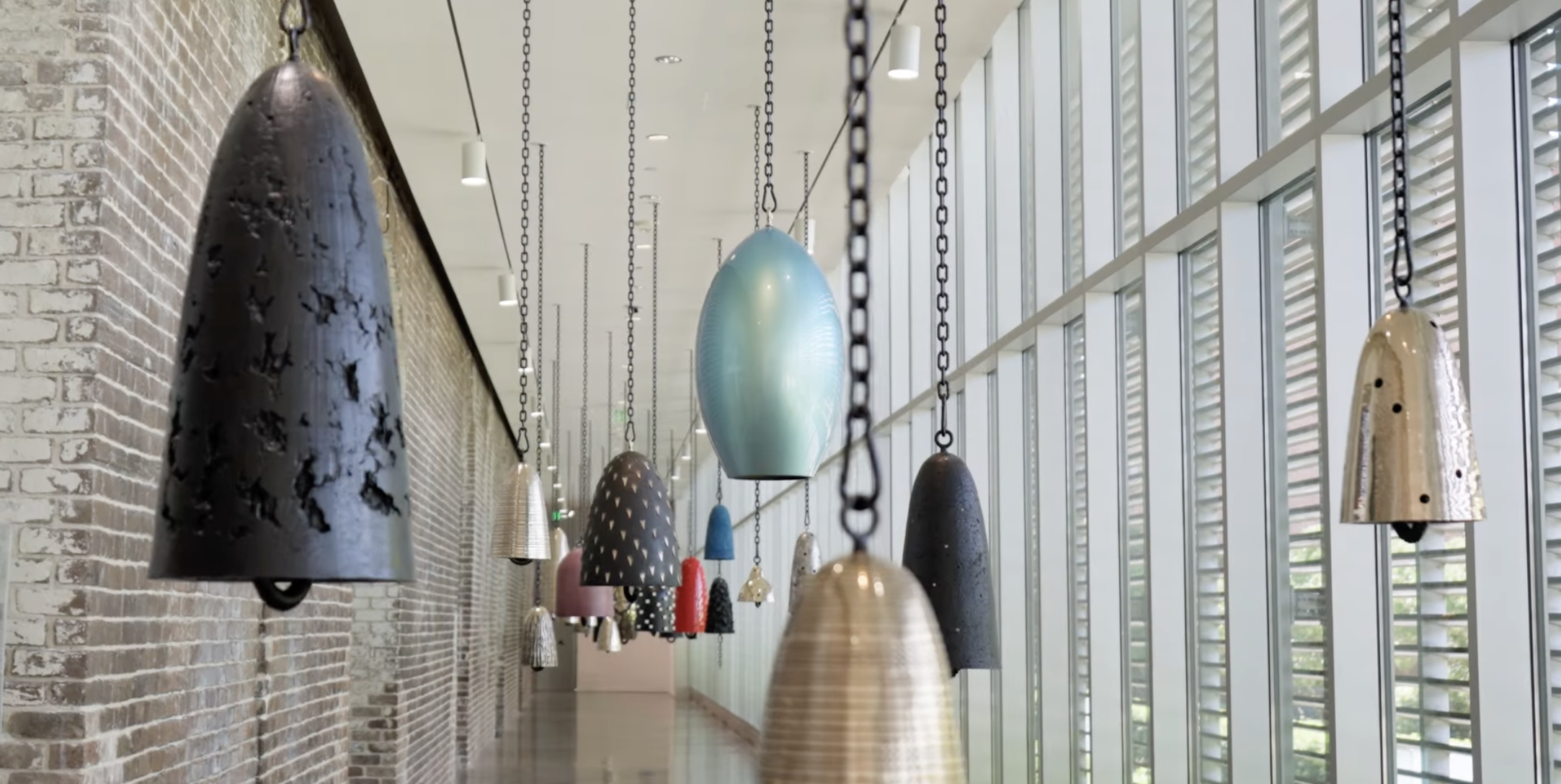 Patinated cast bronze bell, PolyJet 3D-printed opaque VeroWhite resin, leather-wrapped solid bronze clapper, hemp shibari rope, powder coated stainless steel hardware, powder coated galvanized steel chain