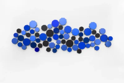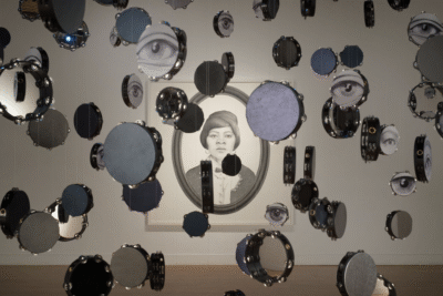 Tambourines, leather, suede, Plexiglas, mirrored acrylic, monofilament wire, S-hooks, aluminum grid, steel