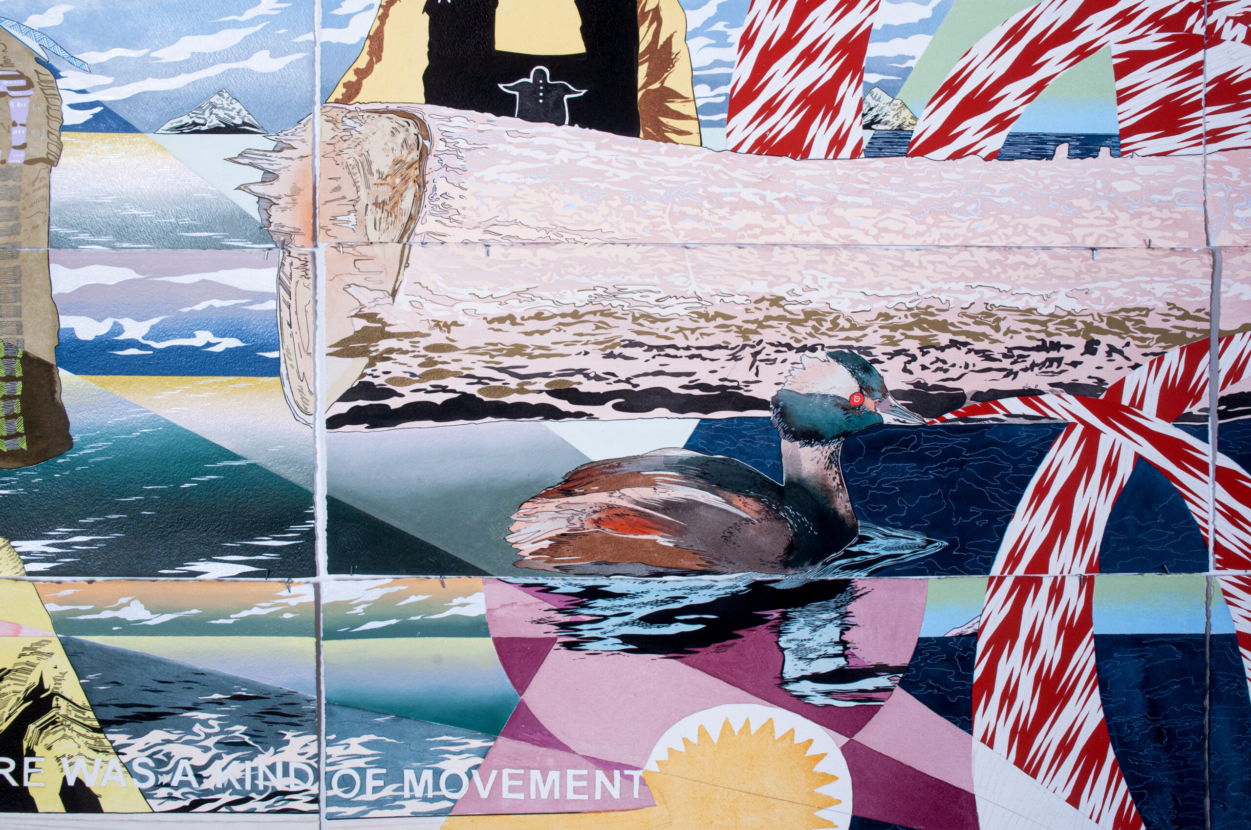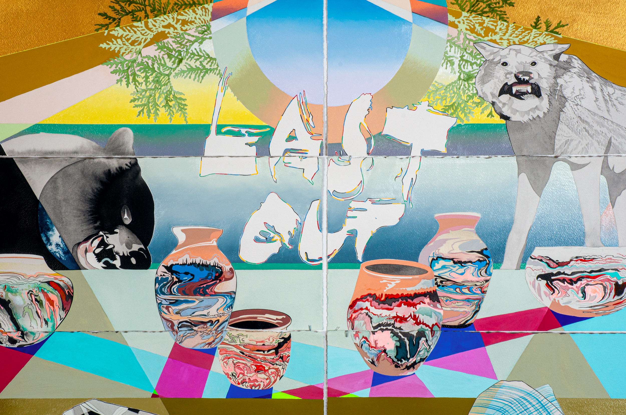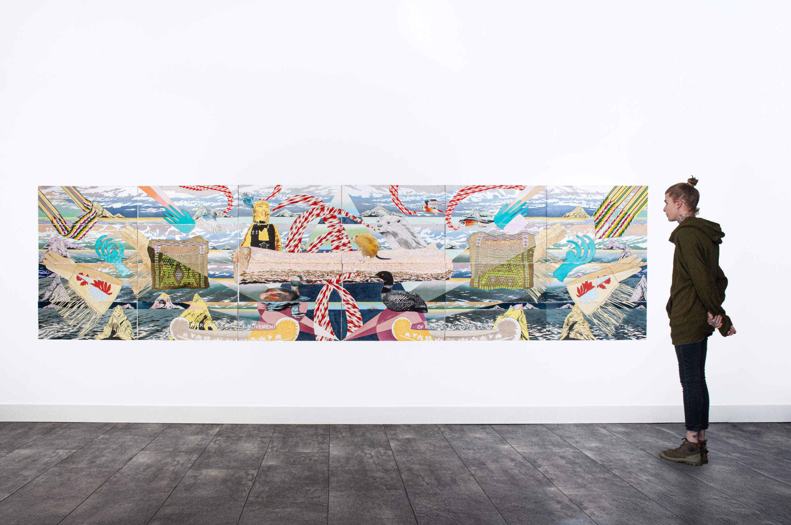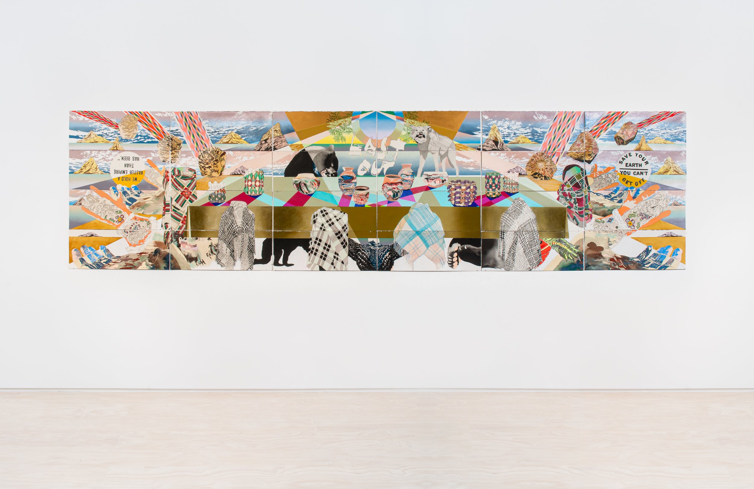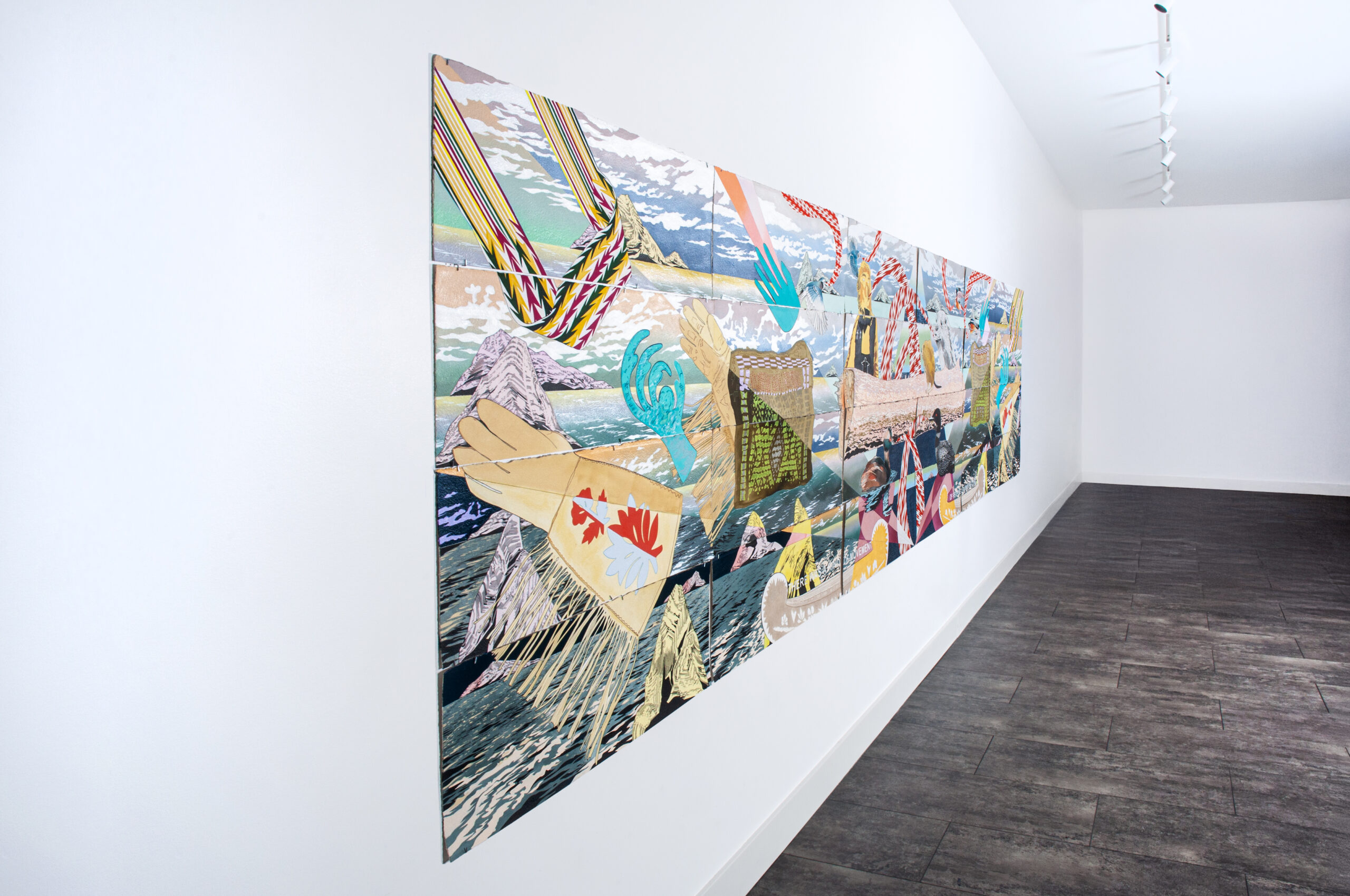 Titled “The Lasting,” Carlson’s solo show comprises two monumental paintings, eight smaller paintings on paper, and one sculpture. Carlson’s title plays on historian Jean M. O’Brien’s important book Firsting and Lasting, which examines how American local histories celebrated the arrivals and founding “firsts” of European settlers while lamenting the disappearance of the original inhabitants—even though Natives still lived in the very towns being chronicled. Indigenous people were memorialized as “lasts” in the manner of “The Last of the Mohicans,” spreading the myth of “Native extinction”—a myth that persists in many American minds to this day. However, through a conceptual twist, Carlson transforms these last-of-their-kind stories into narratives of long-lasting resilience, honoring the survival and ongoing adaptability of Native people.