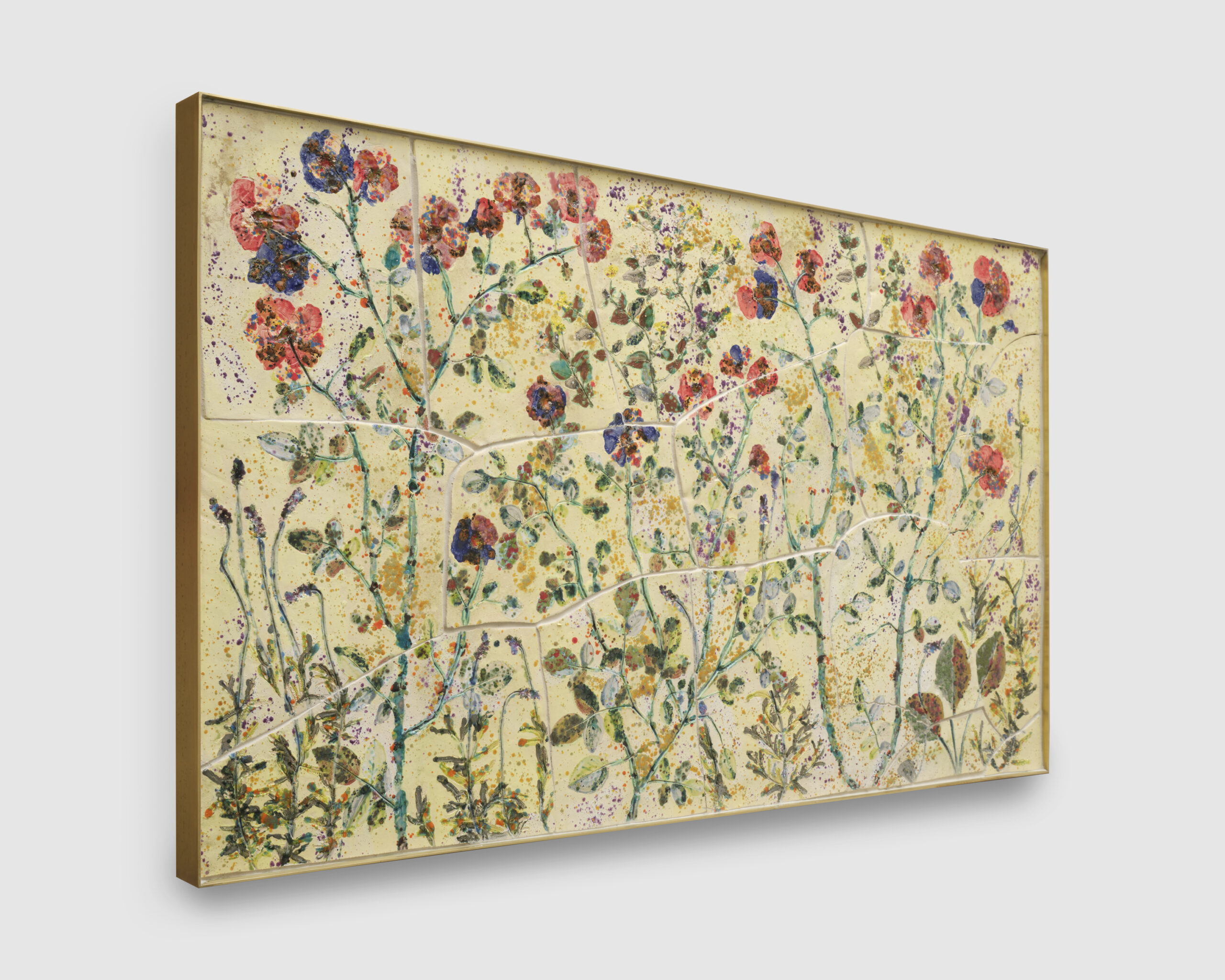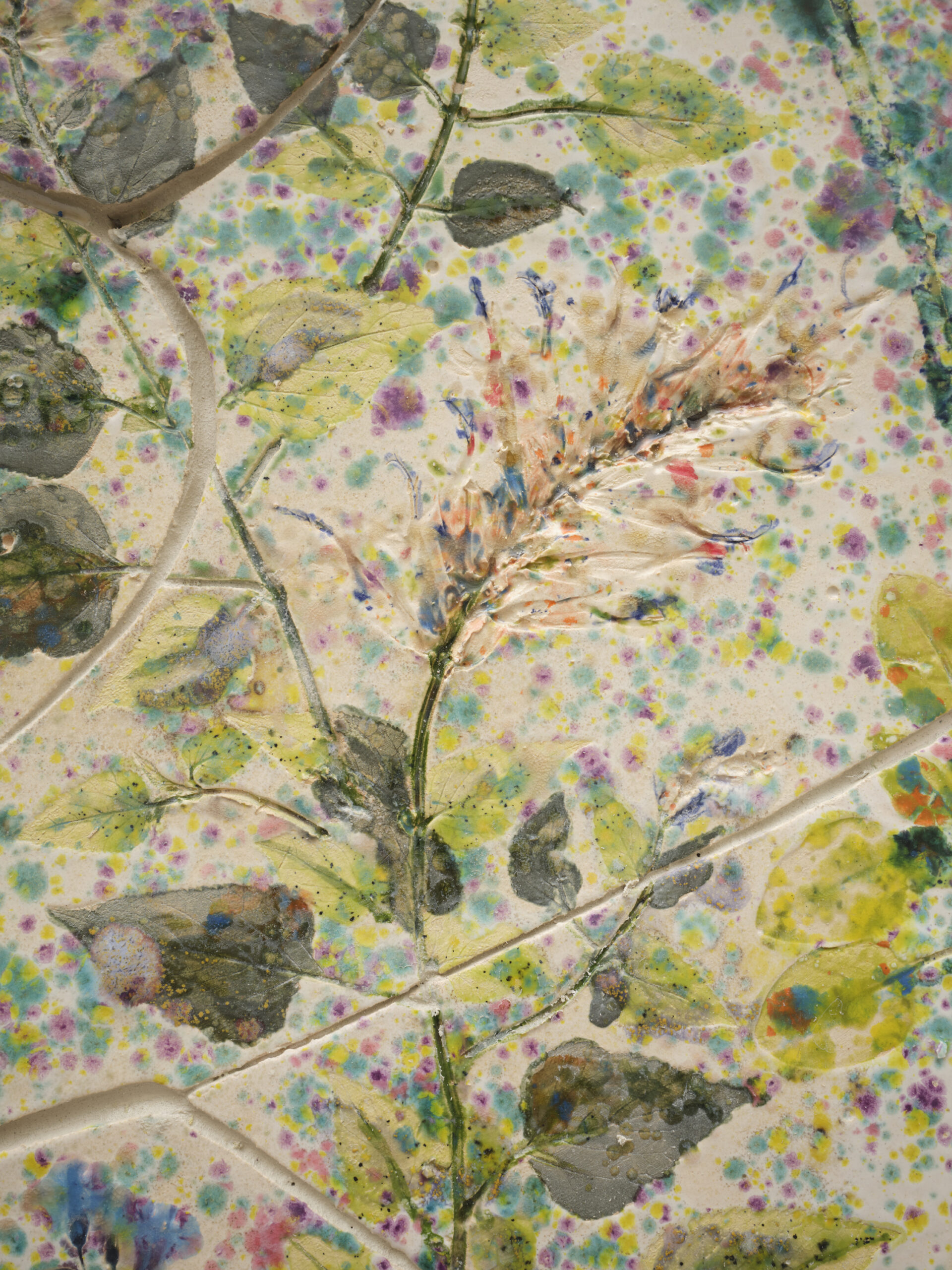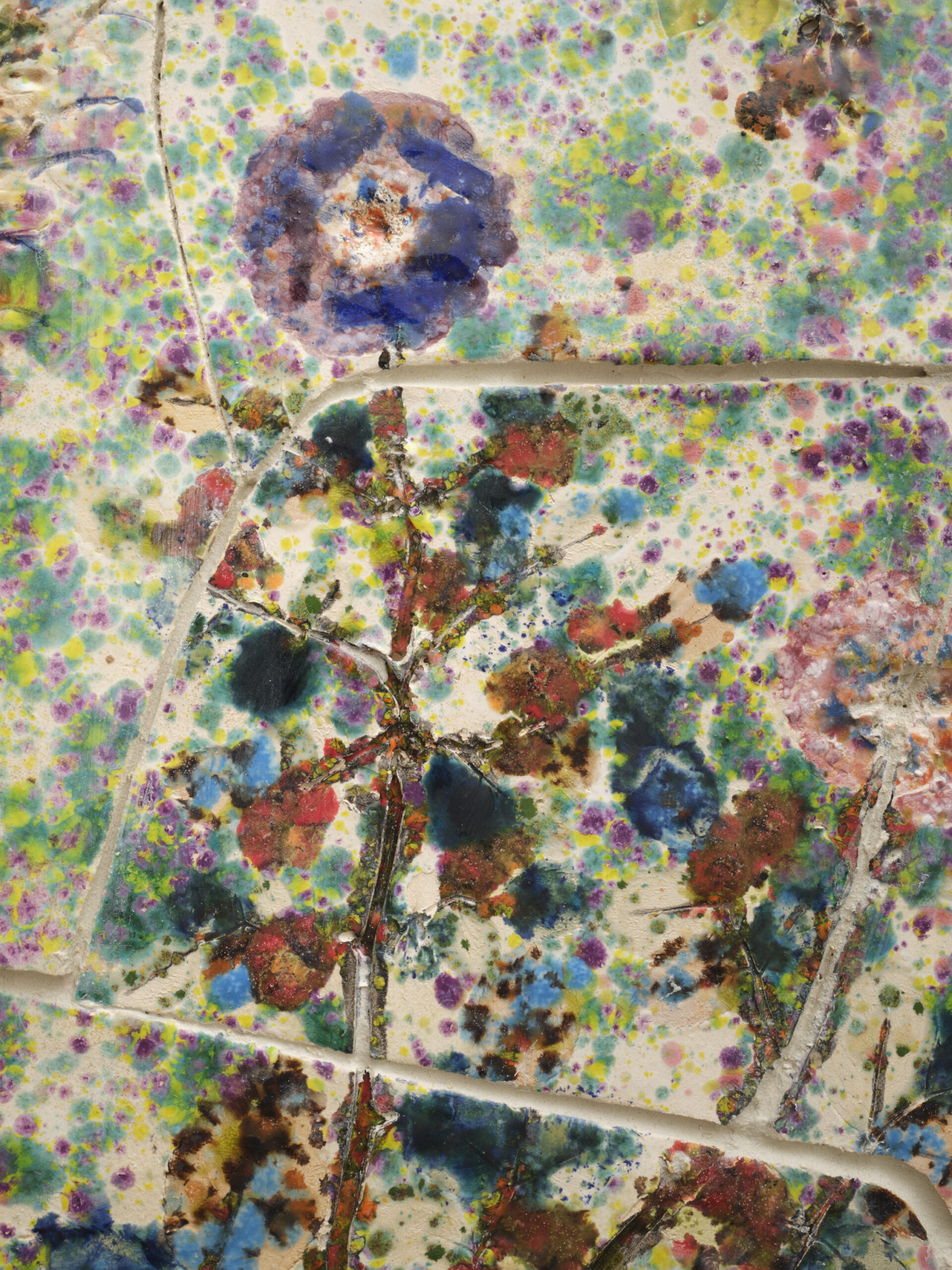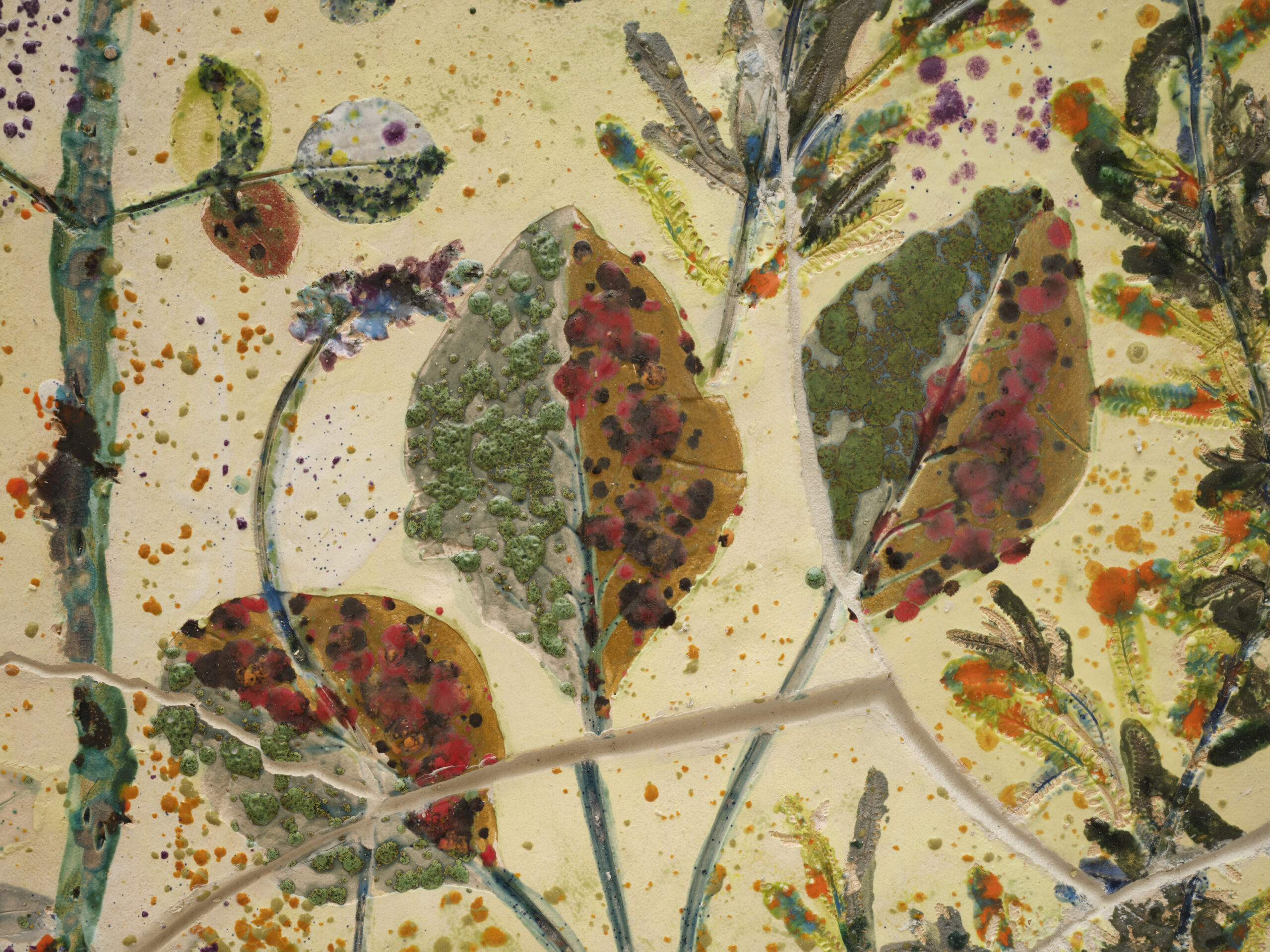 Sam Falls memorializes organic matter in ceramics that embody time, chance, and process. His new wall works fuse botanicals with melted glass, transfiguring plant life into luminous fossils.