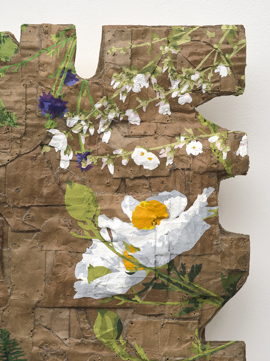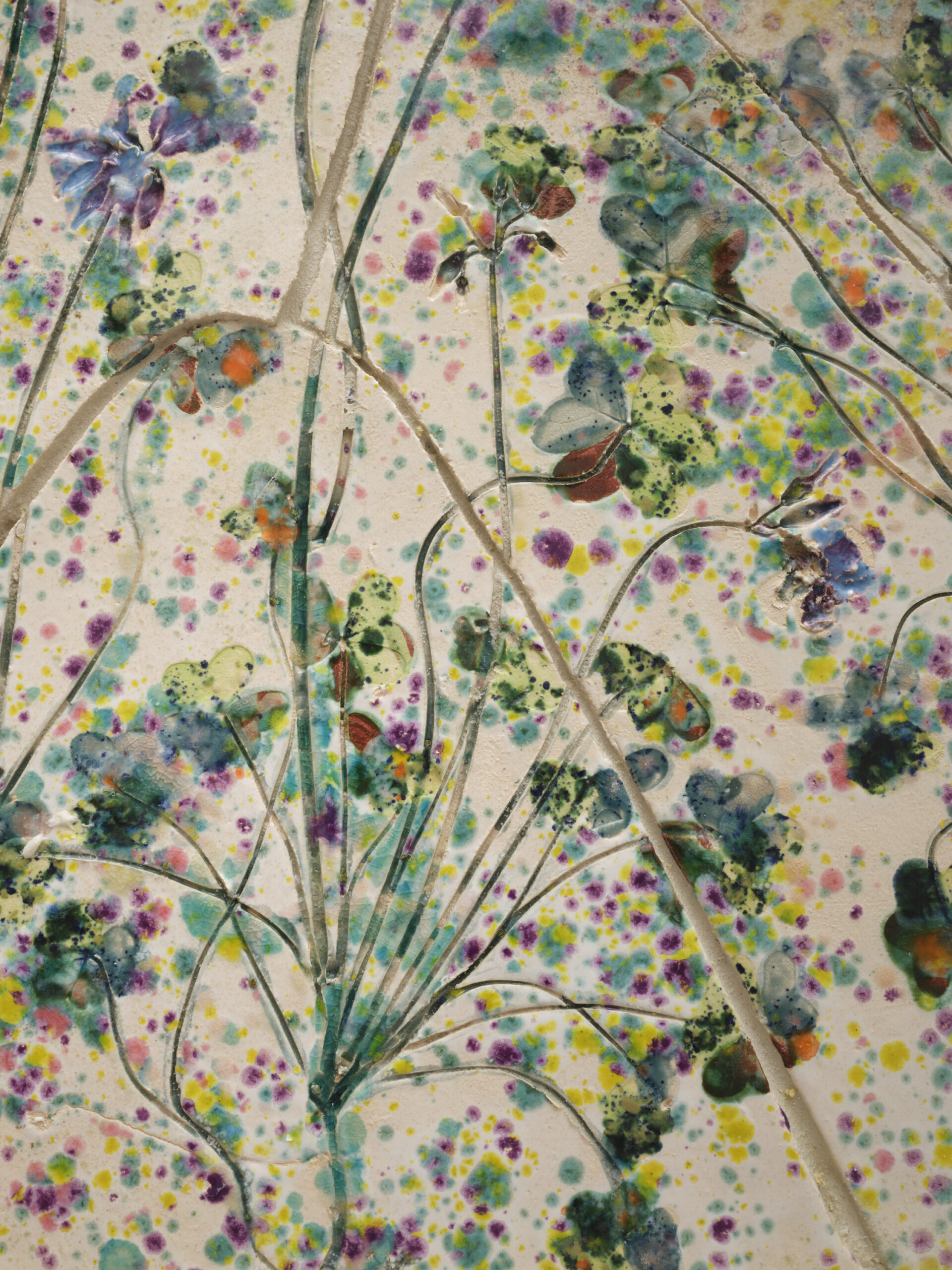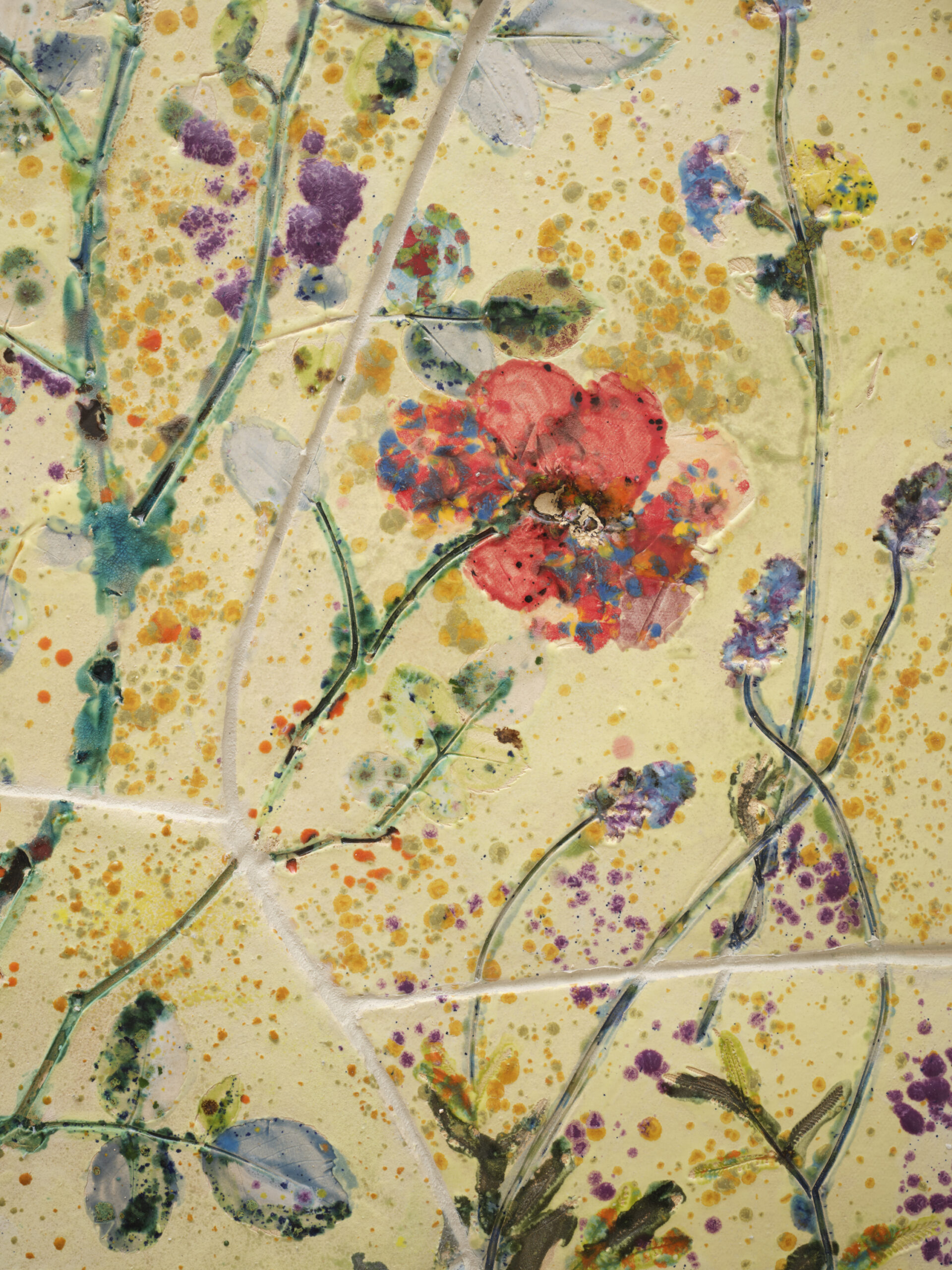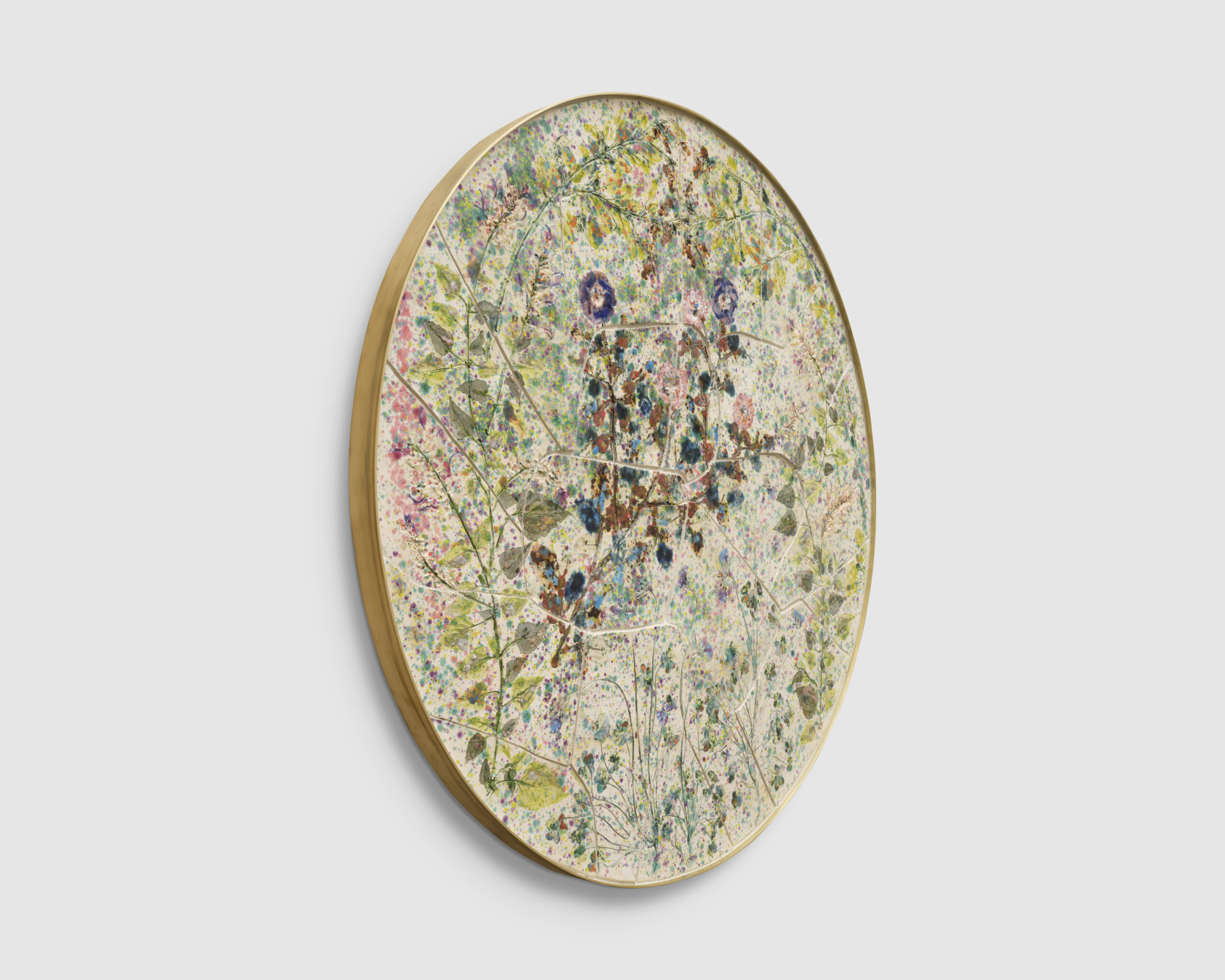 Sam Falls memorializes organic matter in ceramics that embody time, chance, and process. His new wall works fuse botanicals with melted glass, transfiguring plant life into luminous fossils.
