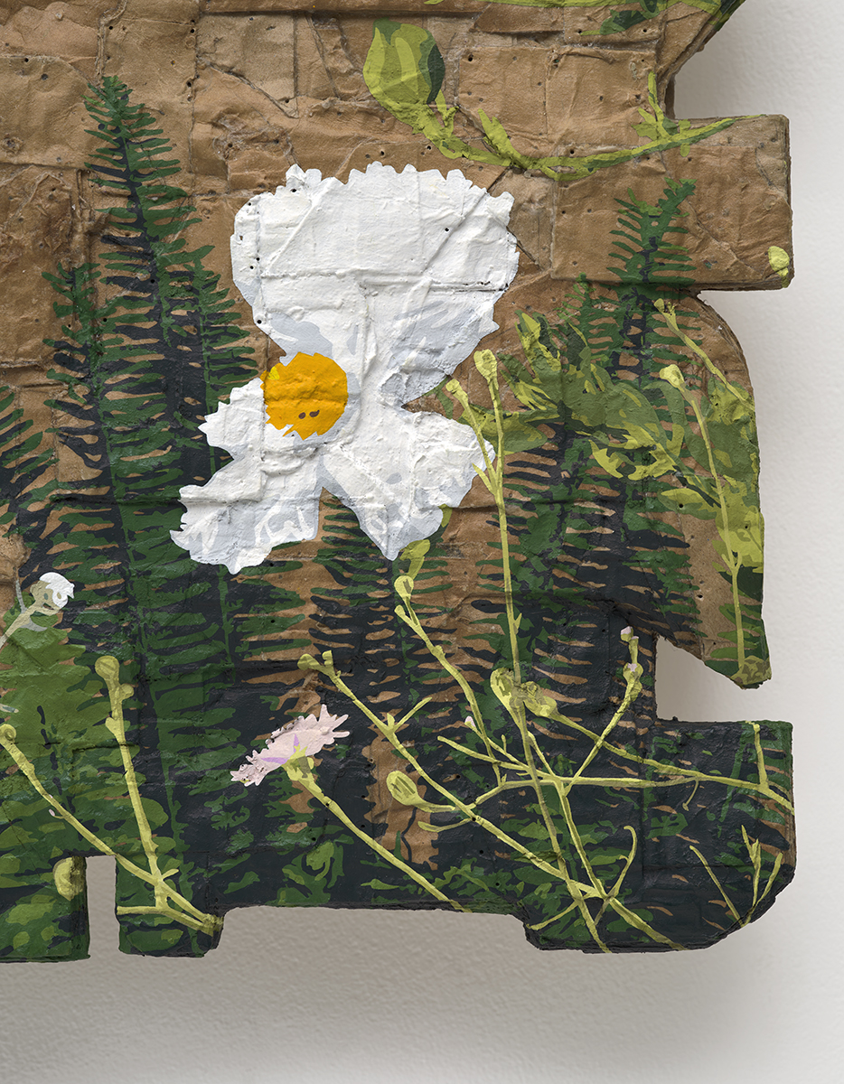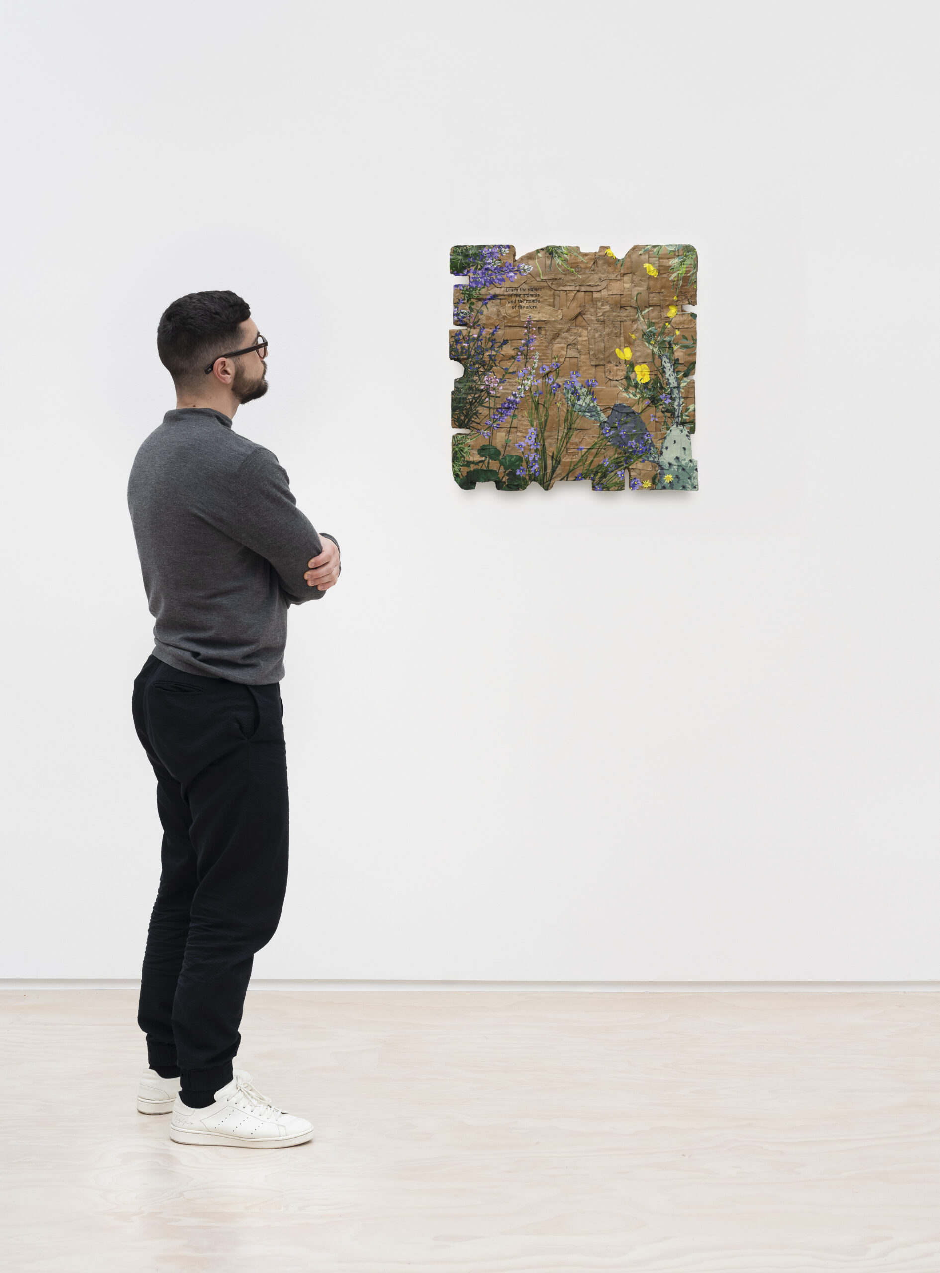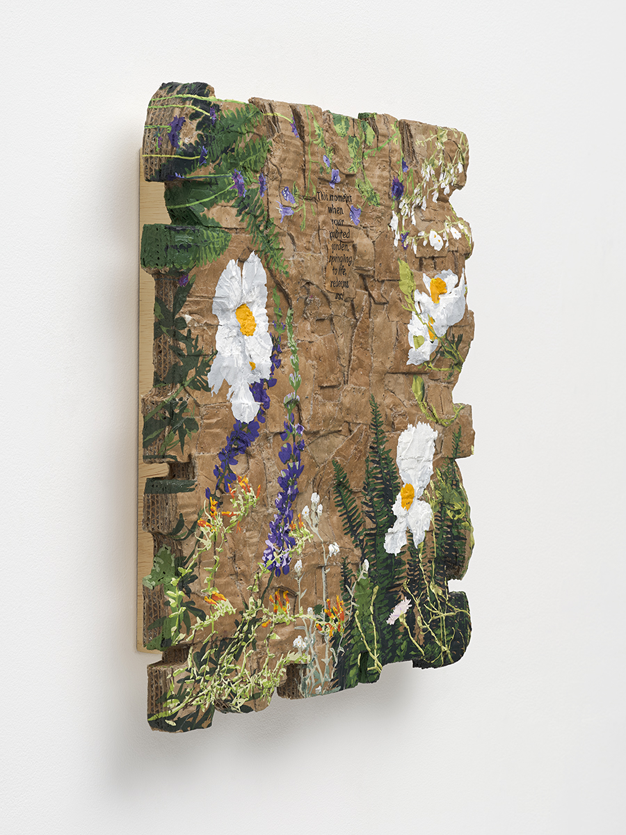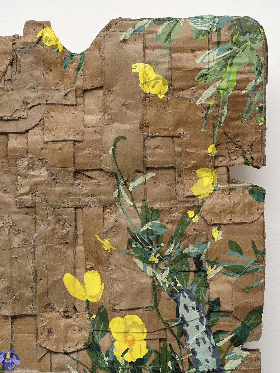 Sam Falls memorializes organic matter in ceramics that embody time, chance, and process. His new wall works fuse botanicals with melted glass, transfiguring plant life into luminous fossils.