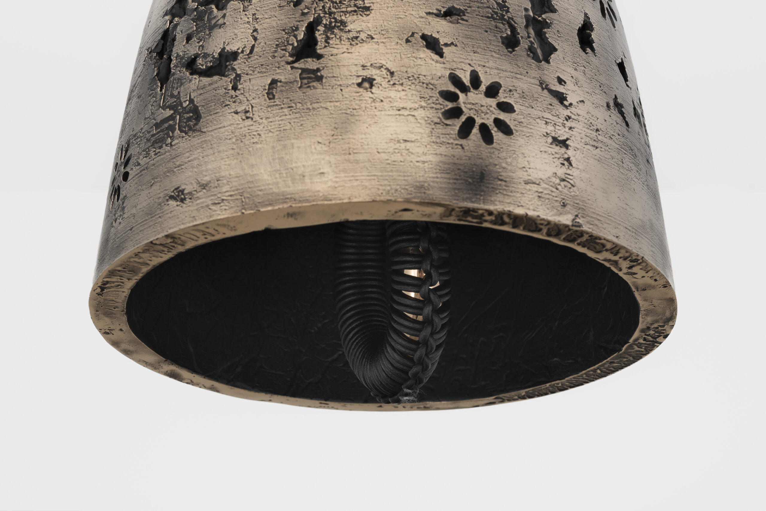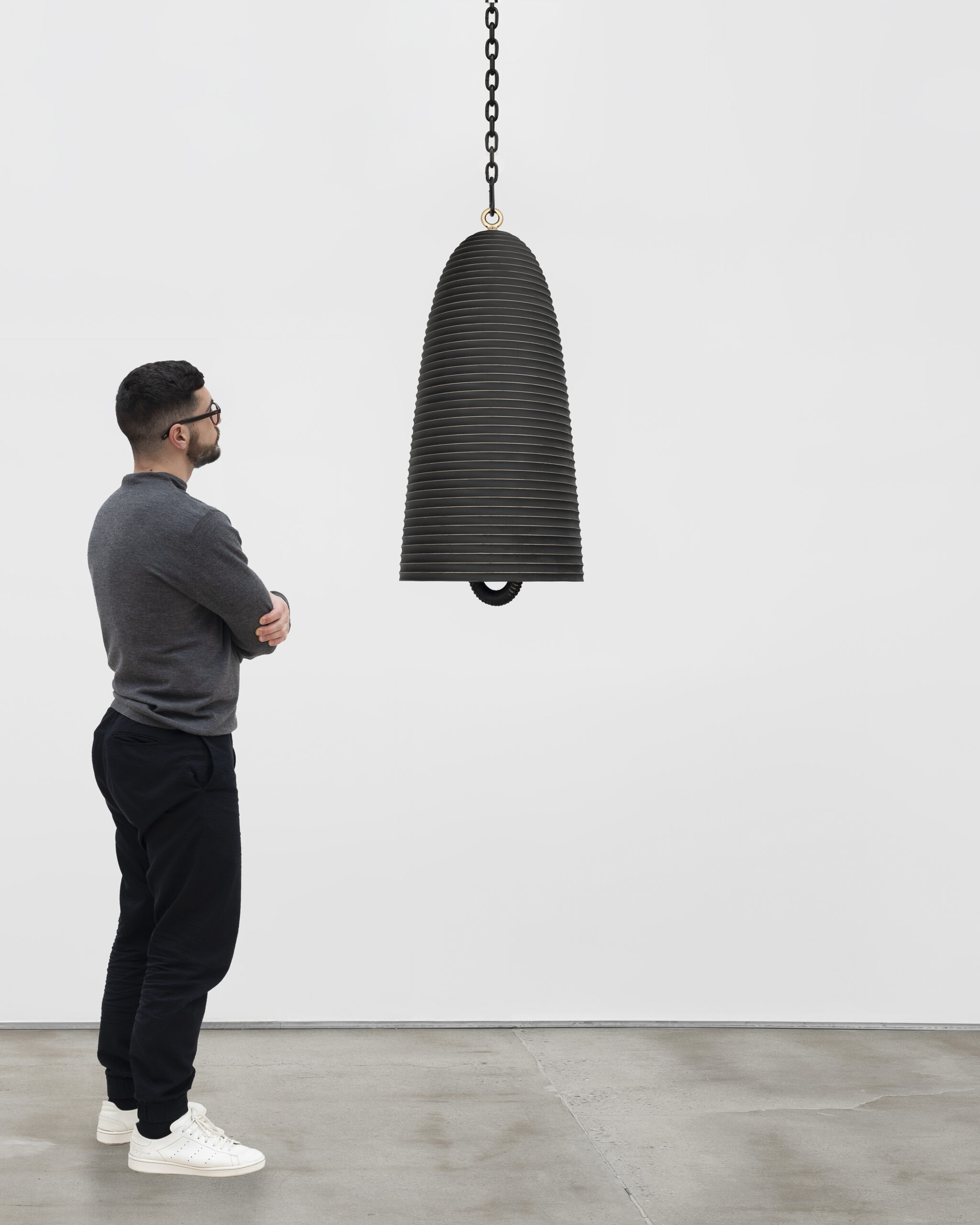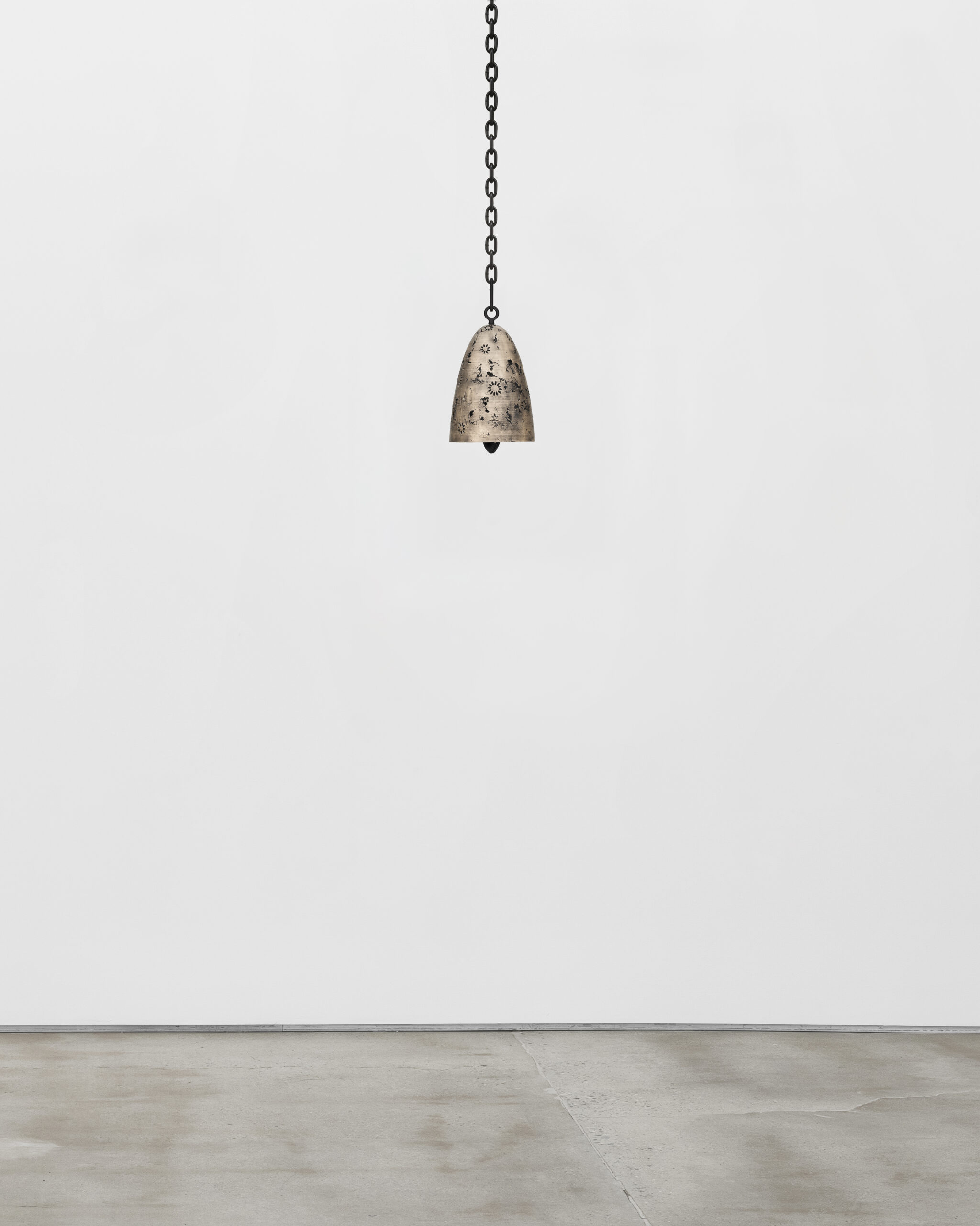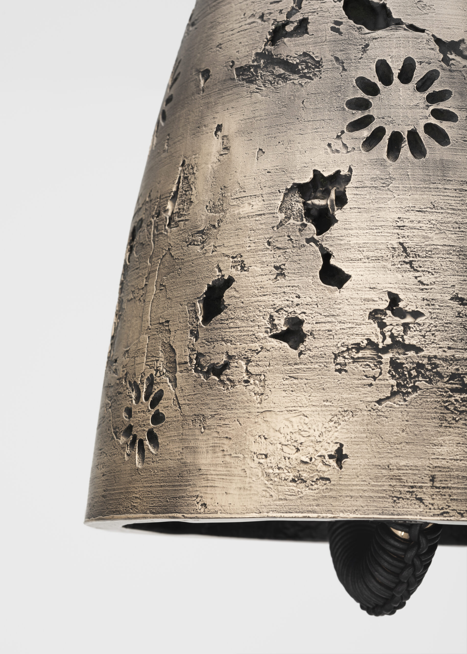 Polished and patinated cast bronze bell, leather-wrapped solid bronze clapper, hemp shibari rope, powder-coated stainless steel hardware, powder-coated zinc-plated steel chain