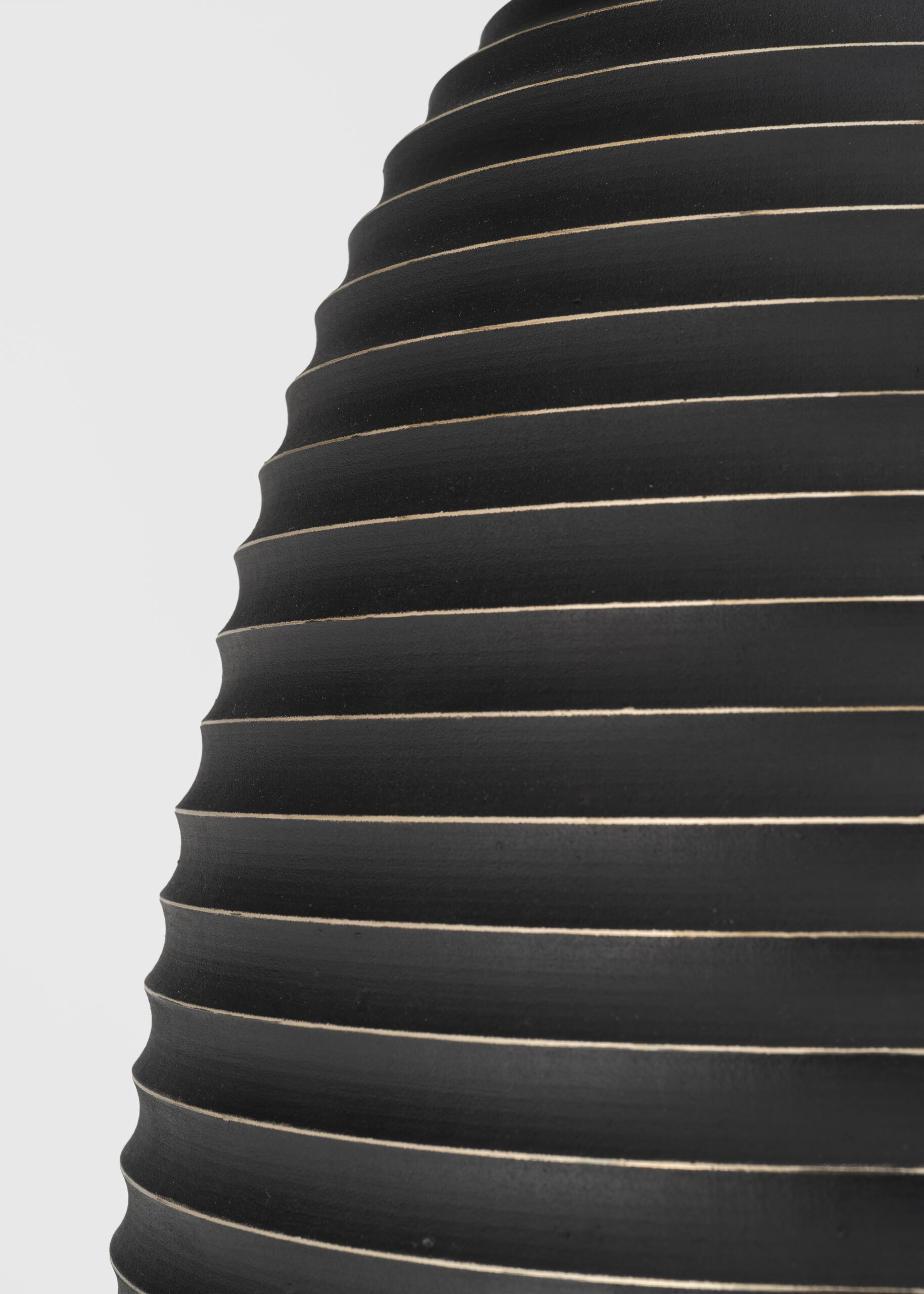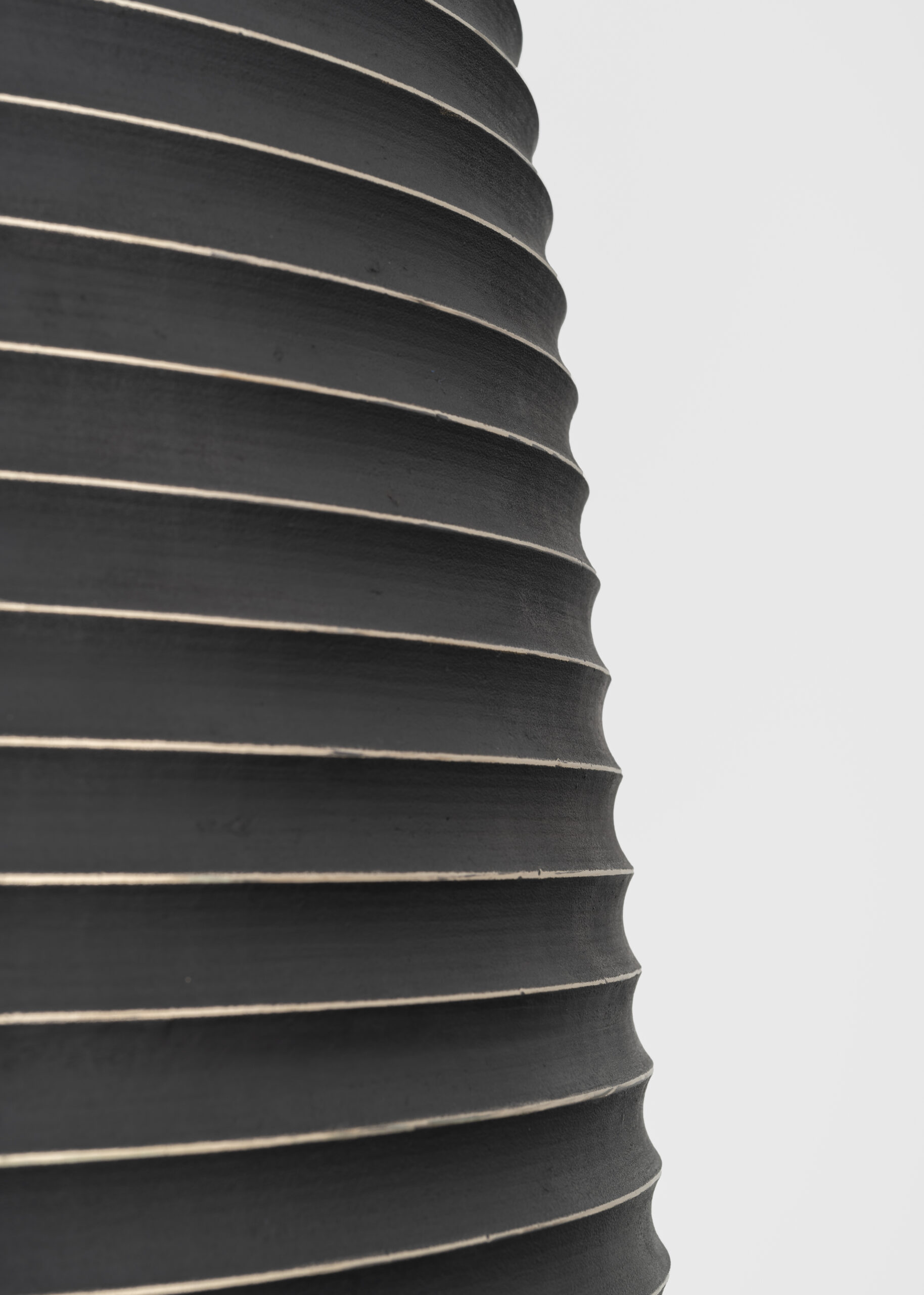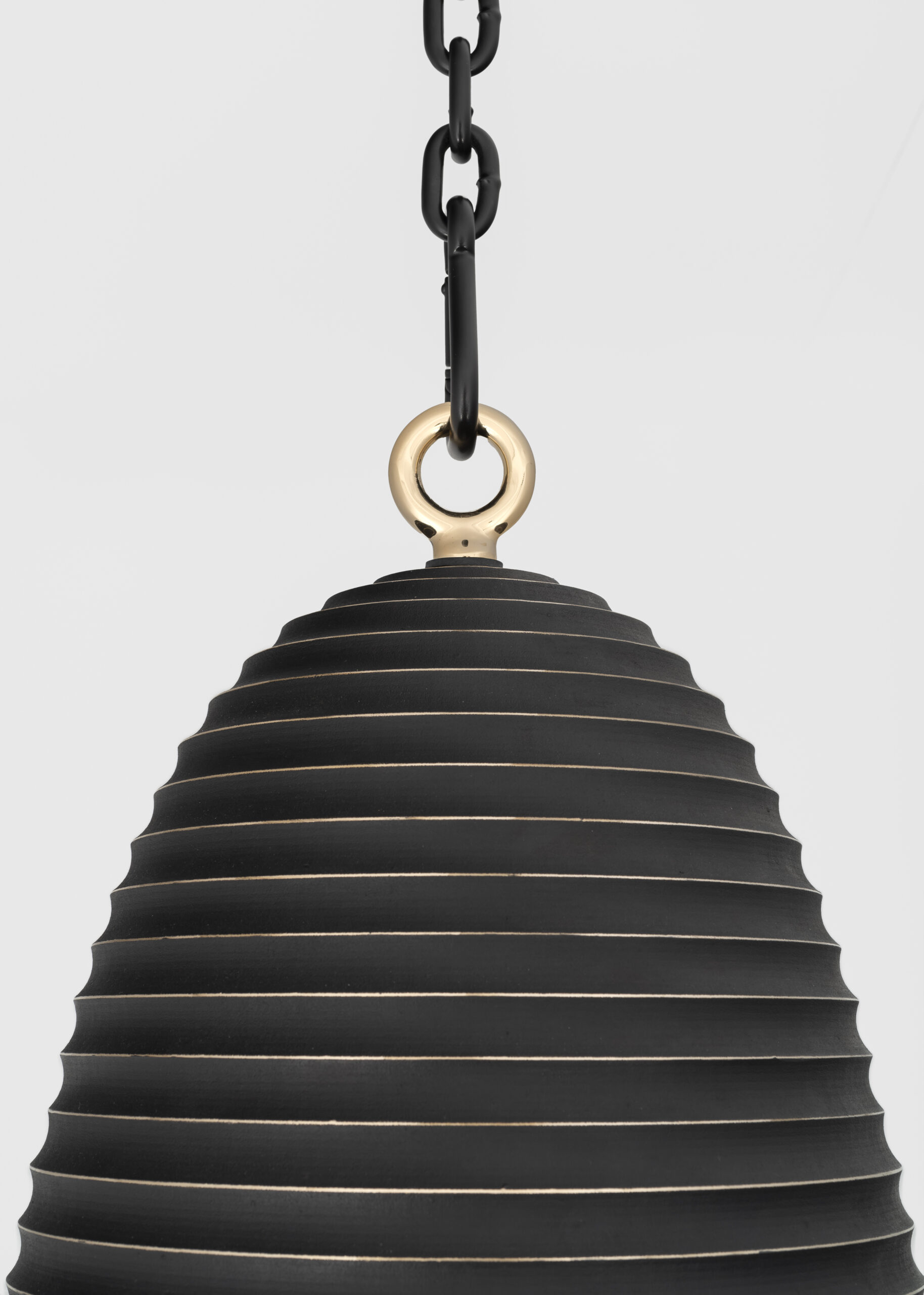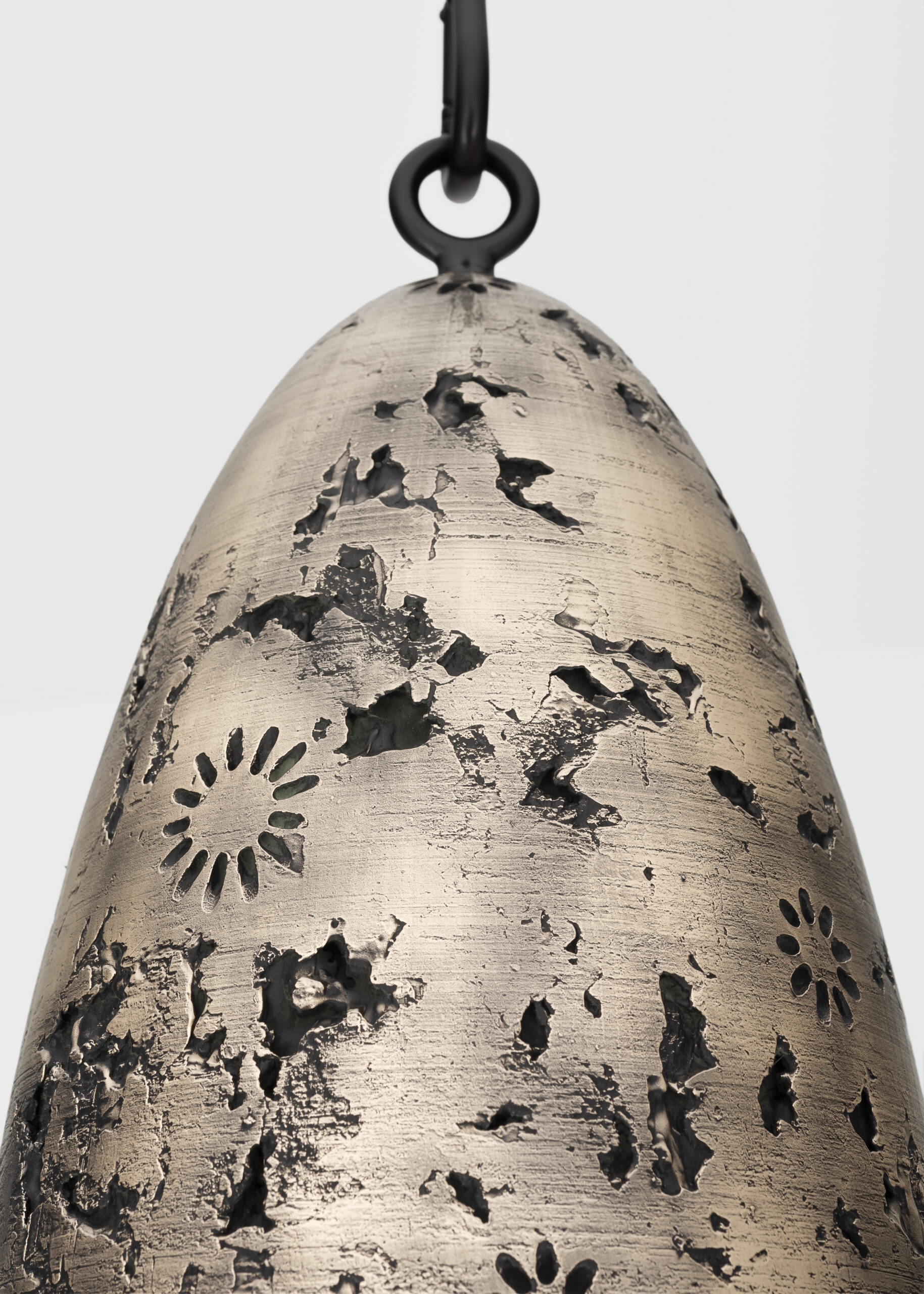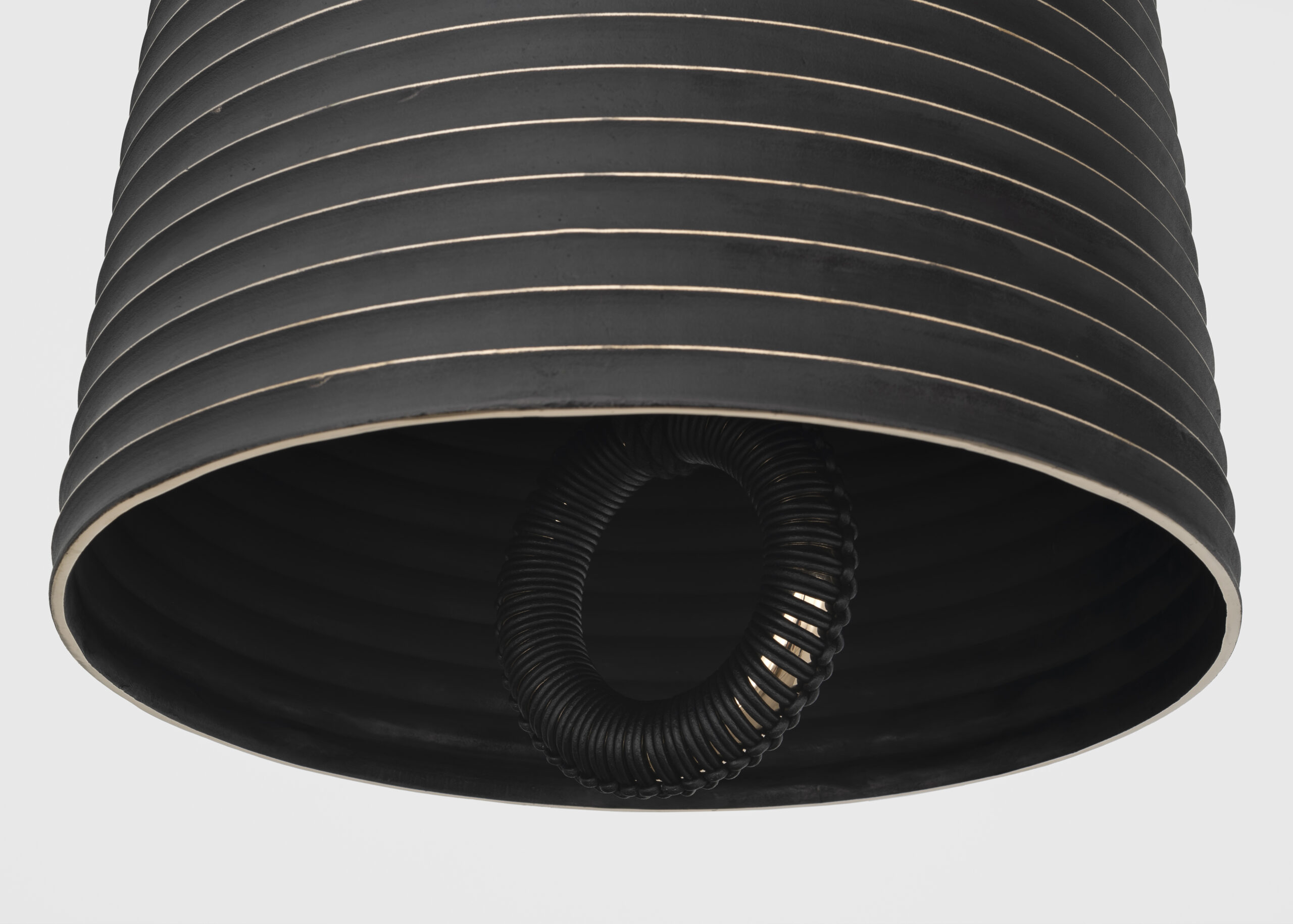 Polished and patinated cast bronze bell, leather-wrapped solid bronze clapper, hemp shibari rope, powder-coated stainless steel hardware, powder-coated zinc-plated steel chain