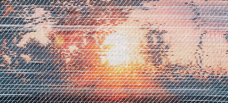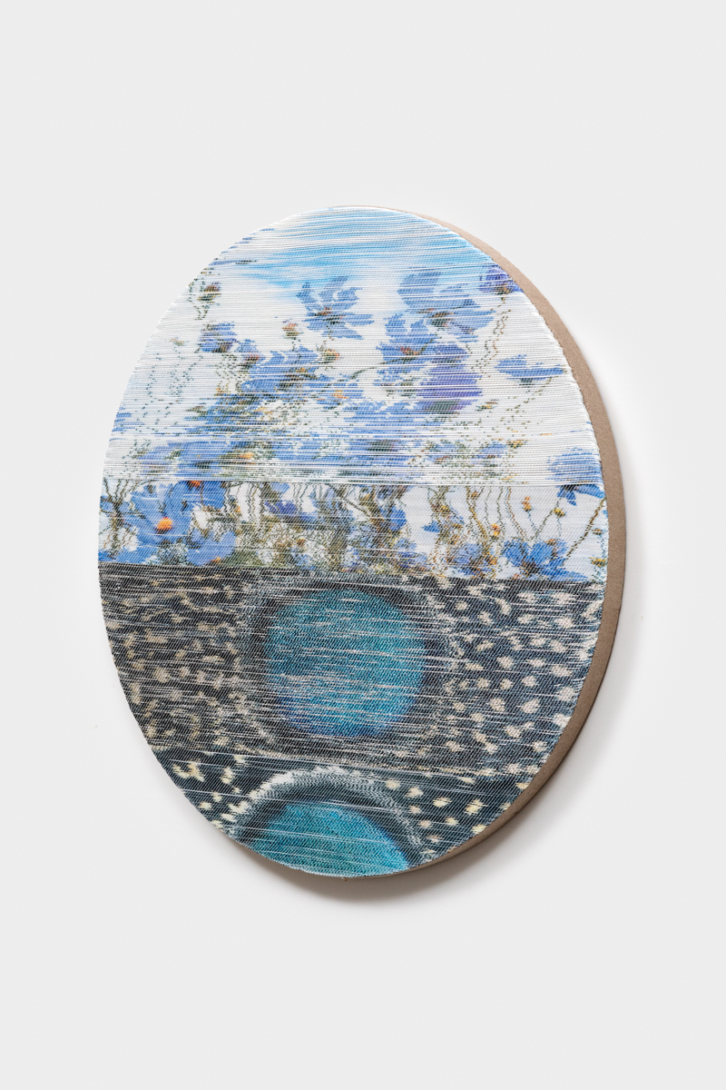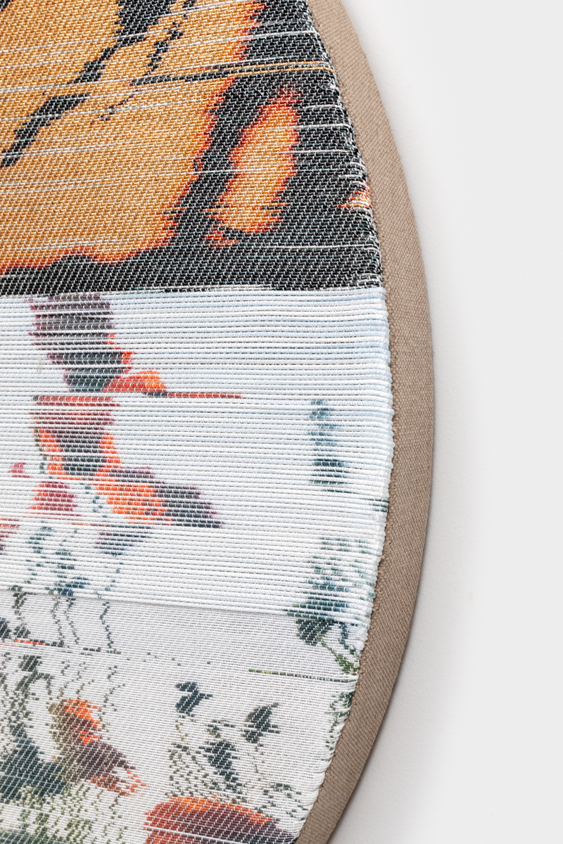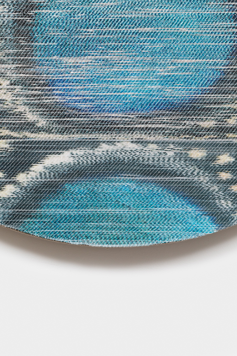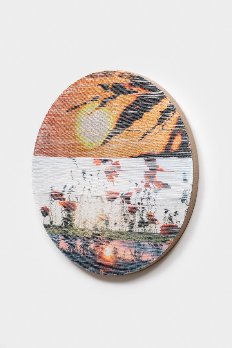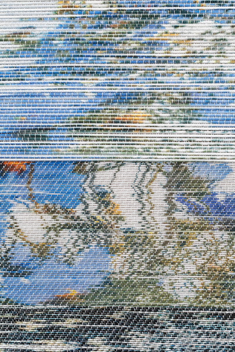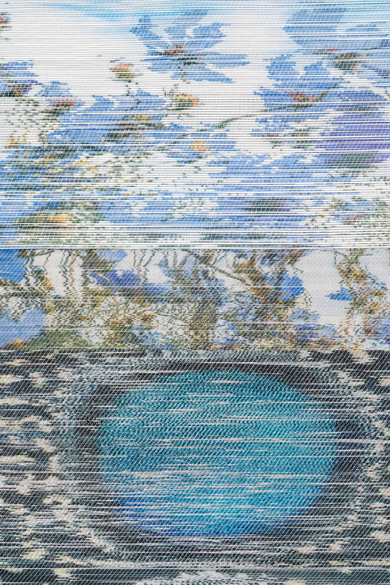 Handwoven polymer, linen and sterling silver leafed threads, dye sublimation ink, mounted on hemp support