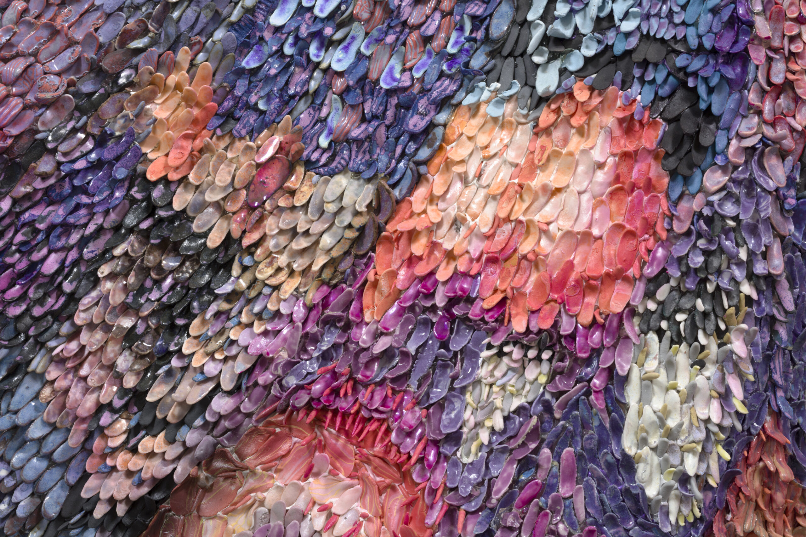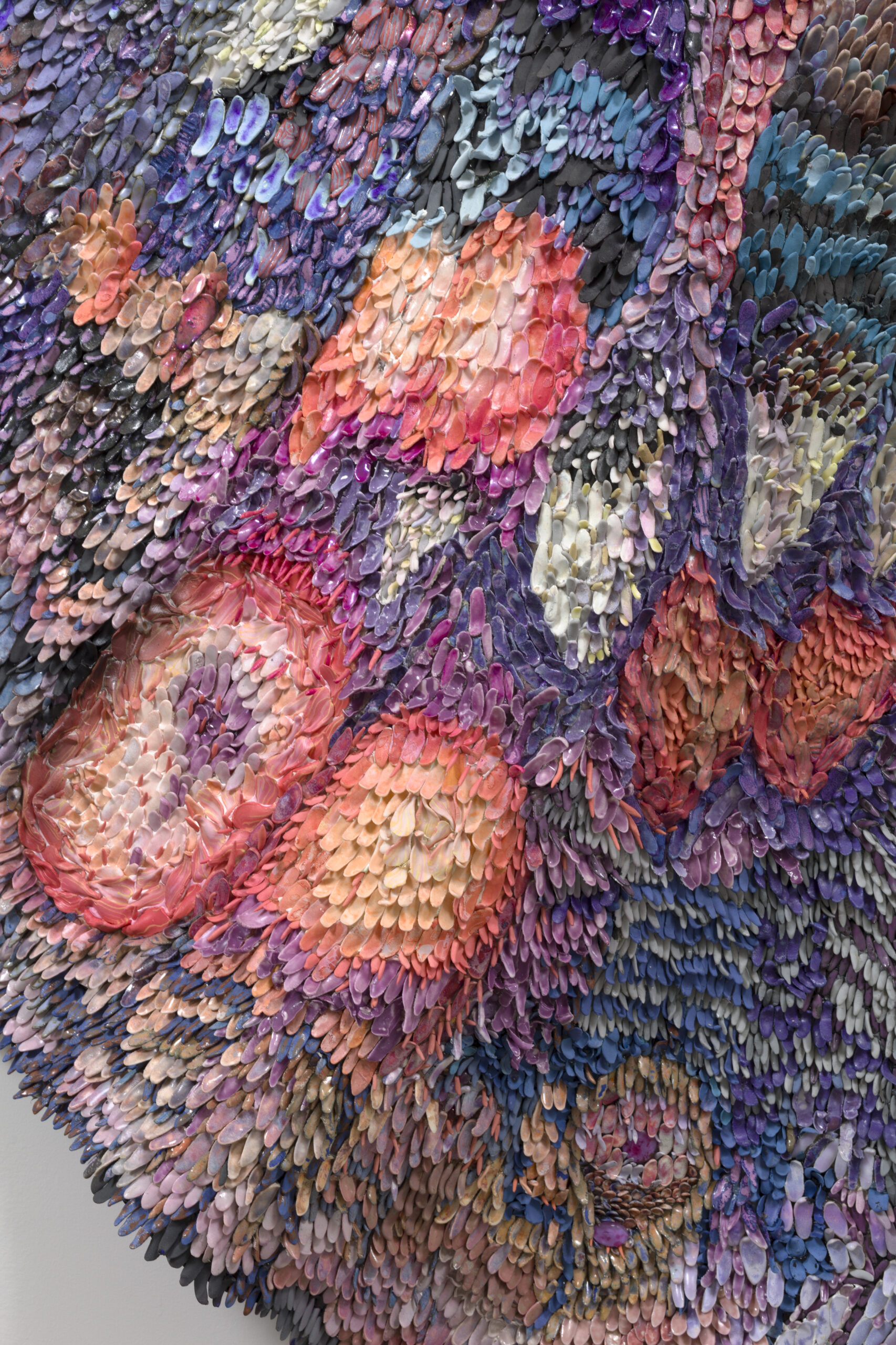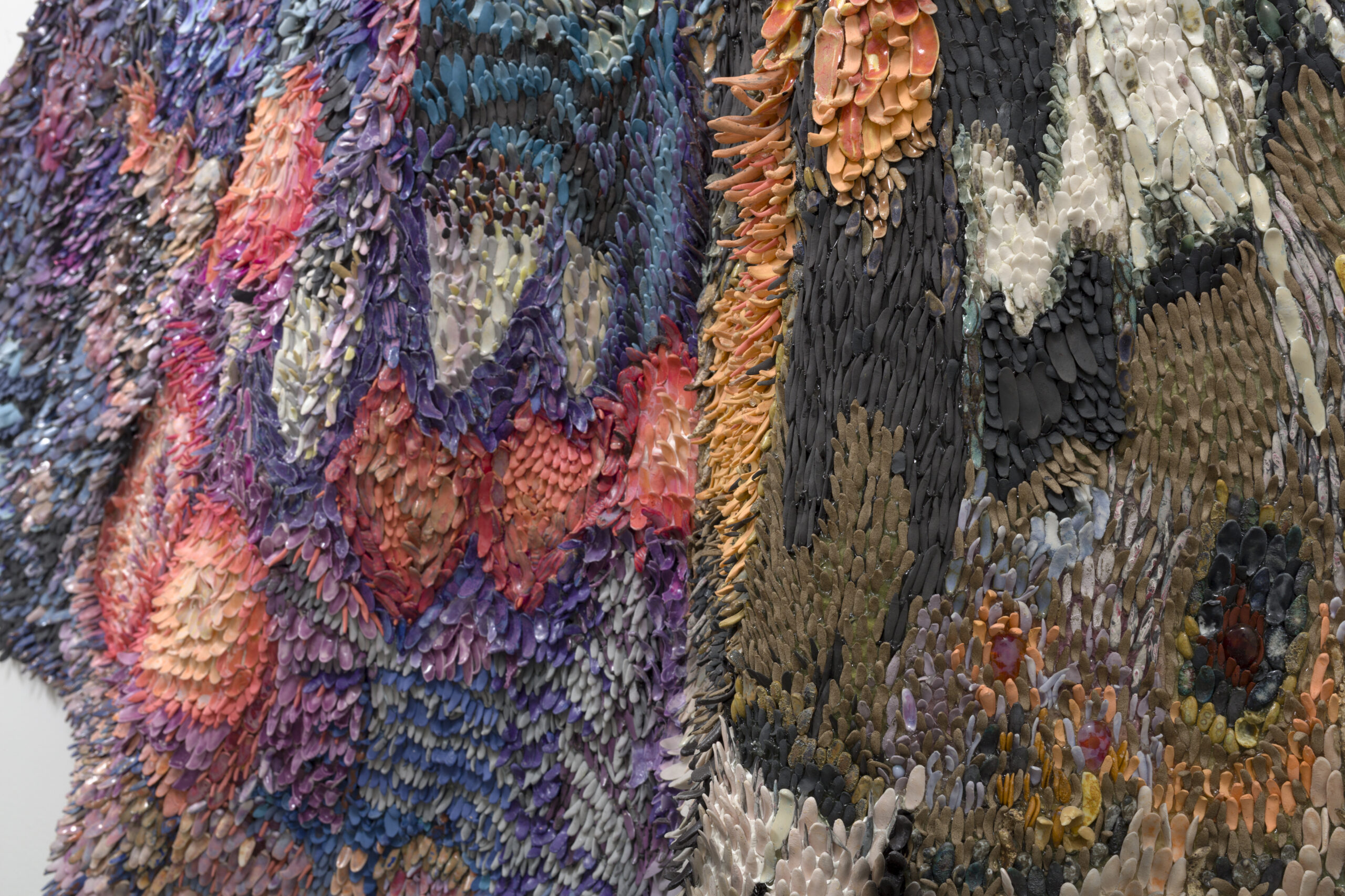 Purple Aurora (2025) by Rebecca Manson, a sweeping porcelain wall piece, magnifies butterfly wings into a tapestry of fragility and resilience.