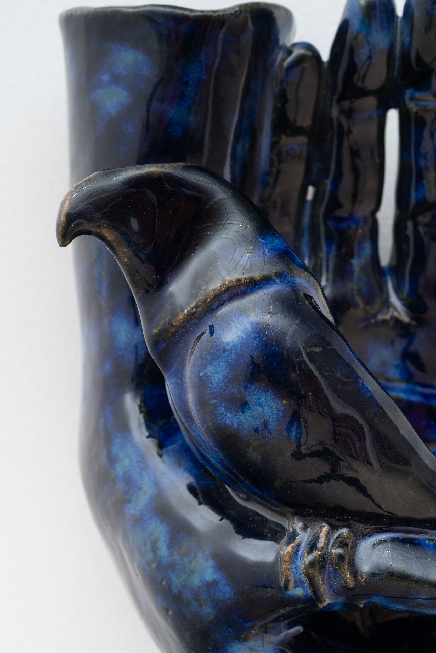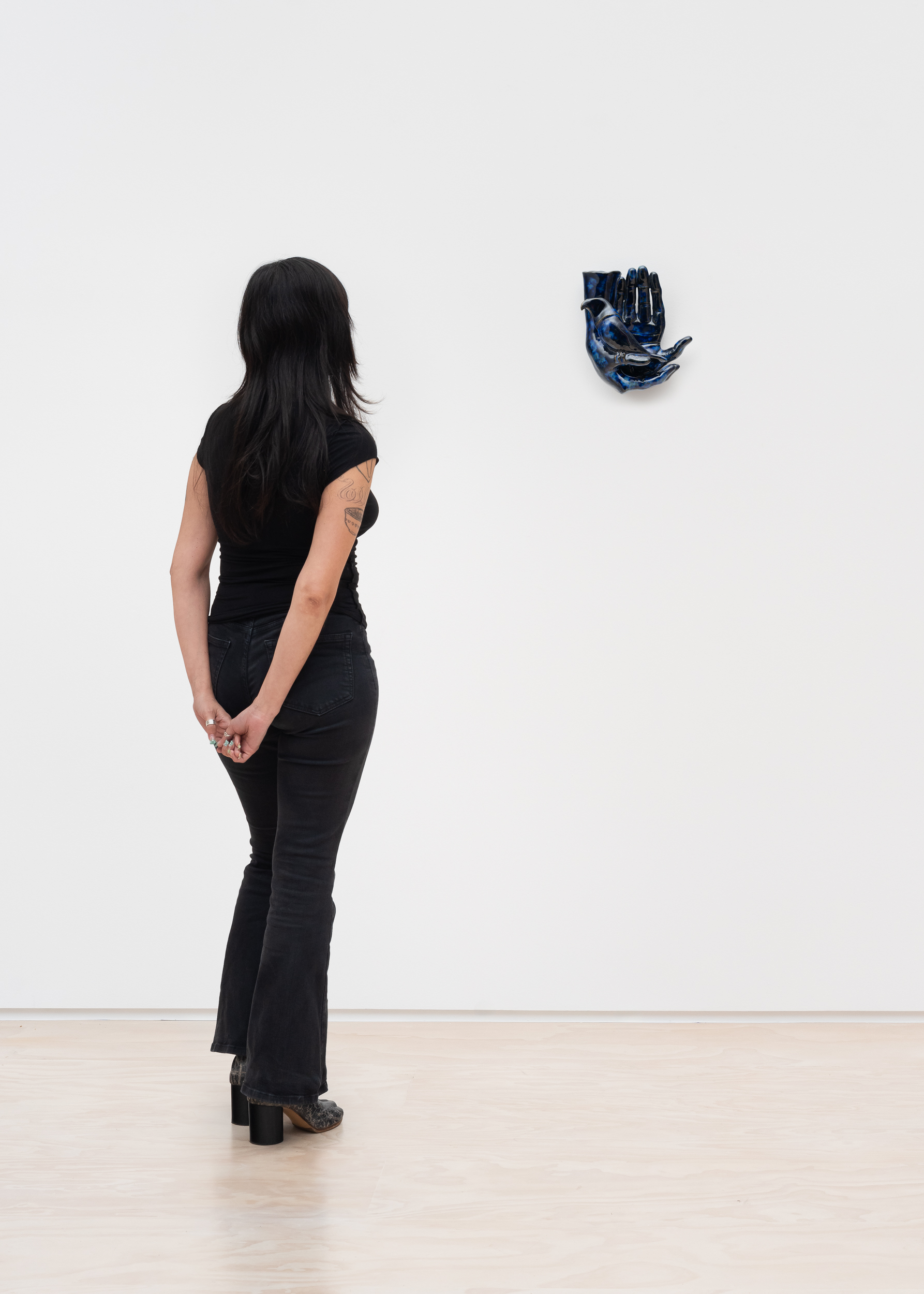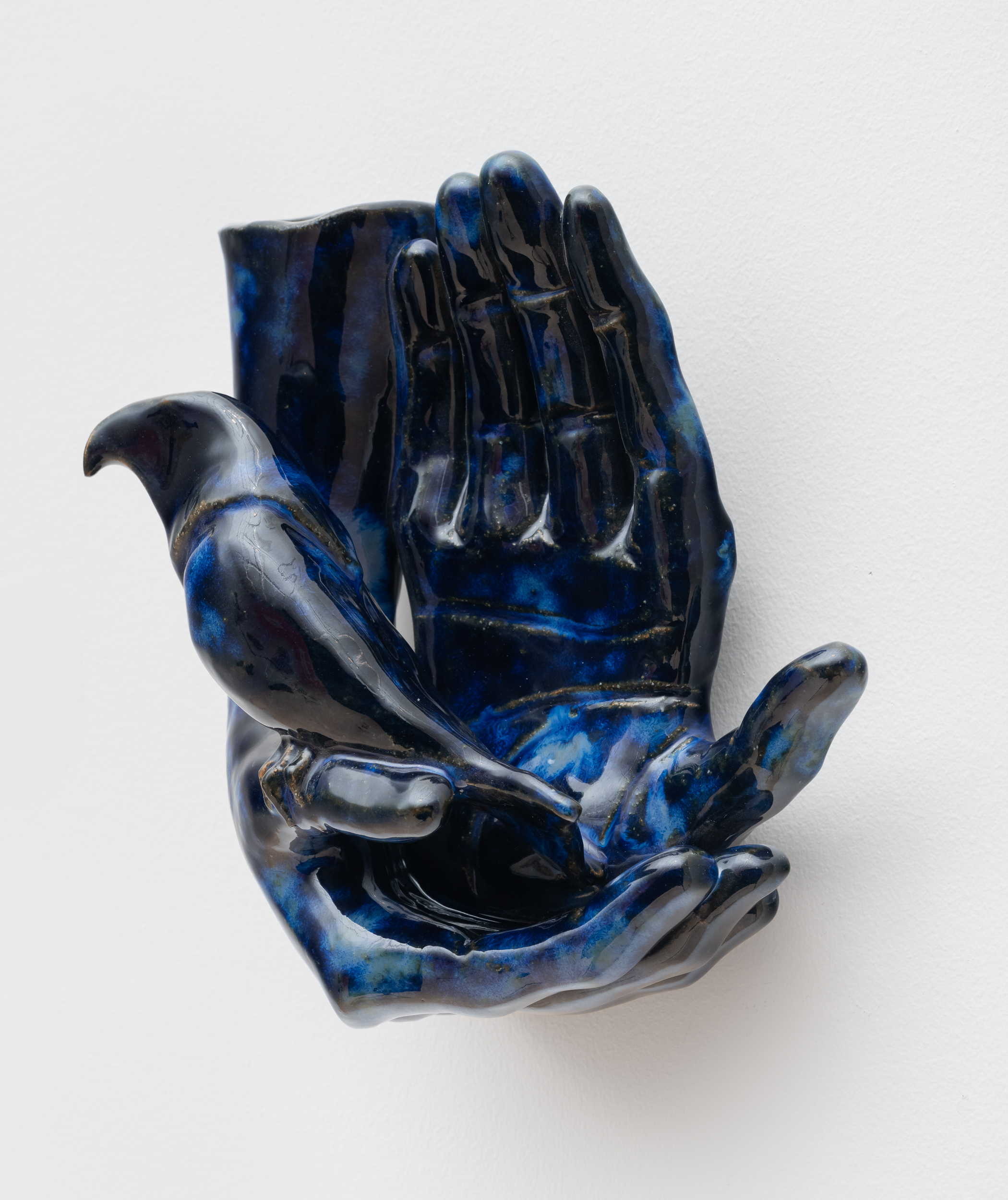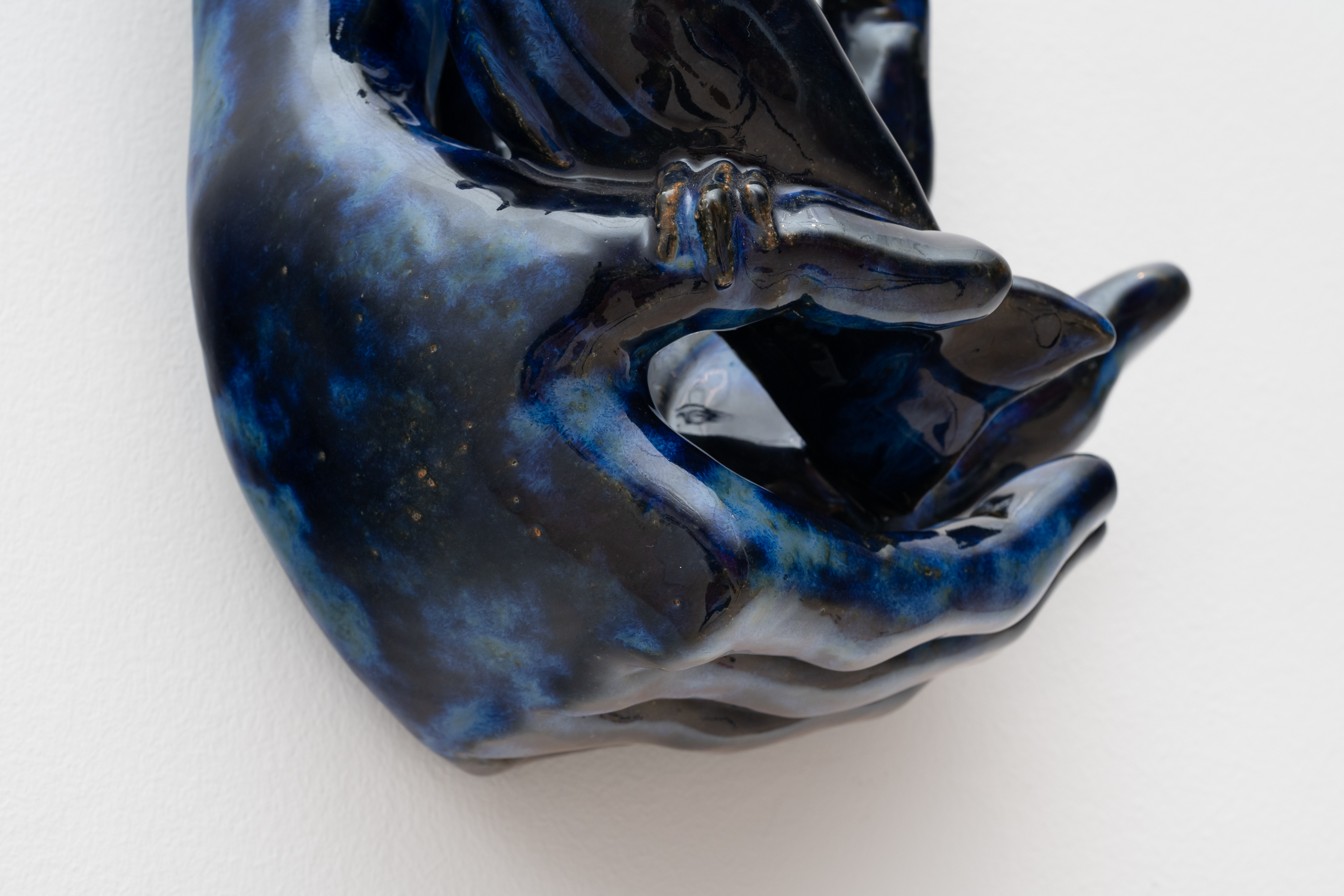 Purple Aurora (2025) by Rebecca Manson, a sweeping porcelain wall piece, magnifies butterfly wings into a tapestry of fragility and resilience.