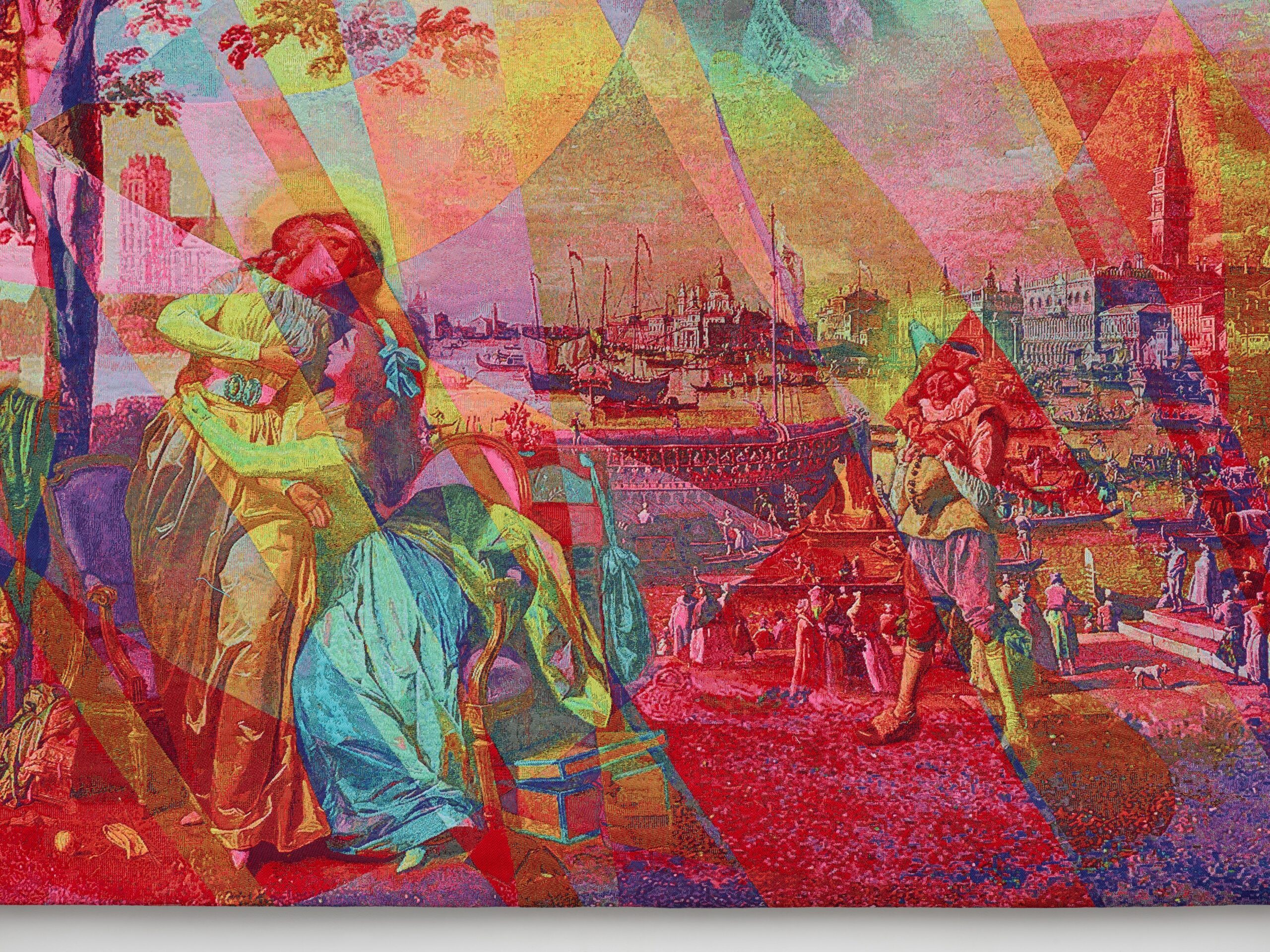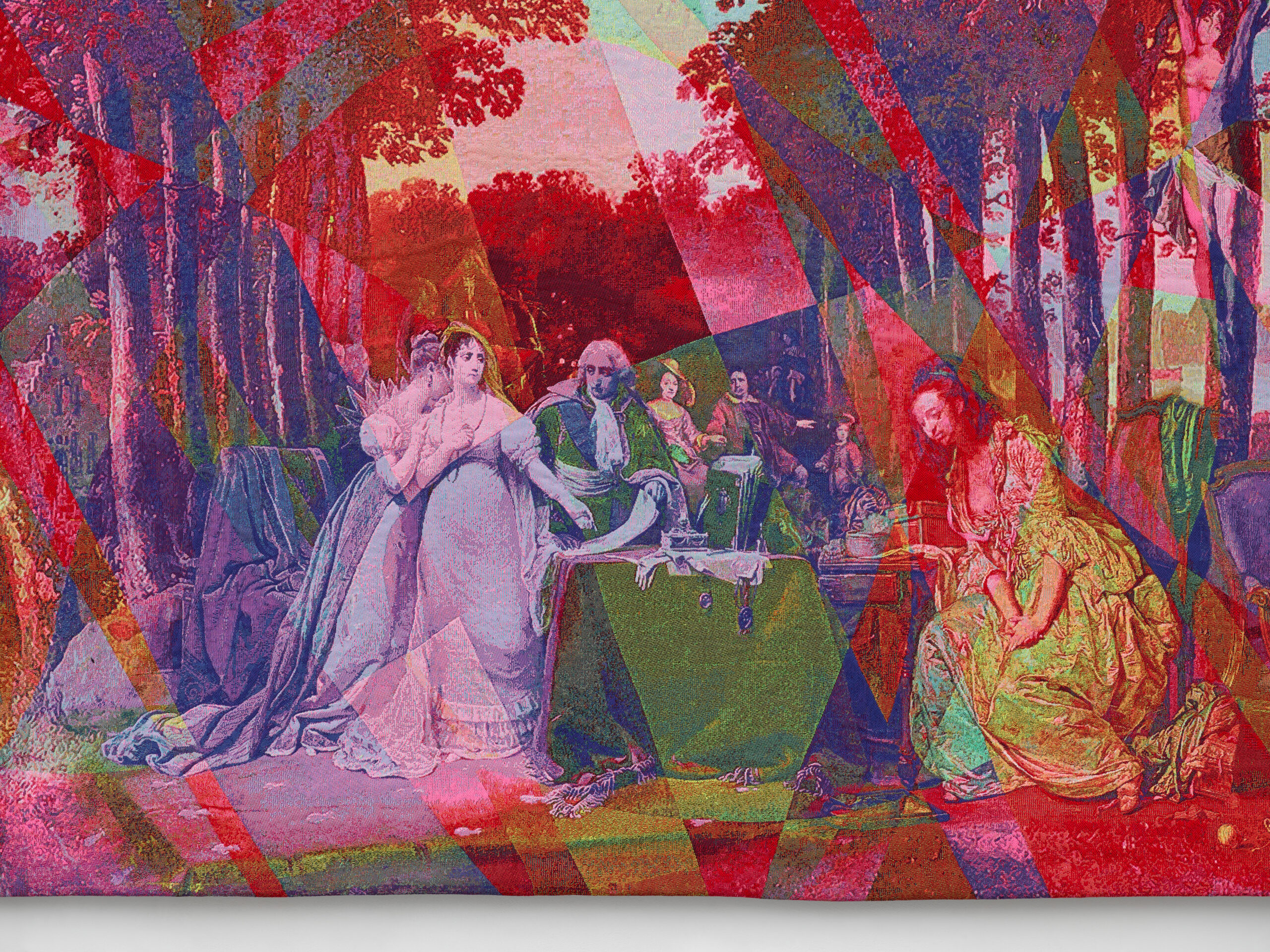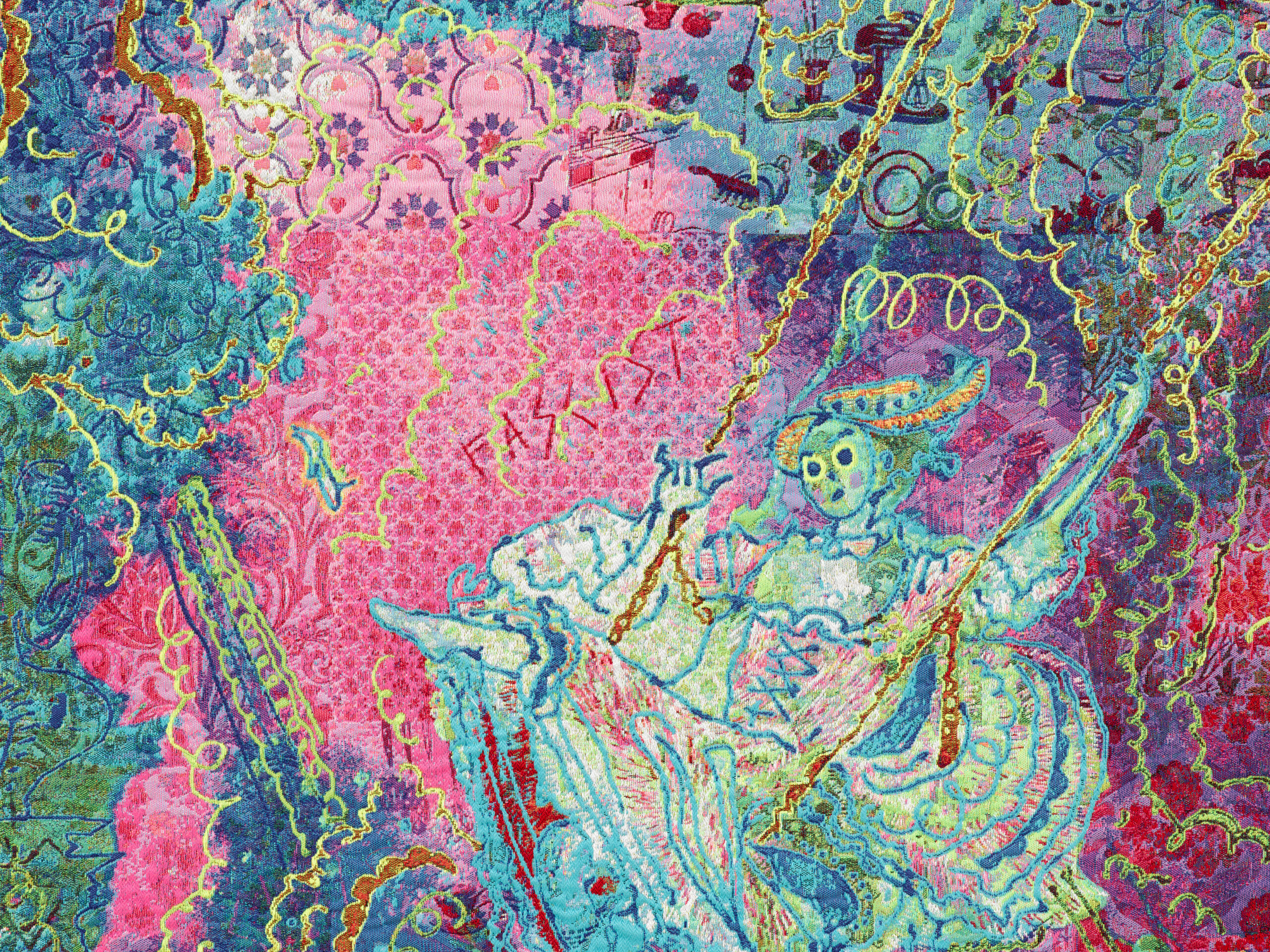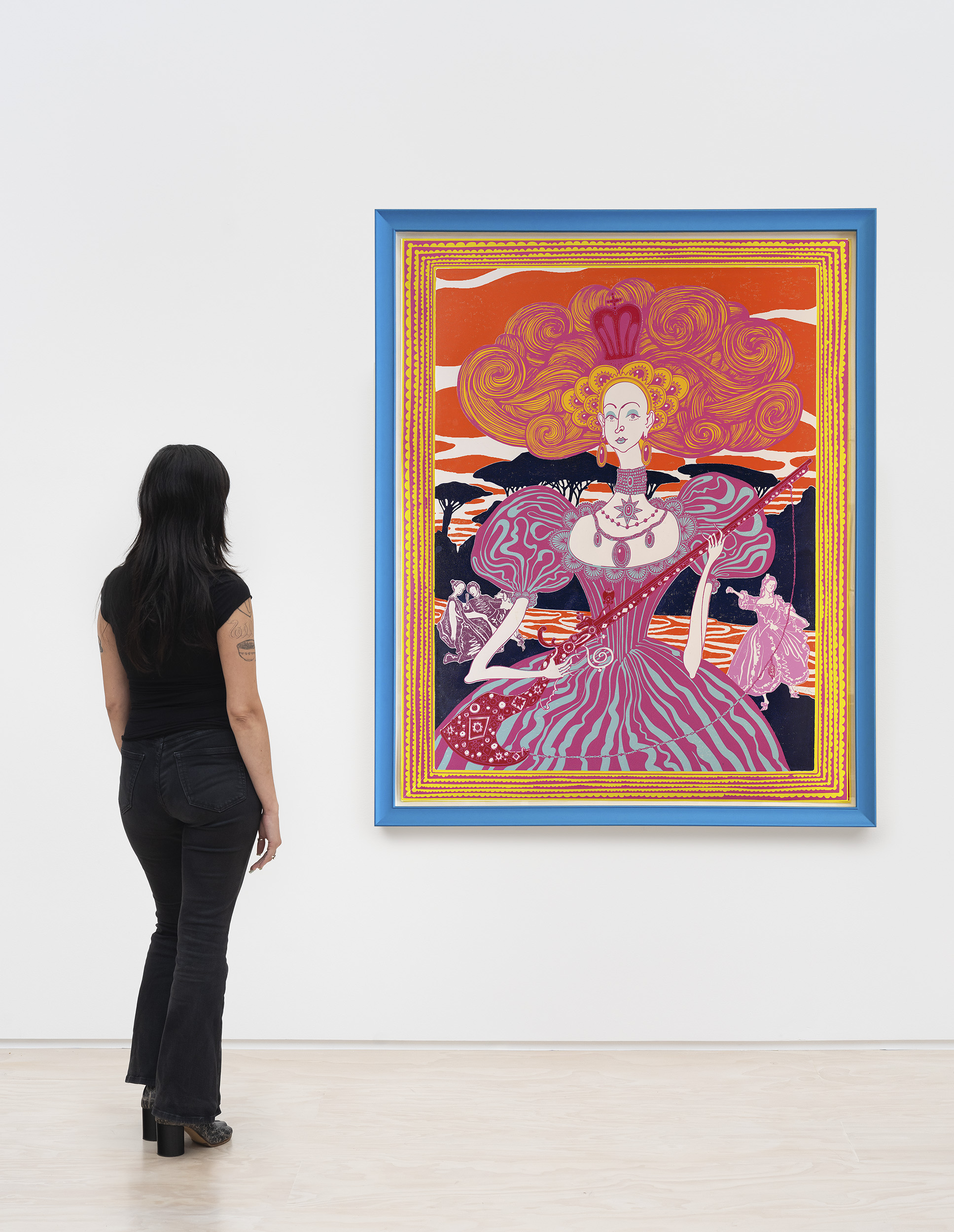 Fascist Swing (2024) is punk and painterly. Based on a freehand sketch of Fragonard’s famous eighteenth-century painting of the same name, the tapestry has the quality of a giant hand-embroidered piece, despite being woven on a Jacquard loom. The empty expletive “fascist” is scrawled in the pink void beside the frilly skirt of the swinger. Finally, The Honourable Millicent Wallace (orange/pink) (2024), a woodcut portrait, offers an over-the-top portrayal of female power: the crowned protagonist wears a taffeta dress and clasps an ornate red rifle.