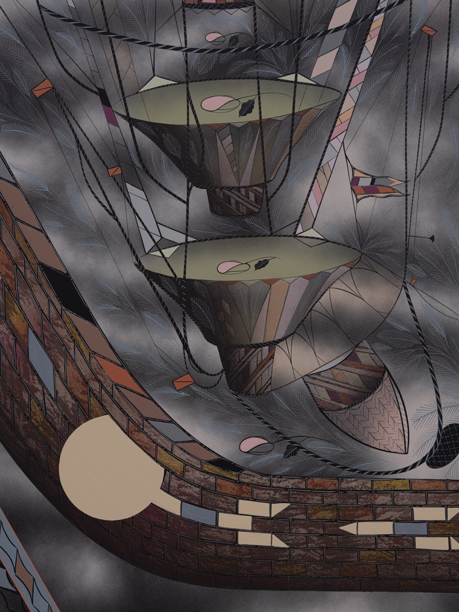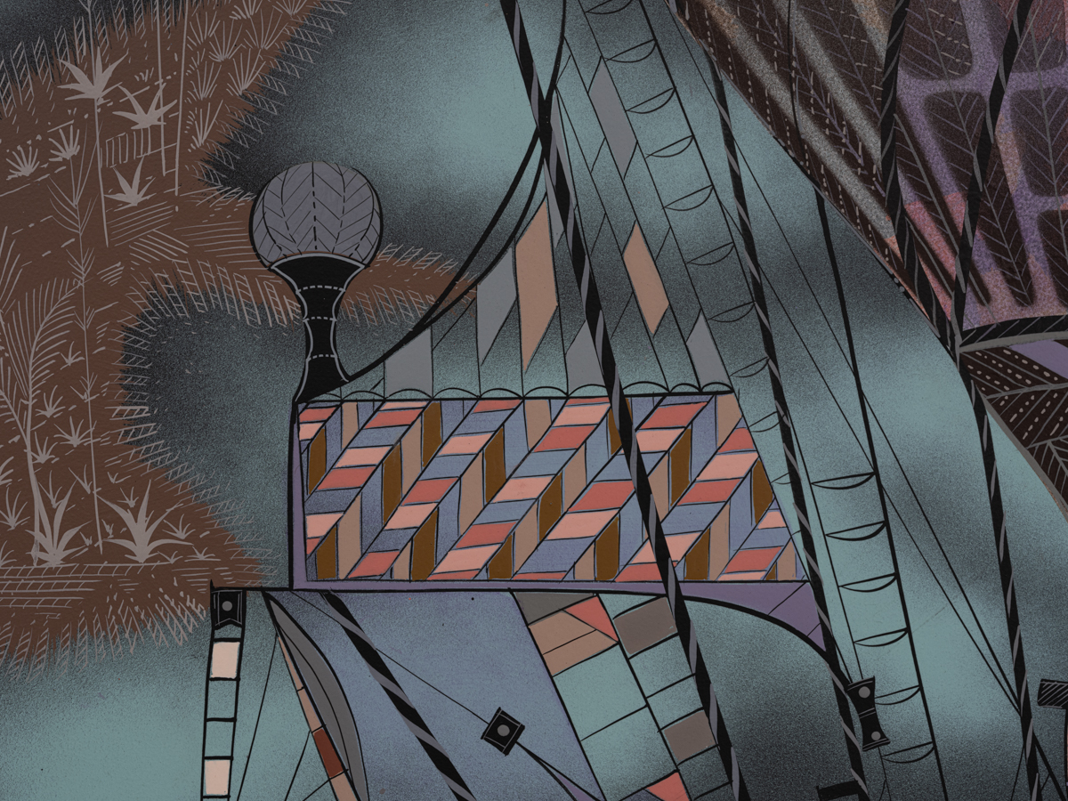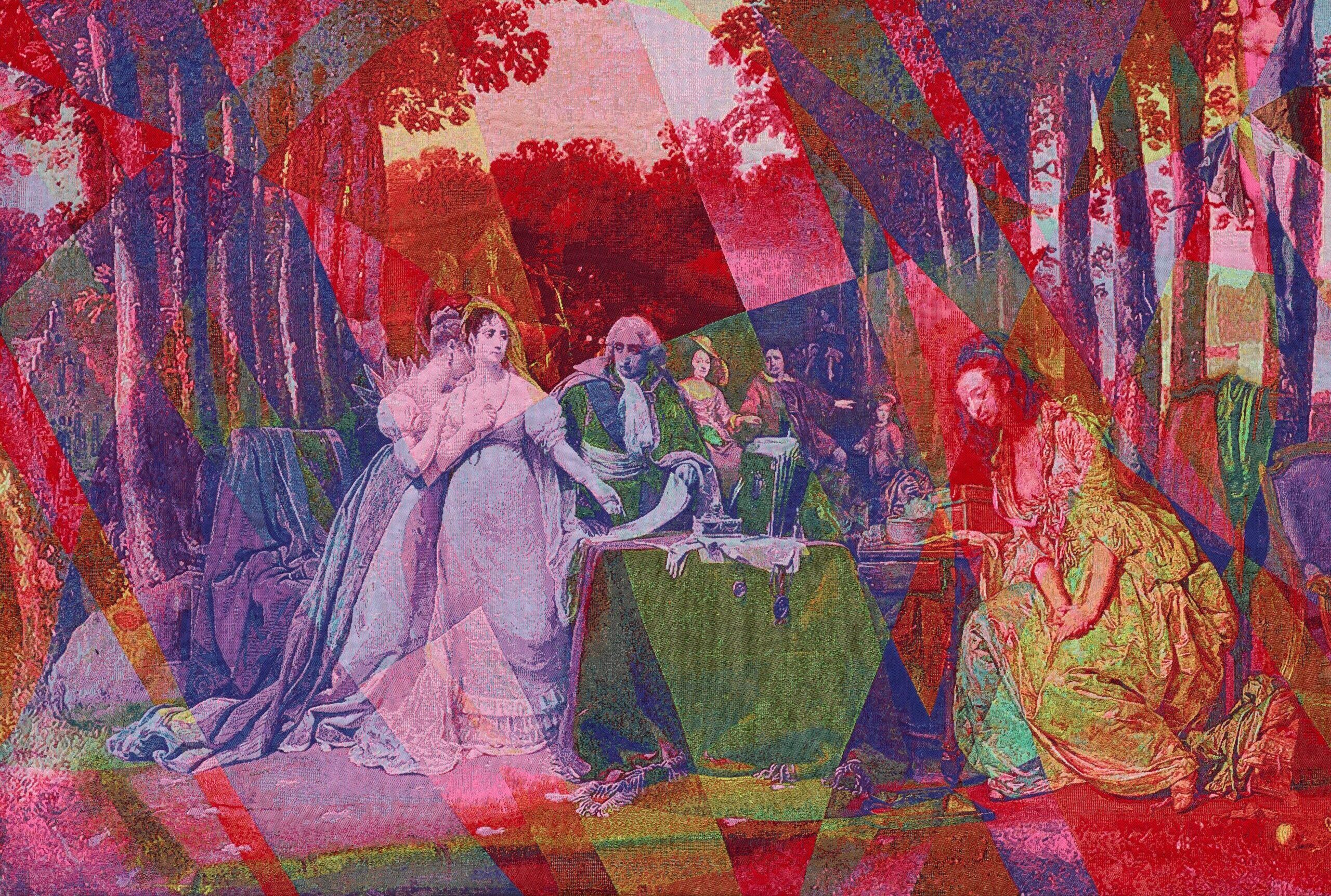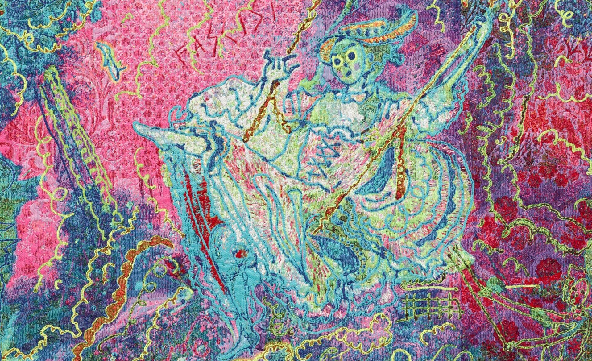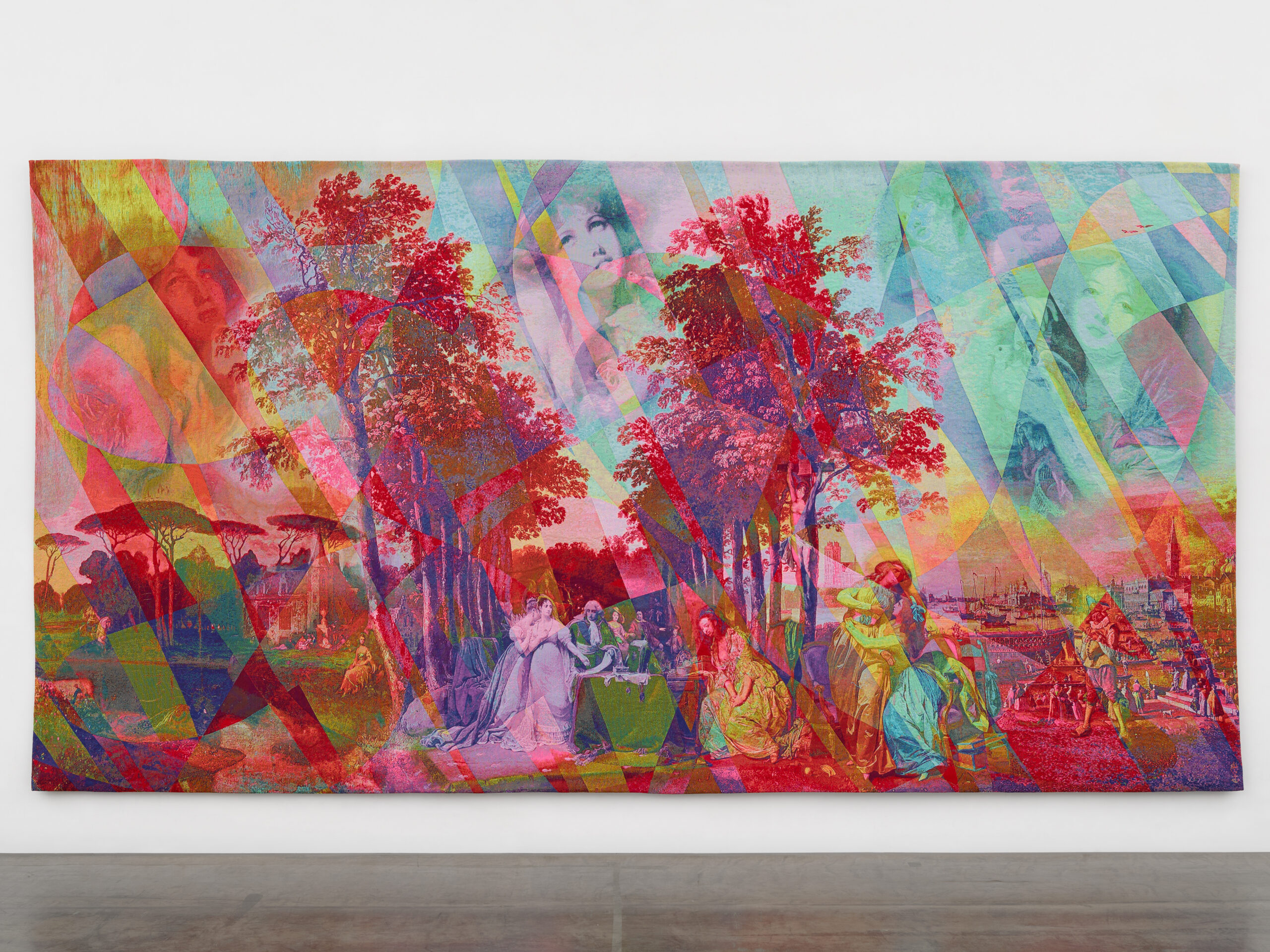 Fascist Swing (2024) is punk and painterly. Based on a freehand sketch of Fragonard’s famous eighteenth-century painting of the same name, the tapestry has the quality of a giant hand-embroidered piece, despite being woven on a Jacquard loom. The empty expletive “fascist” is scrawled in the pink void beside the frilly skirt of the swinger. Finally, The Honourable Millicent Wallace (orange/pink) (2024), a woodcut portrait, offers an over-the-top portrayal of female power: the crowned protagonist wears a taffeta dress and clasps an ornate red rifle.
