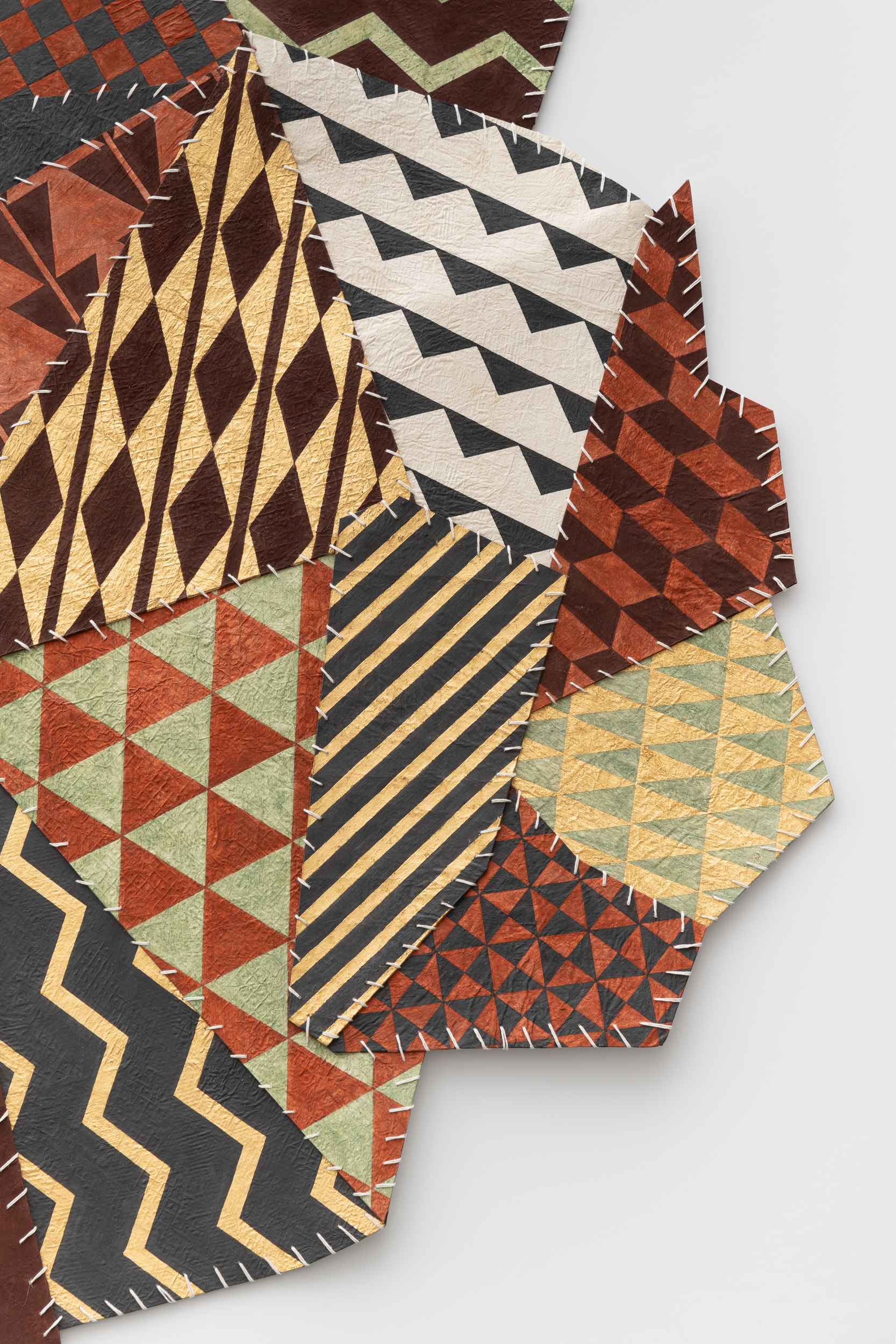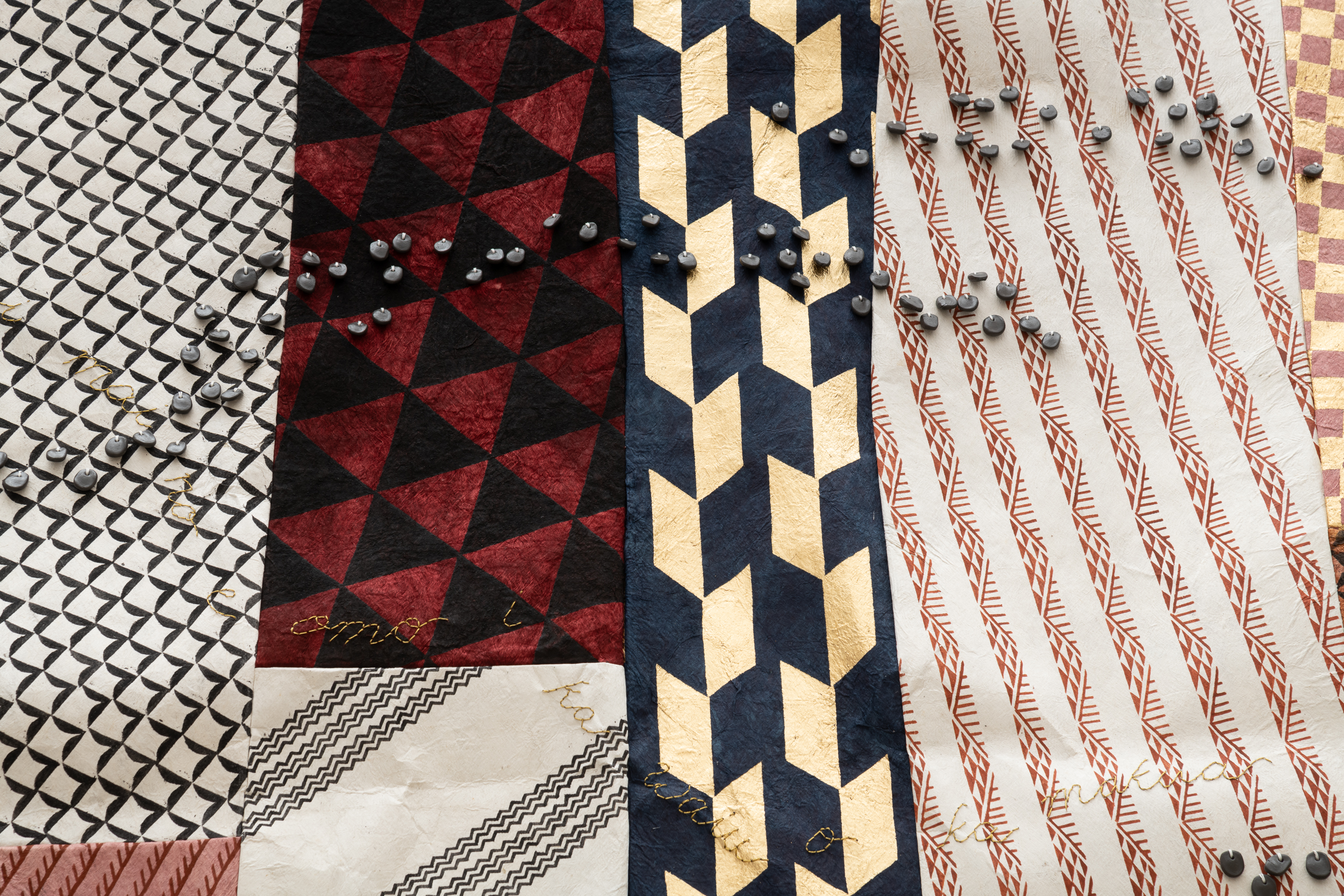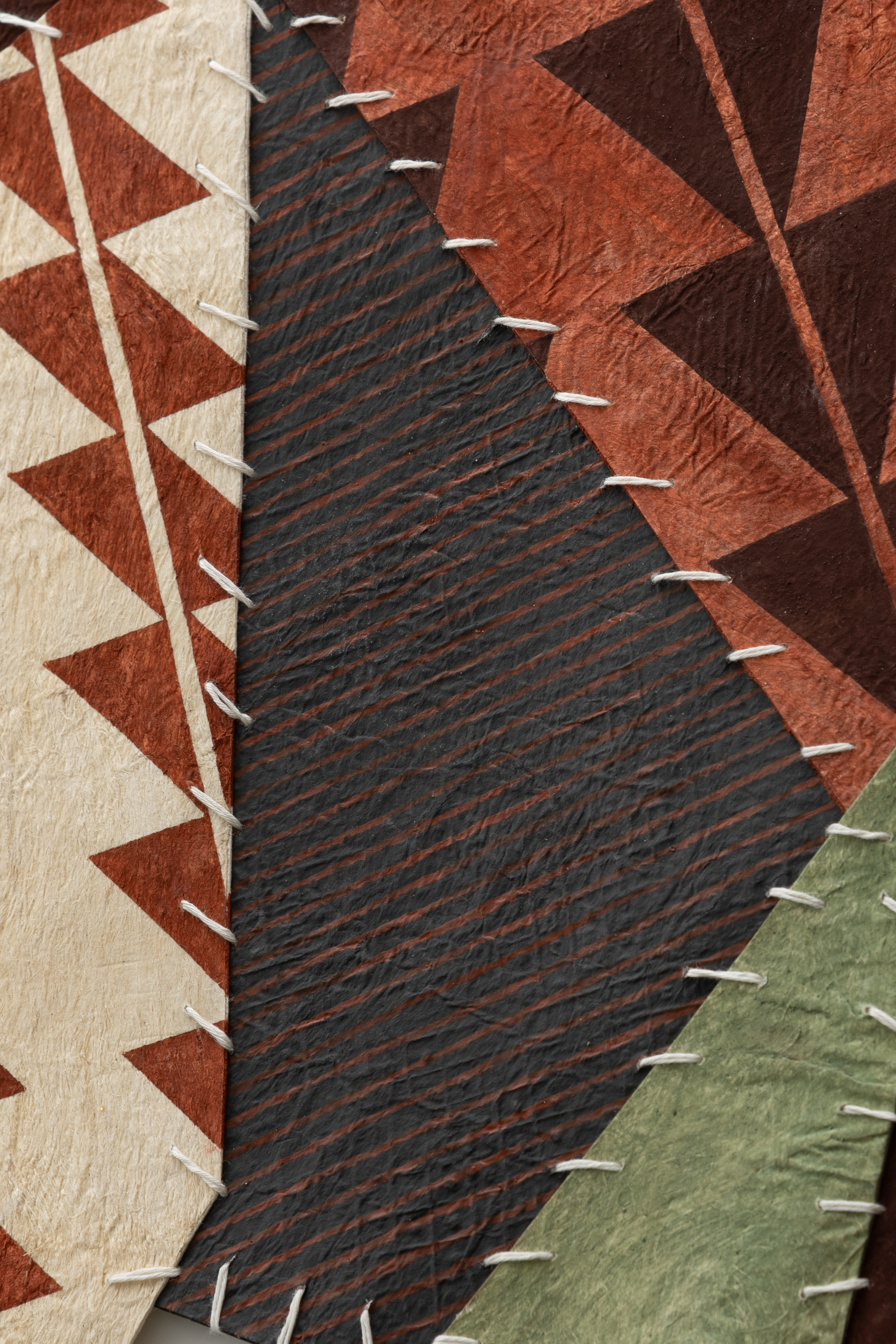 Earth pigments, wildfire charcoal, metal leaf, cotton thread, ceramic beads, and kapa (barkcloth)