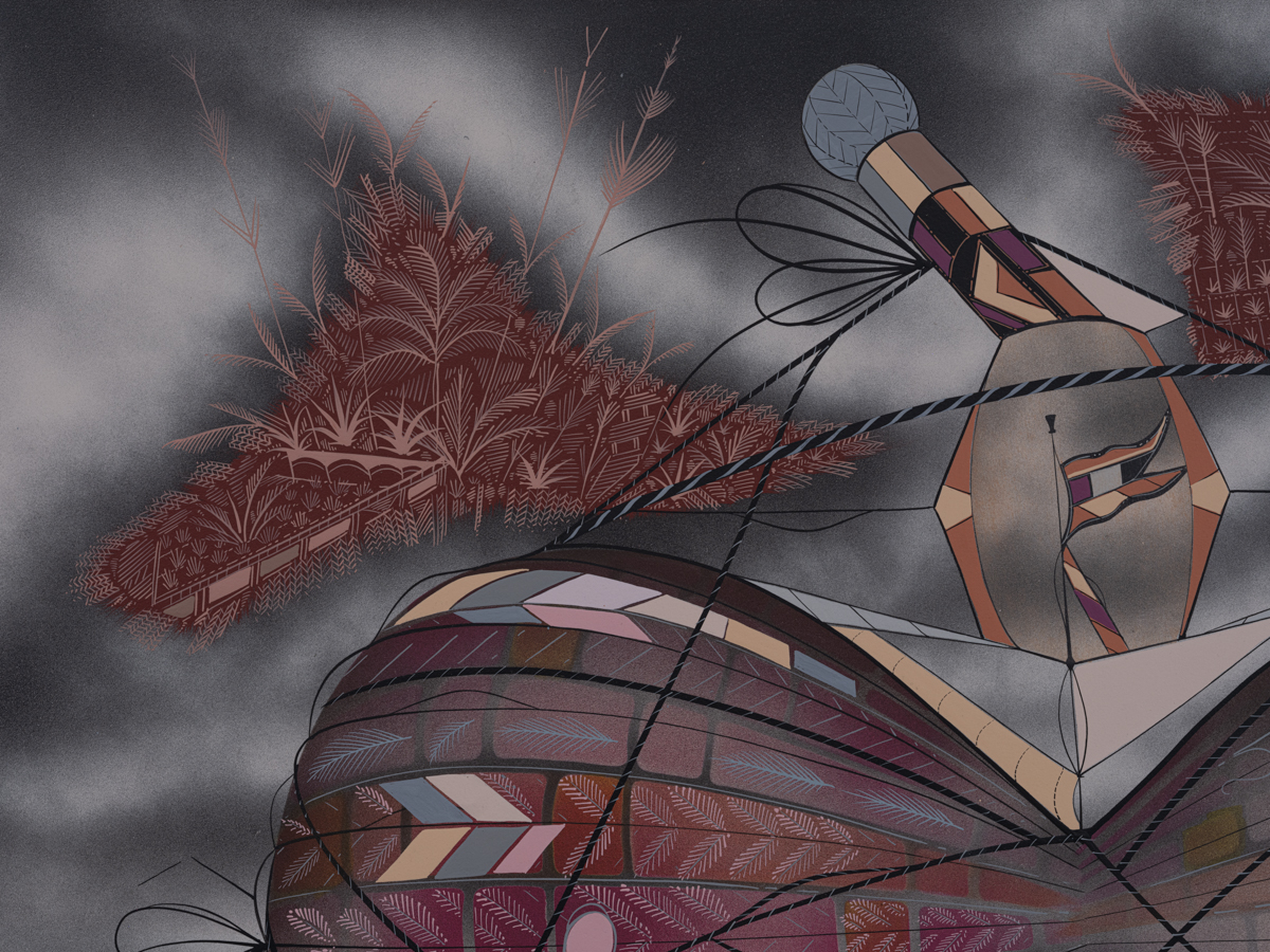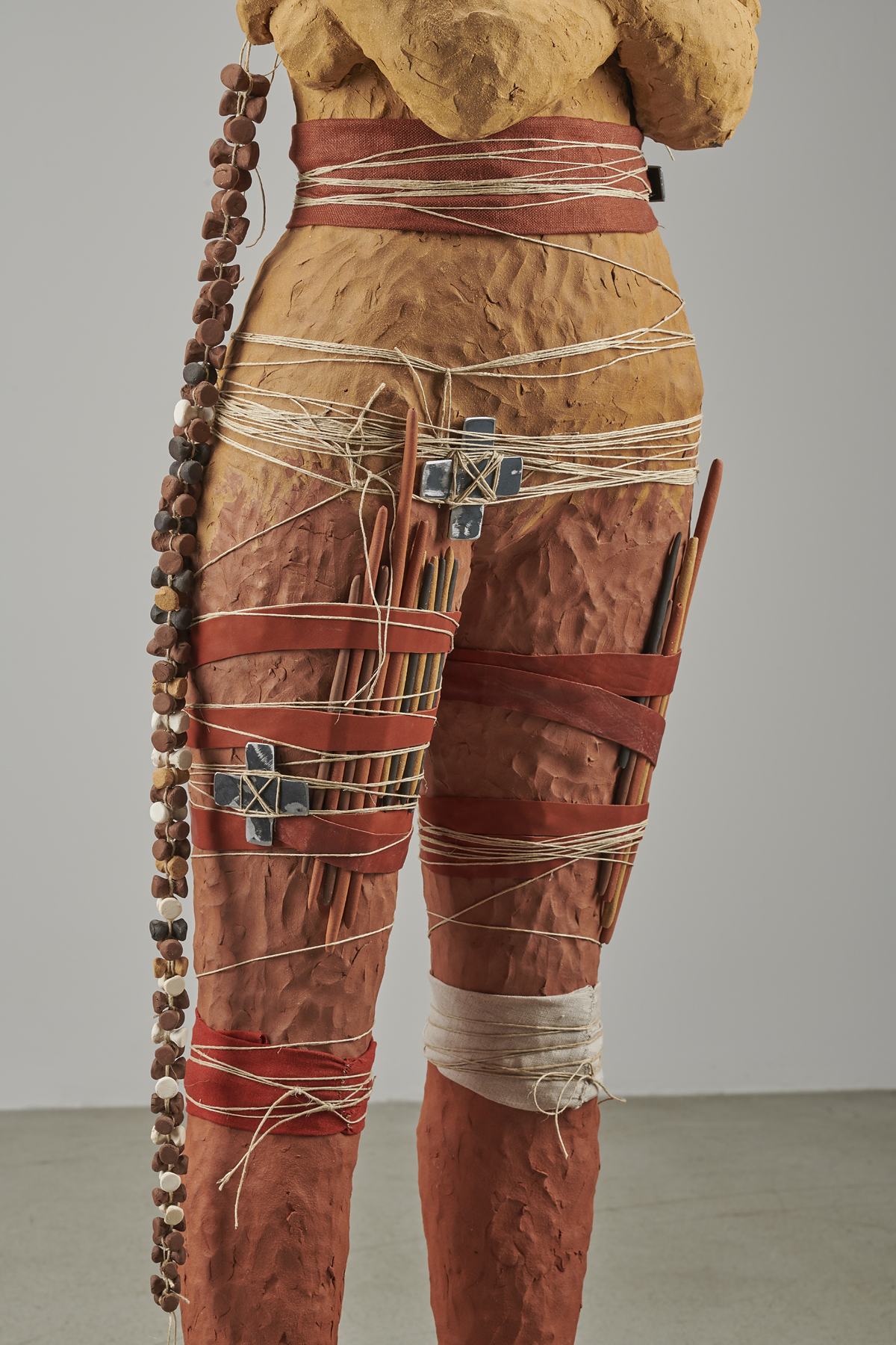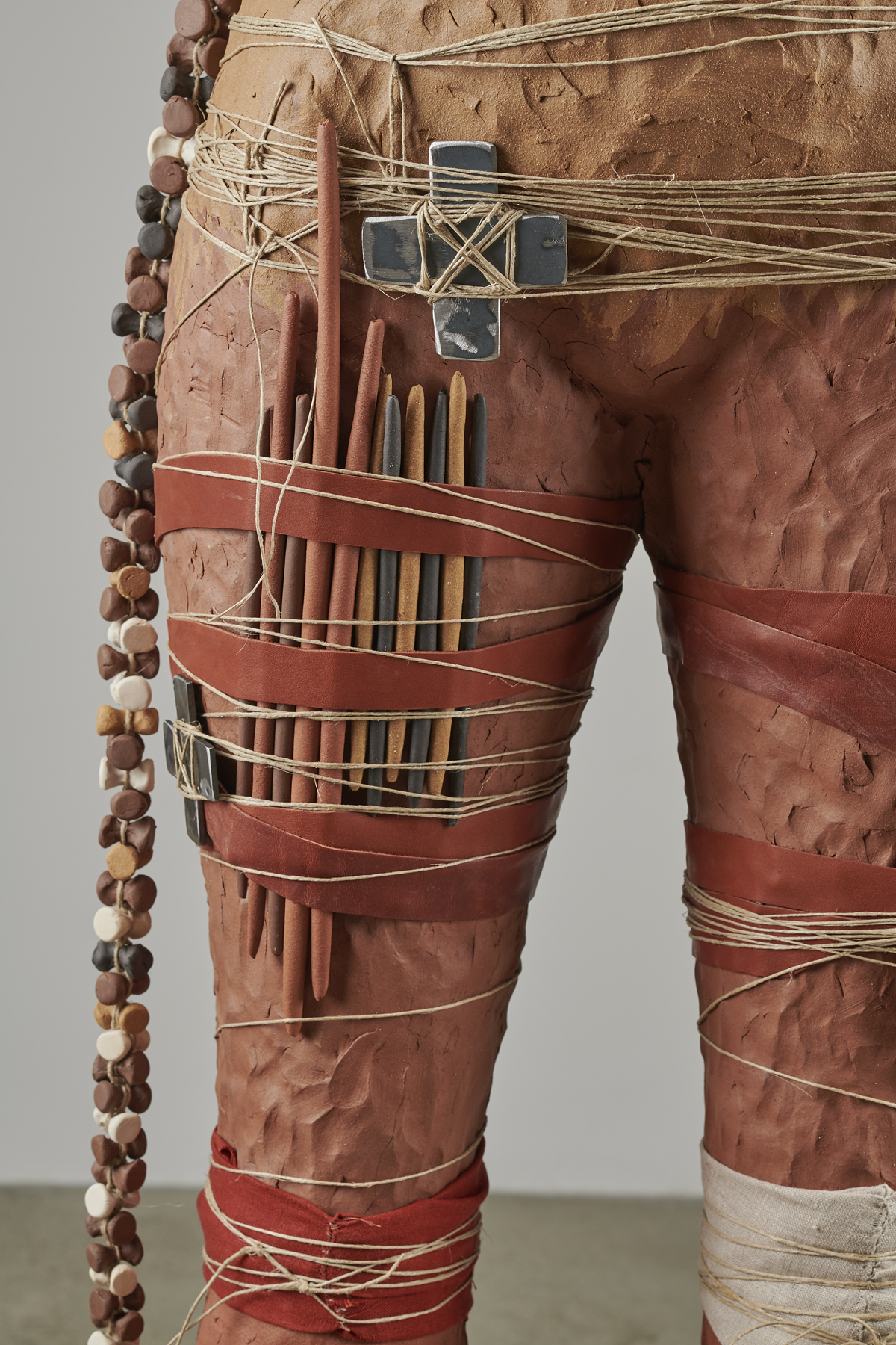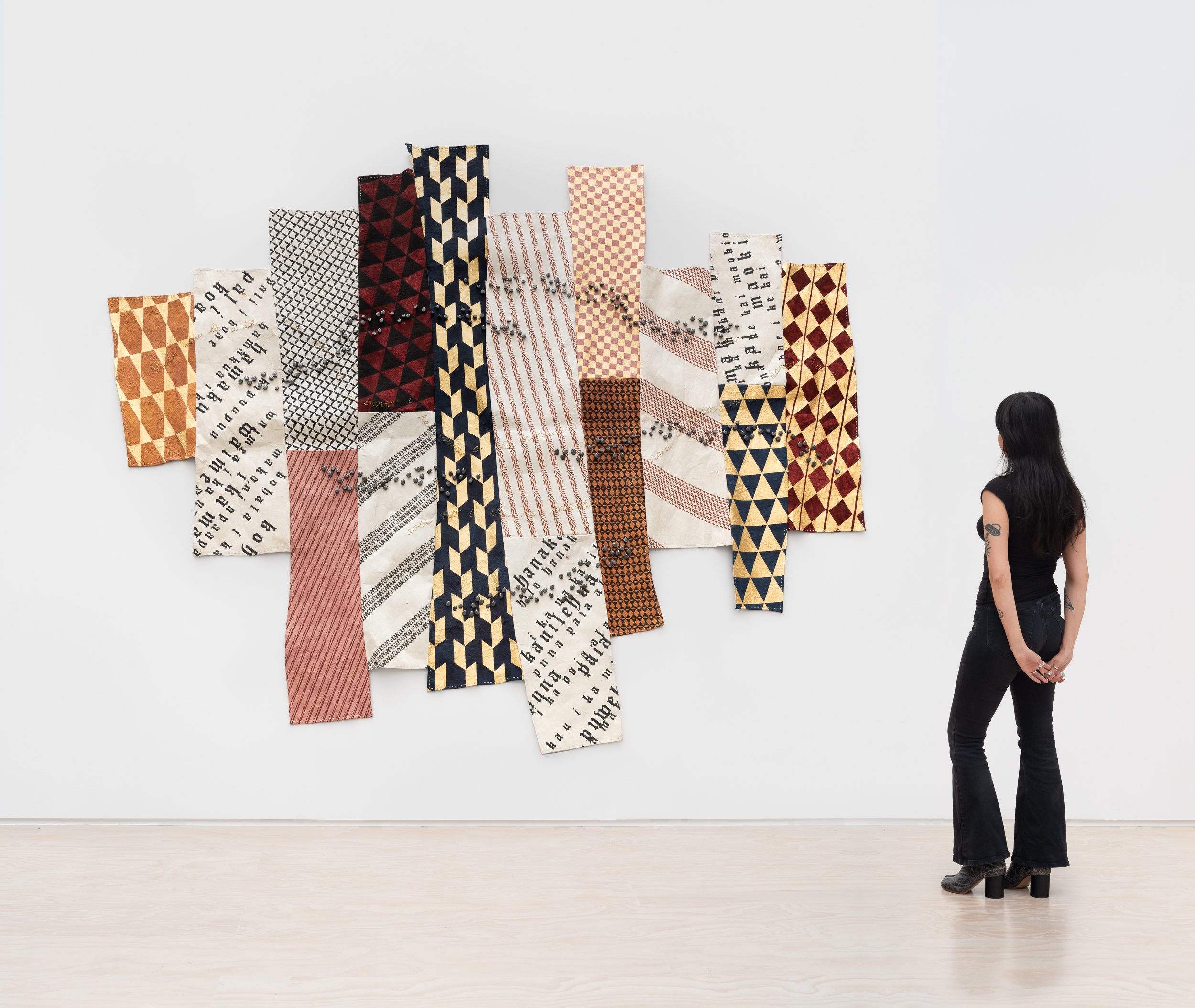 Earth pigments, wildfire charcoal, metal leaf, cotton thread, ceramic beads, and kapa (barkcloth)