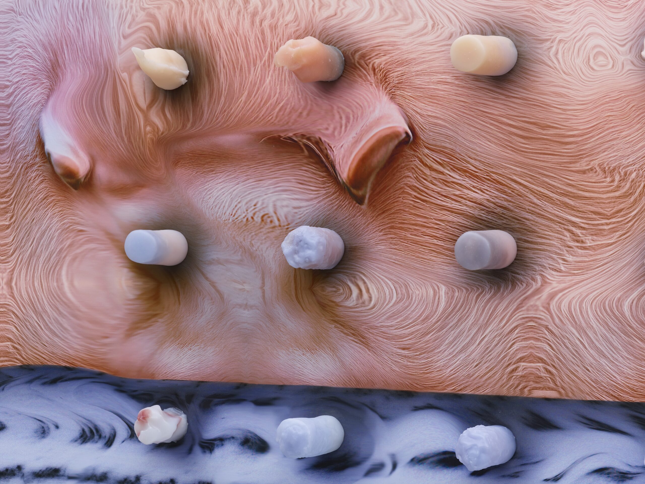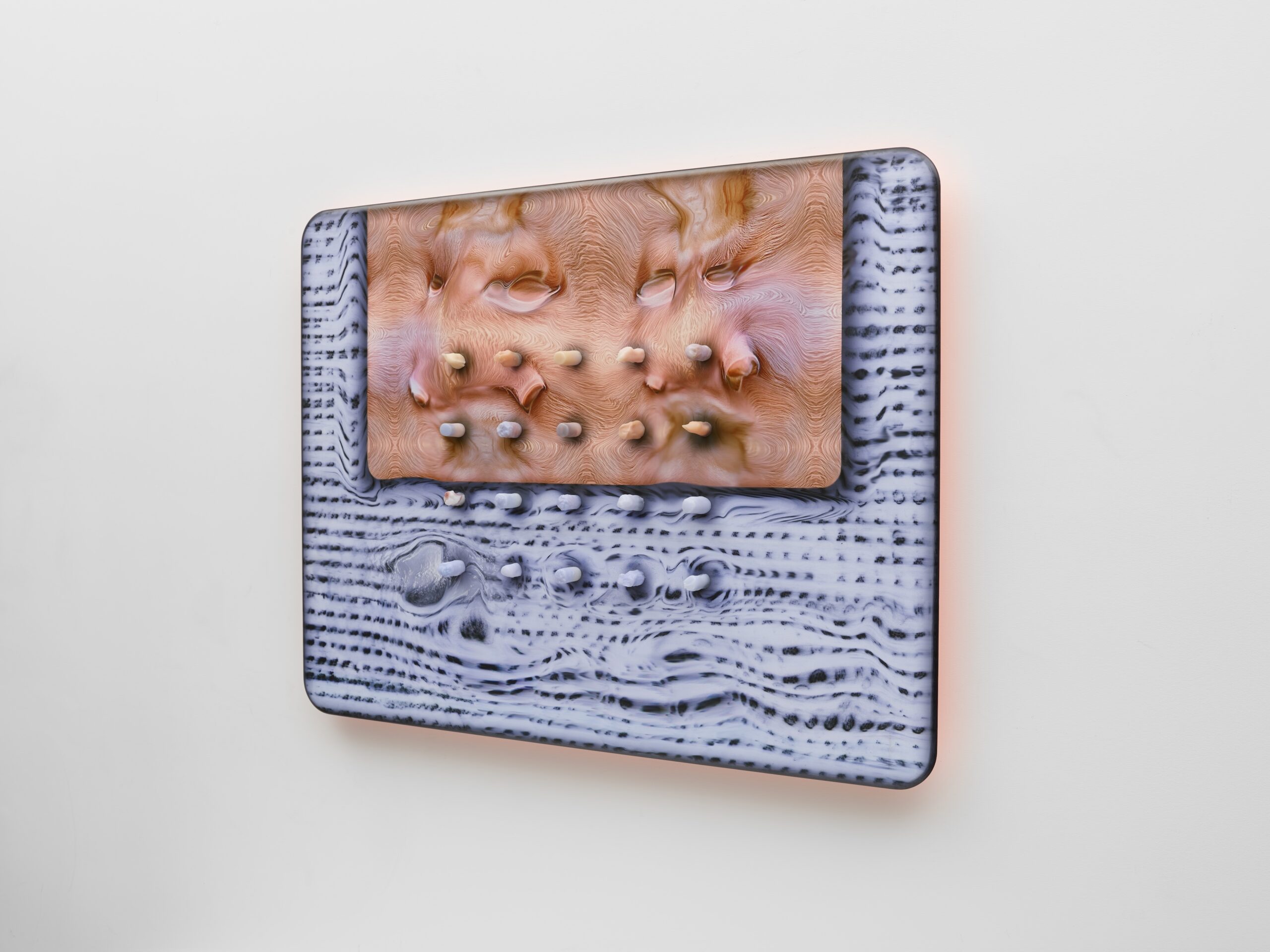 UV-print, silicone, ink, acrylic, and stainless steel on wood