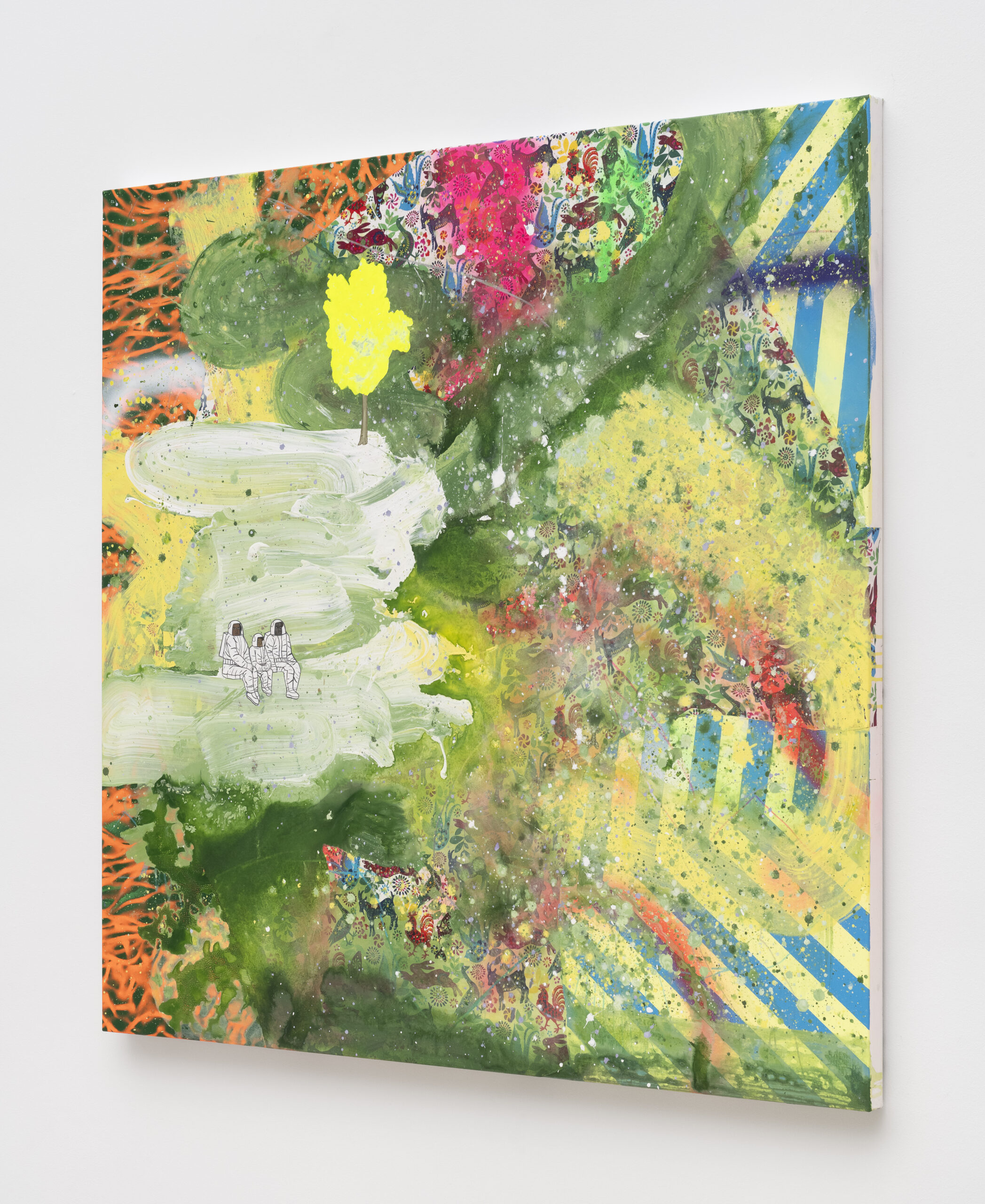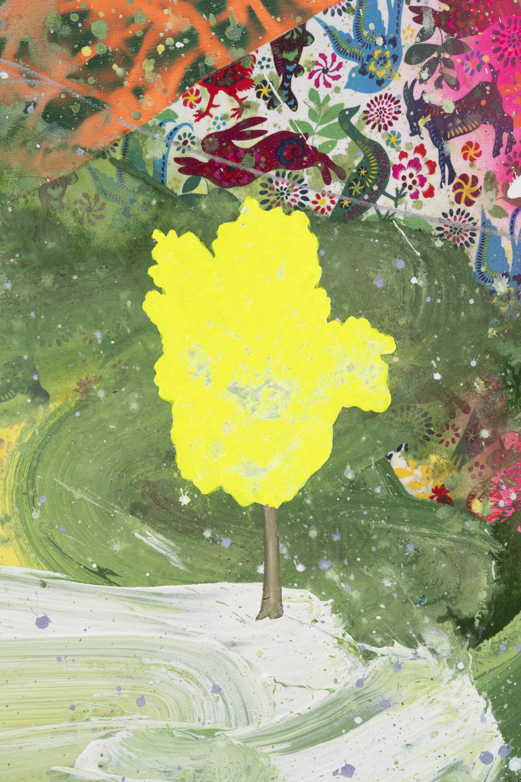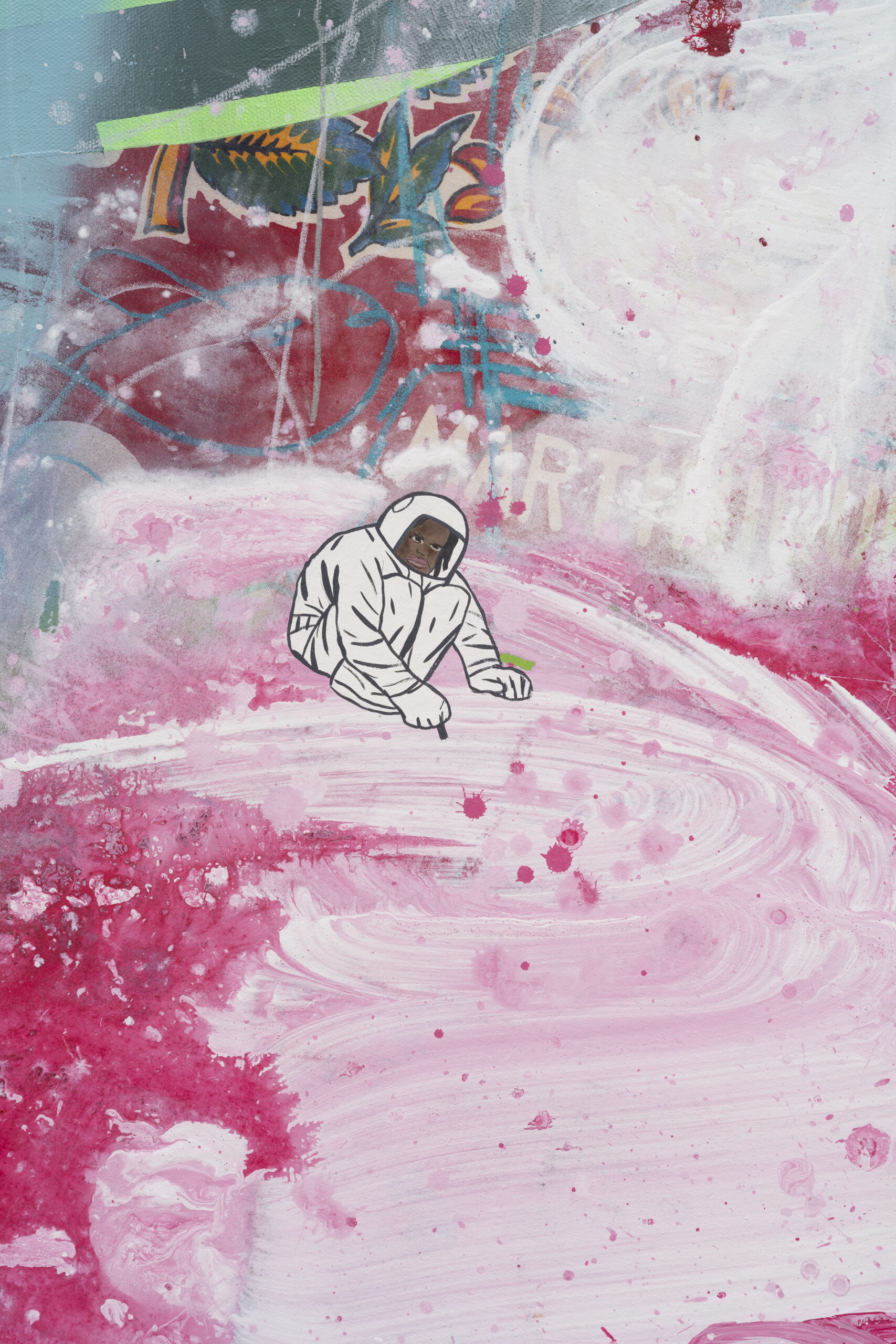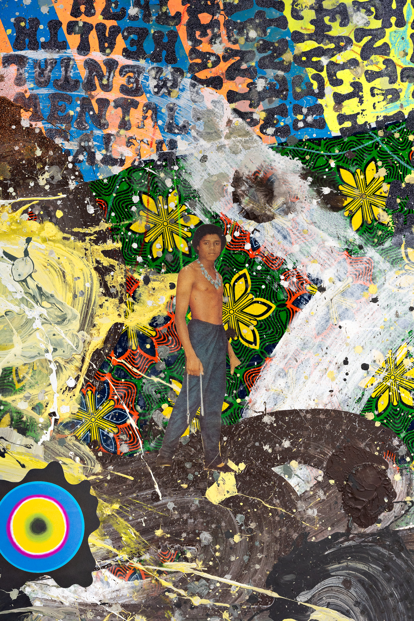 Acrylic, gouache, fabric, spray paint, color pencil, and photo collage on canvas