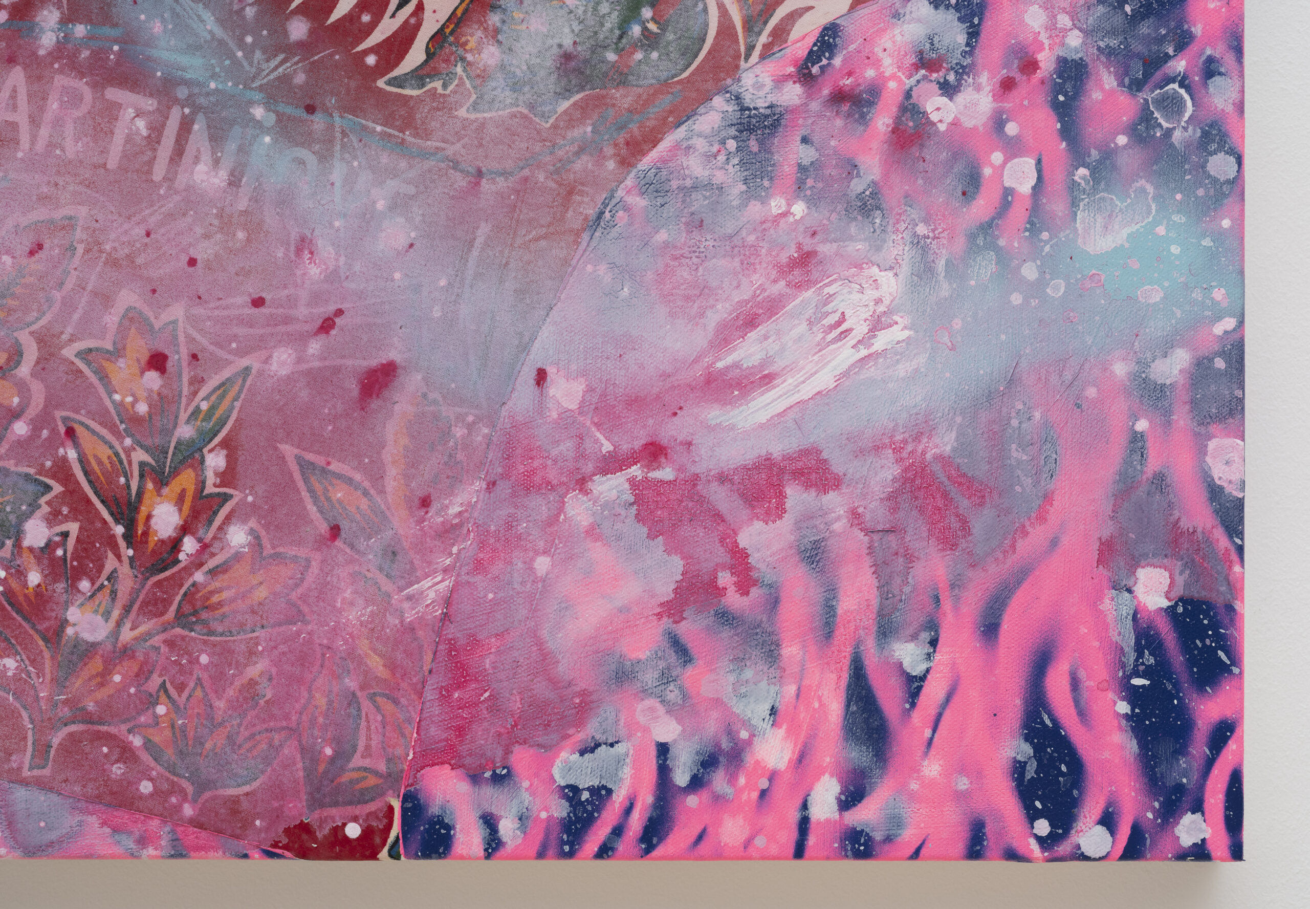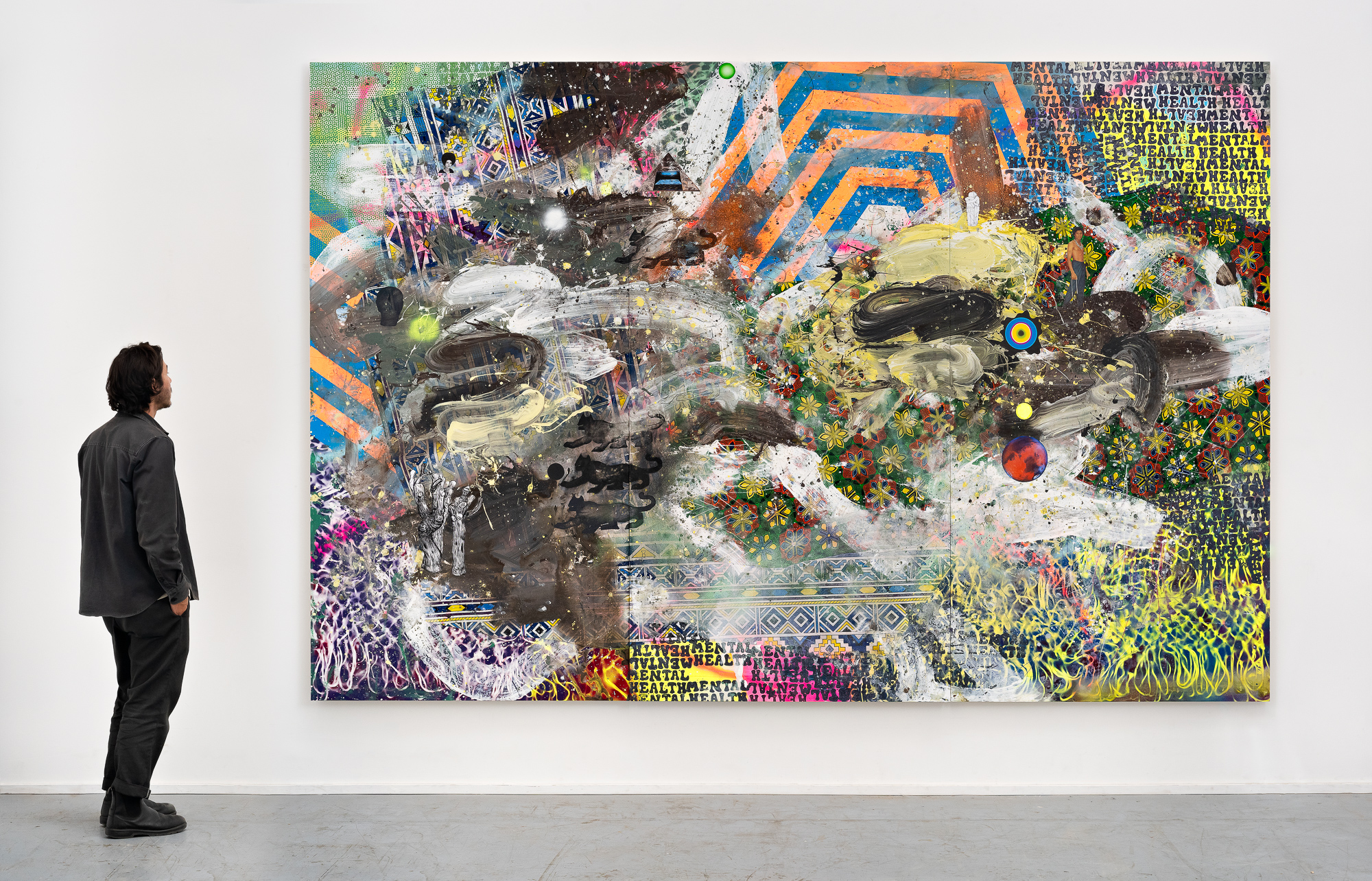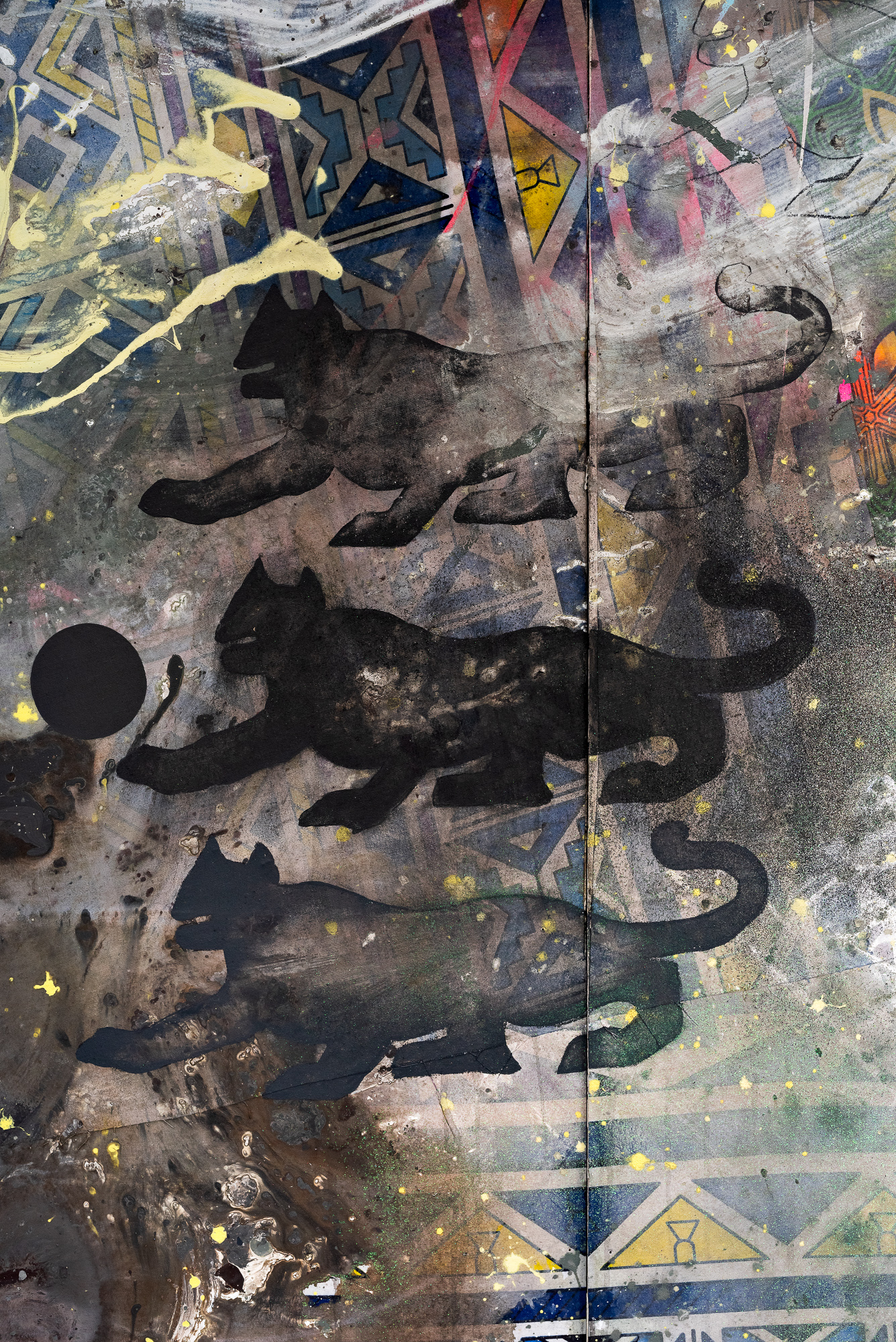 Acrylic, gouache, fabric, spray paint, color pencil, and photo collage on canvas