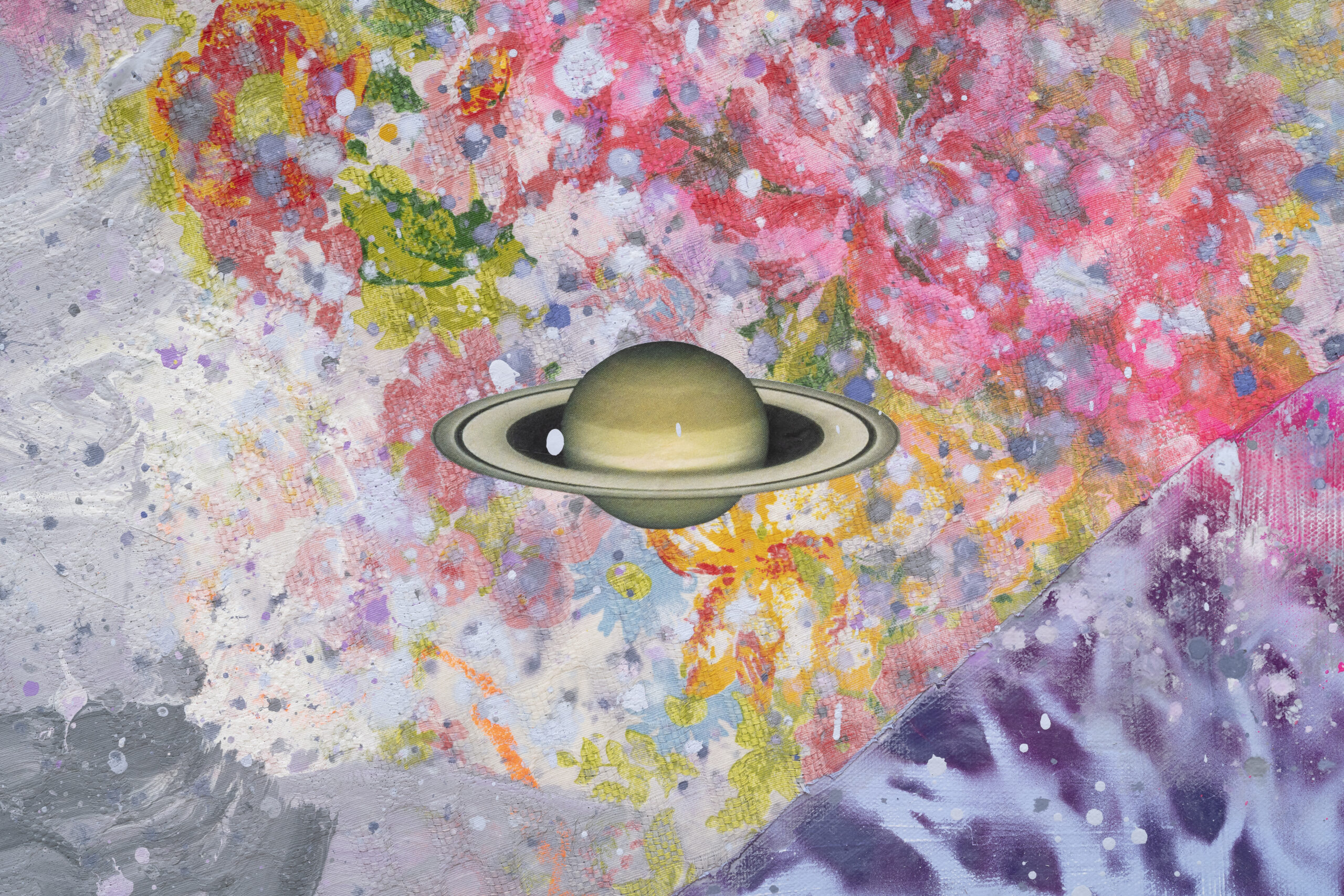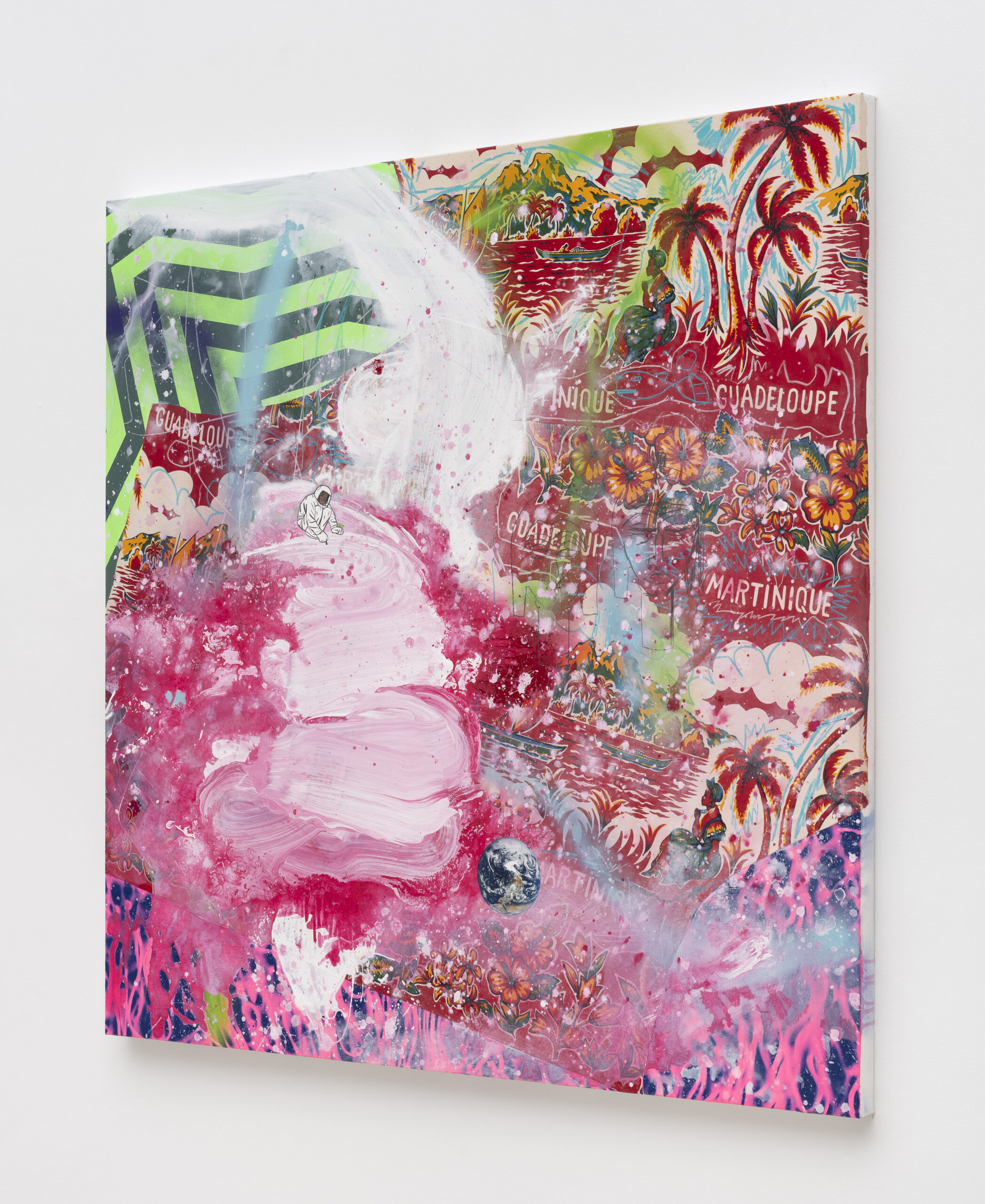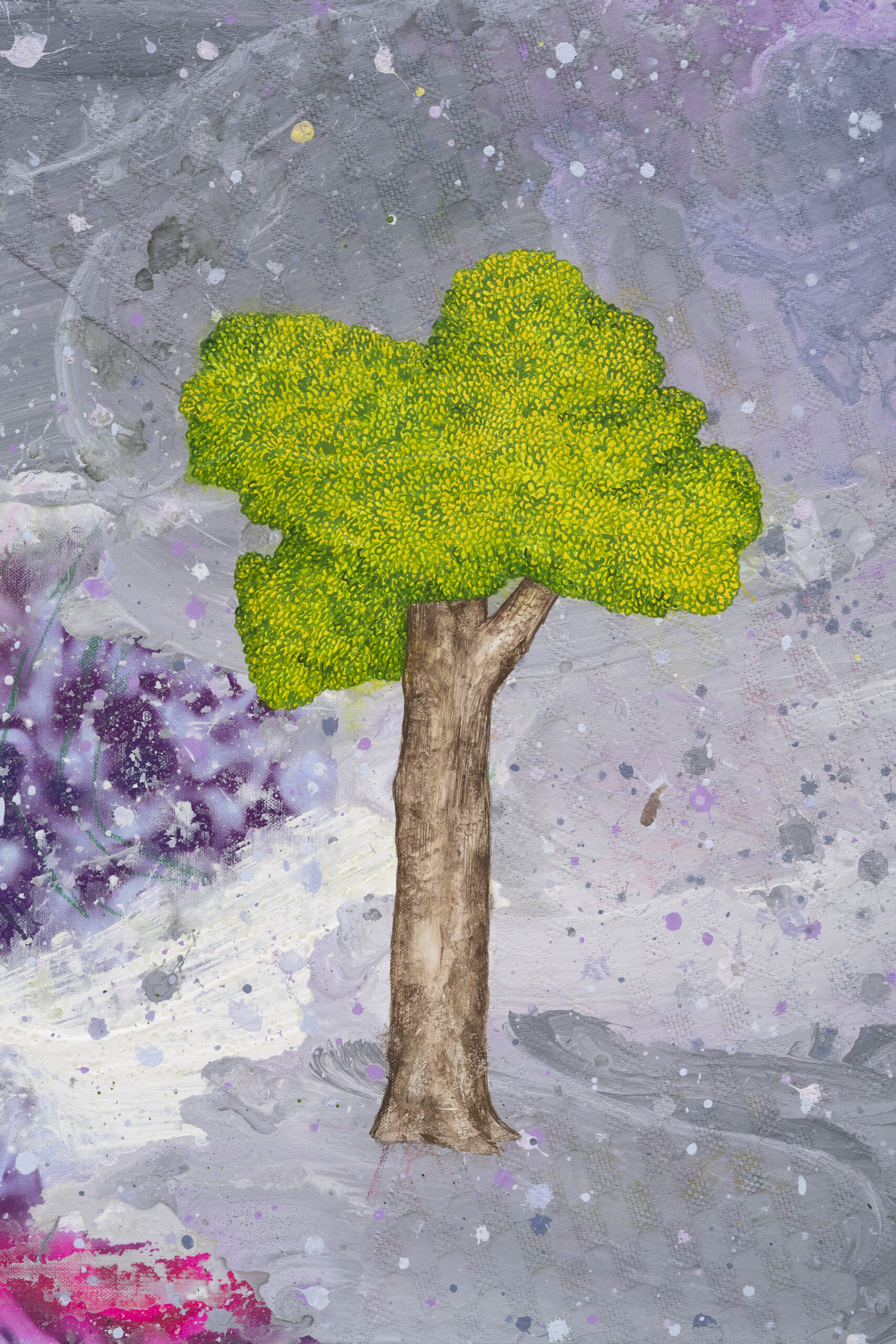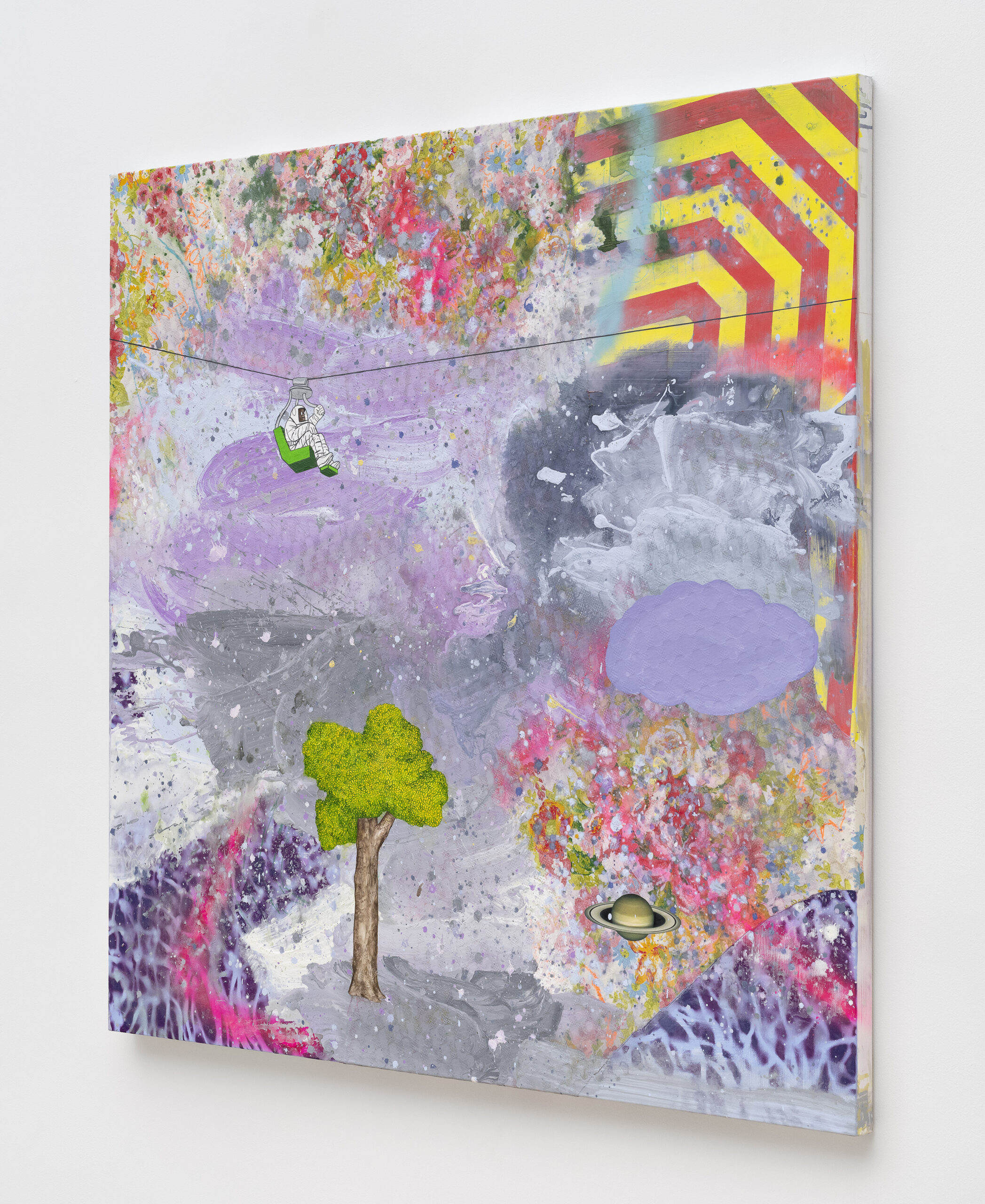 Acrylic, gouache, fabric, spray paint, color pencil, and photo collage on canvas