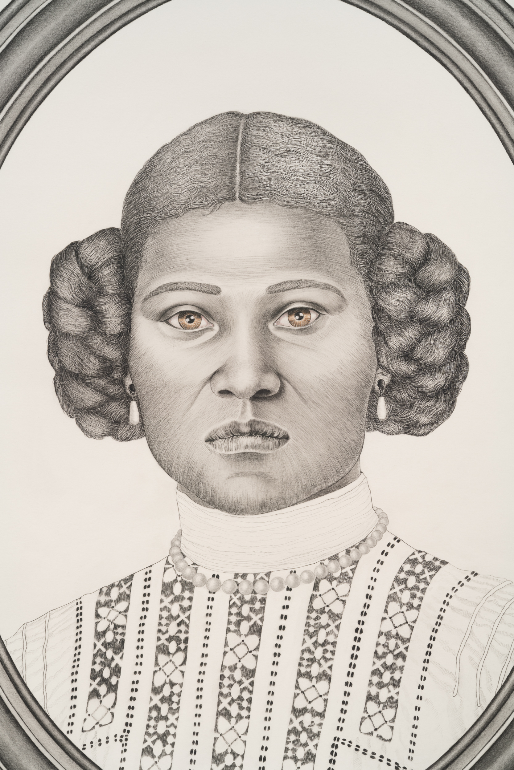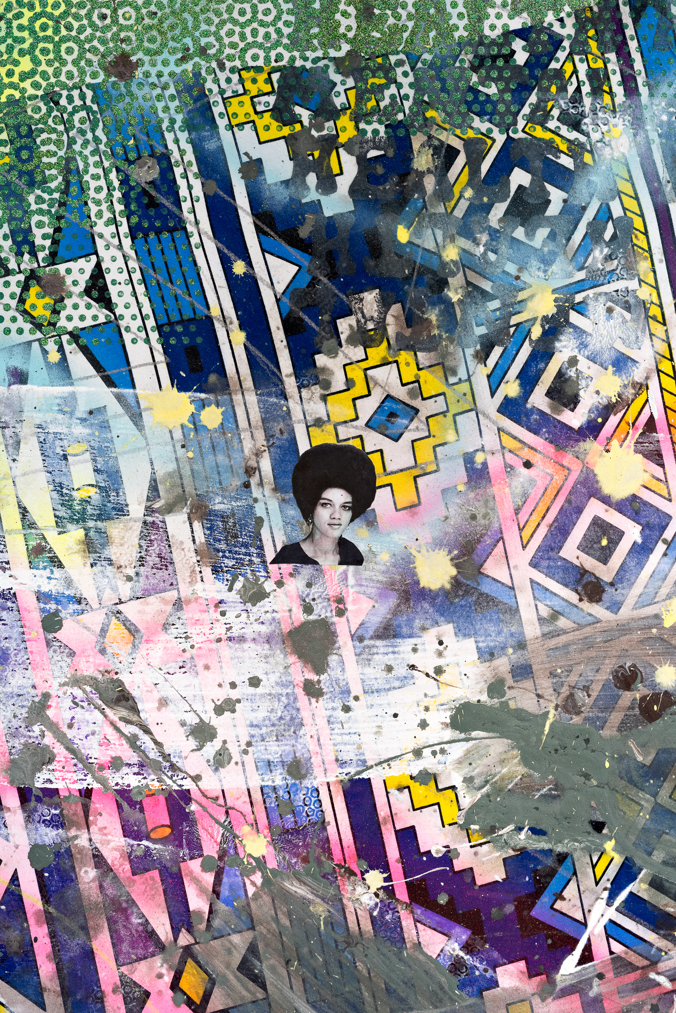 Acrylic, oil, spray paint, African cloth, photo collage, glitter, crayon and graphite on panel