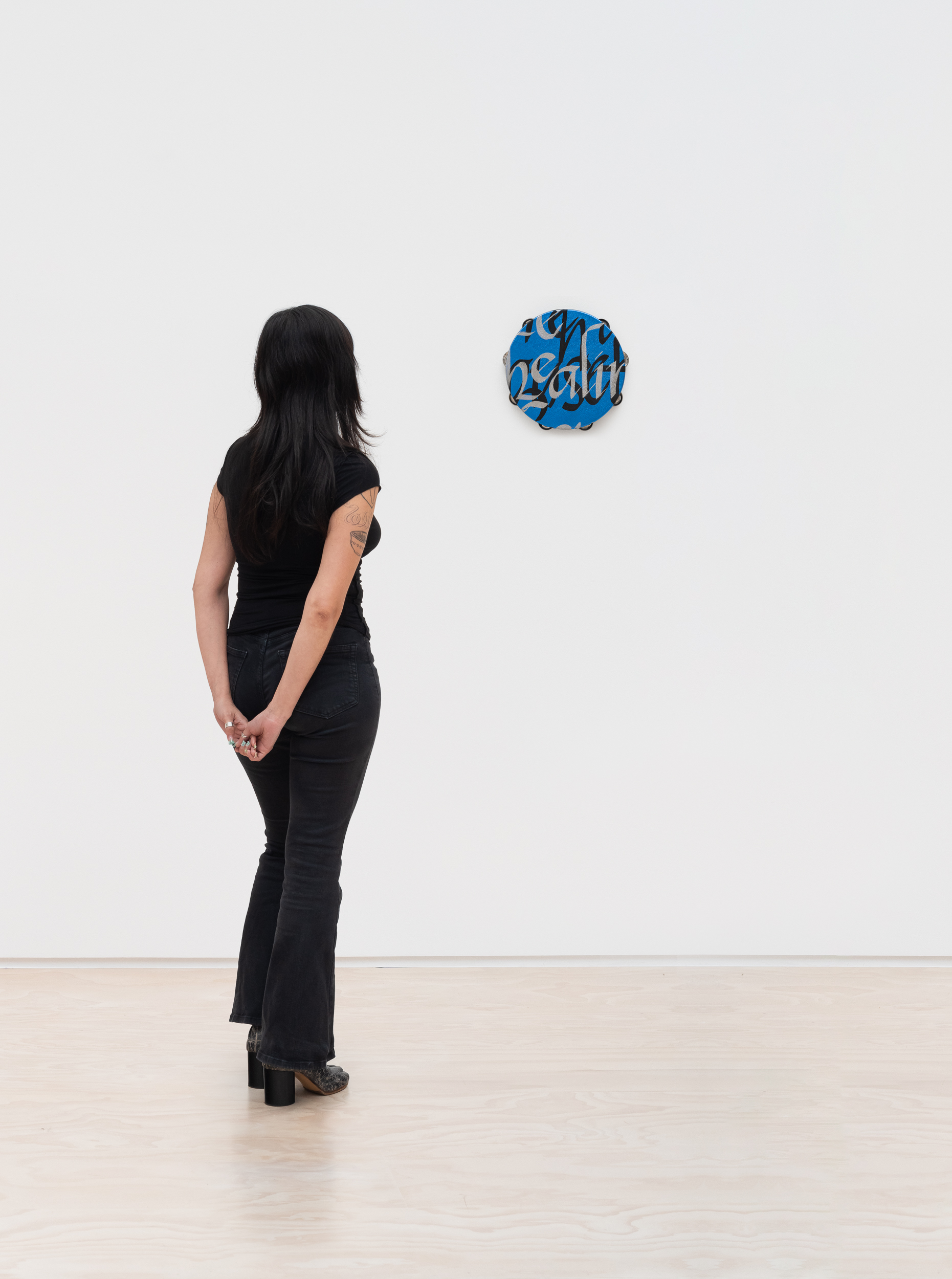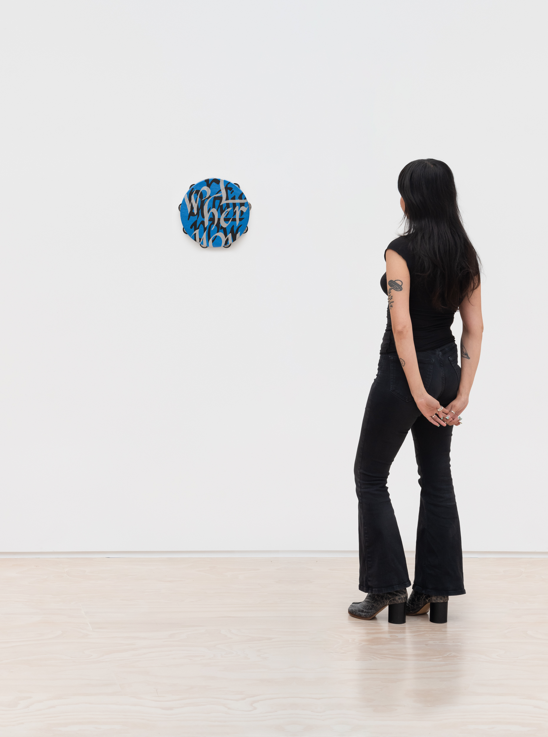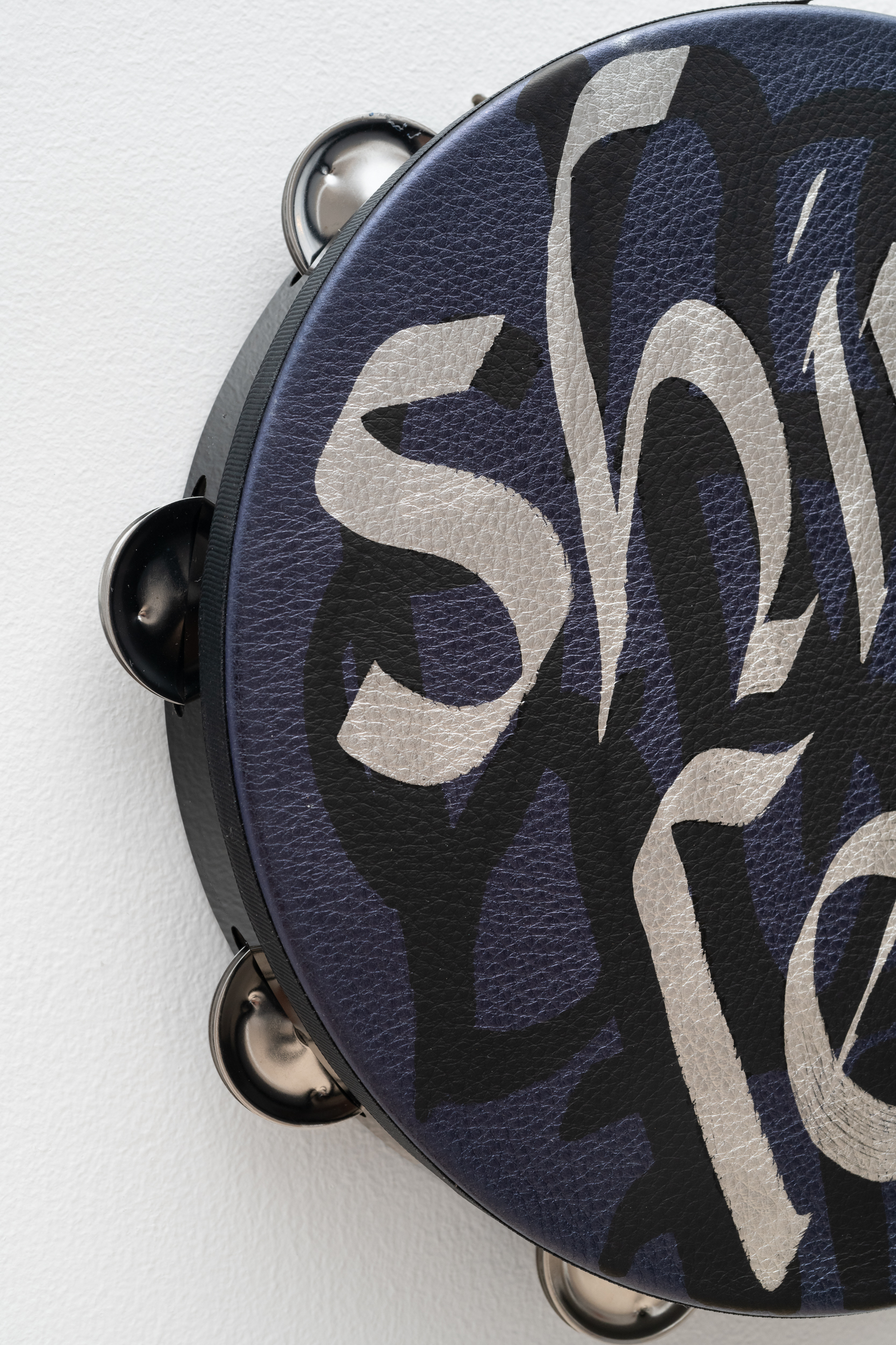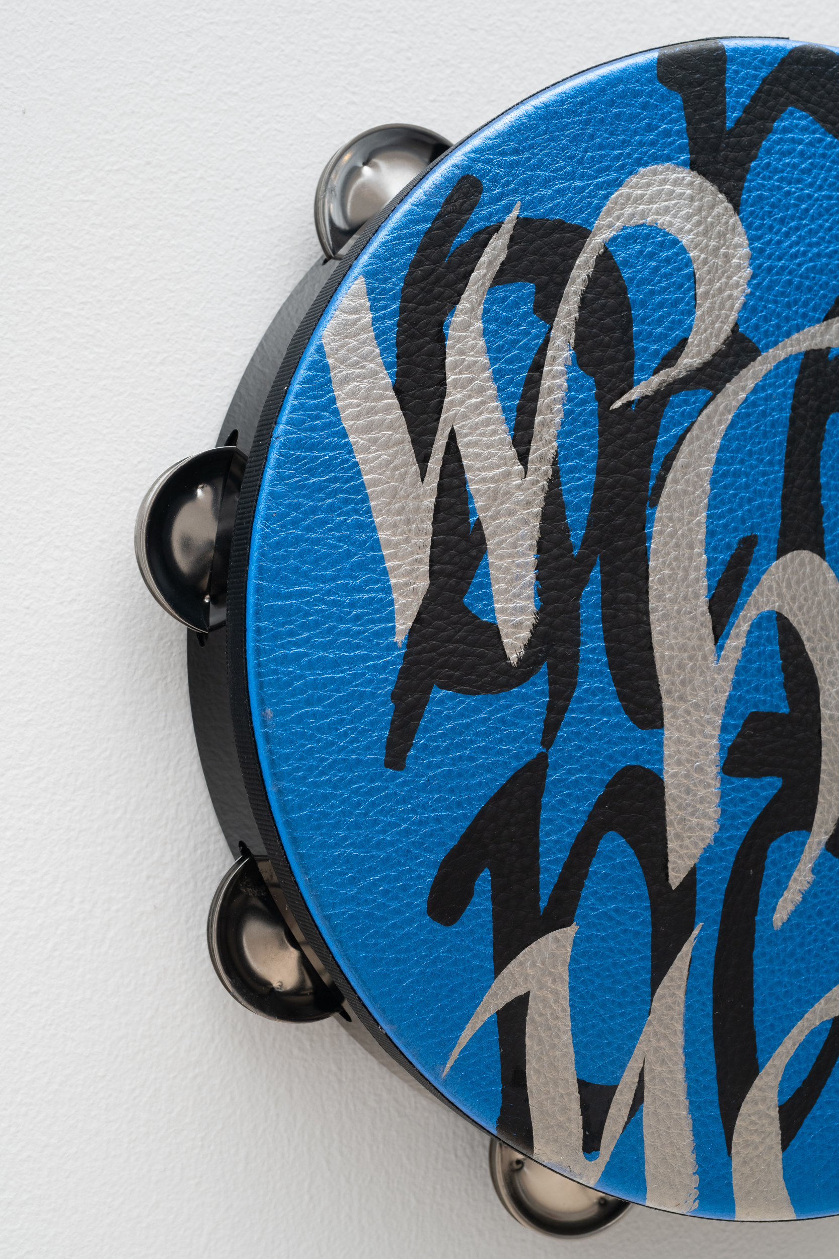Altered tambourines, acrylic calligraphy on metallic leather, acrylic disks, and grosgrain ribbon