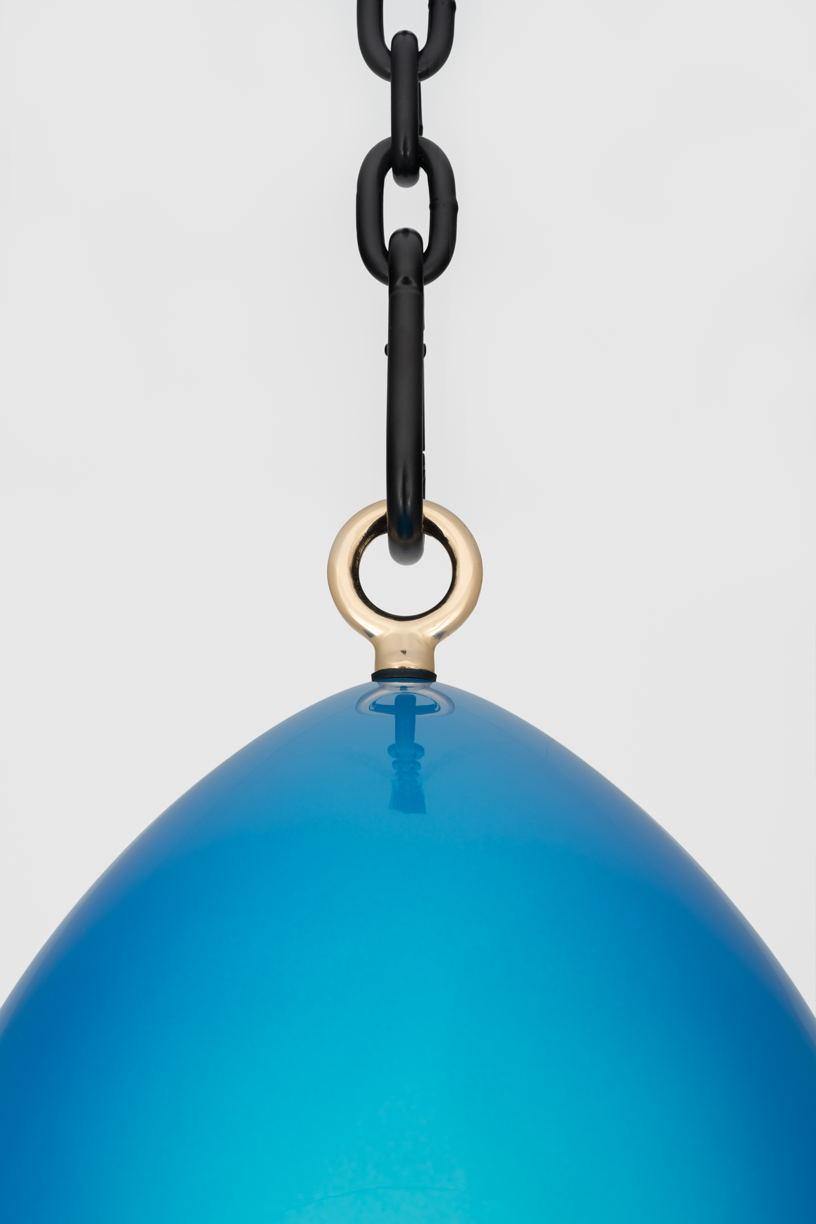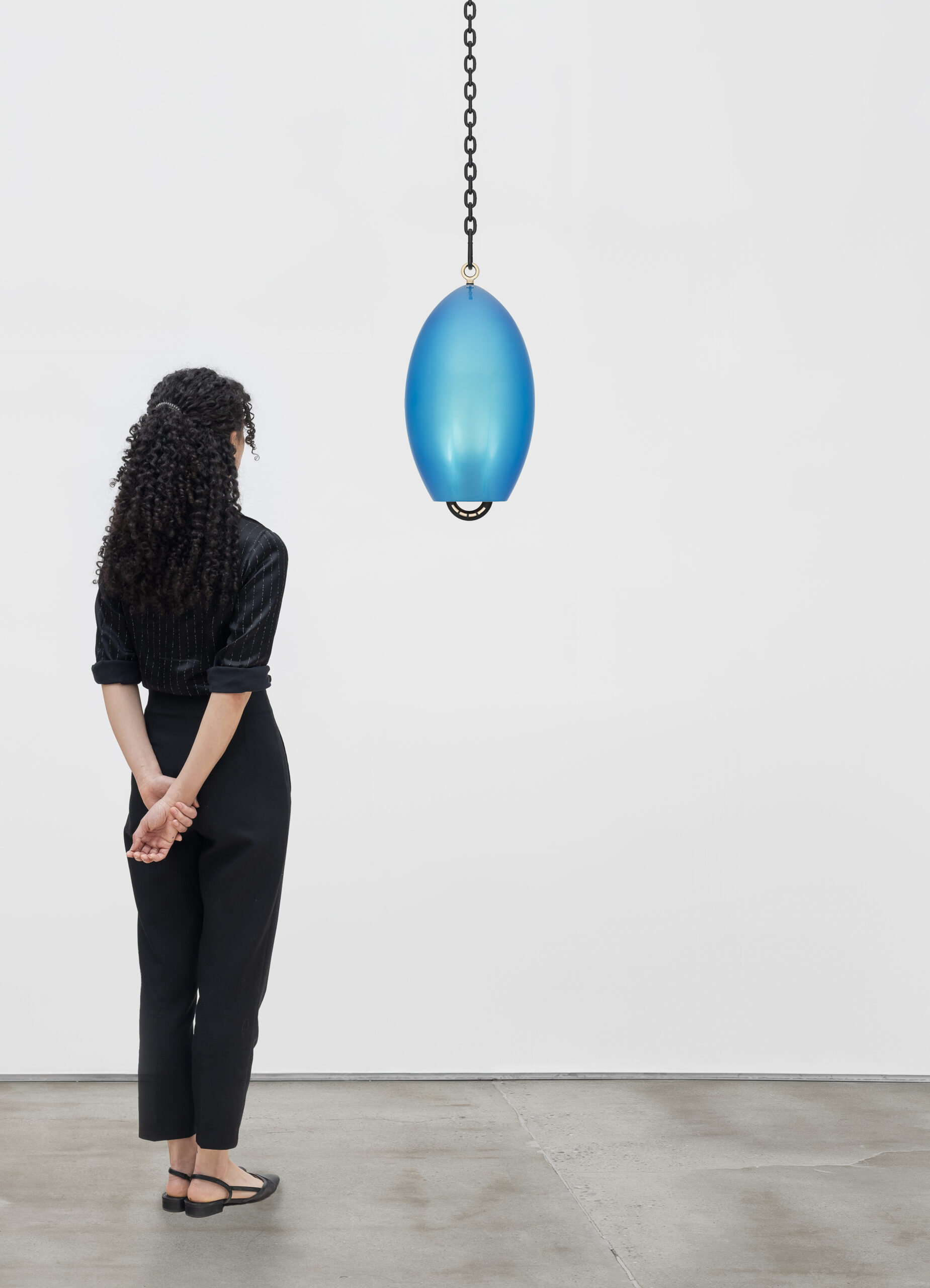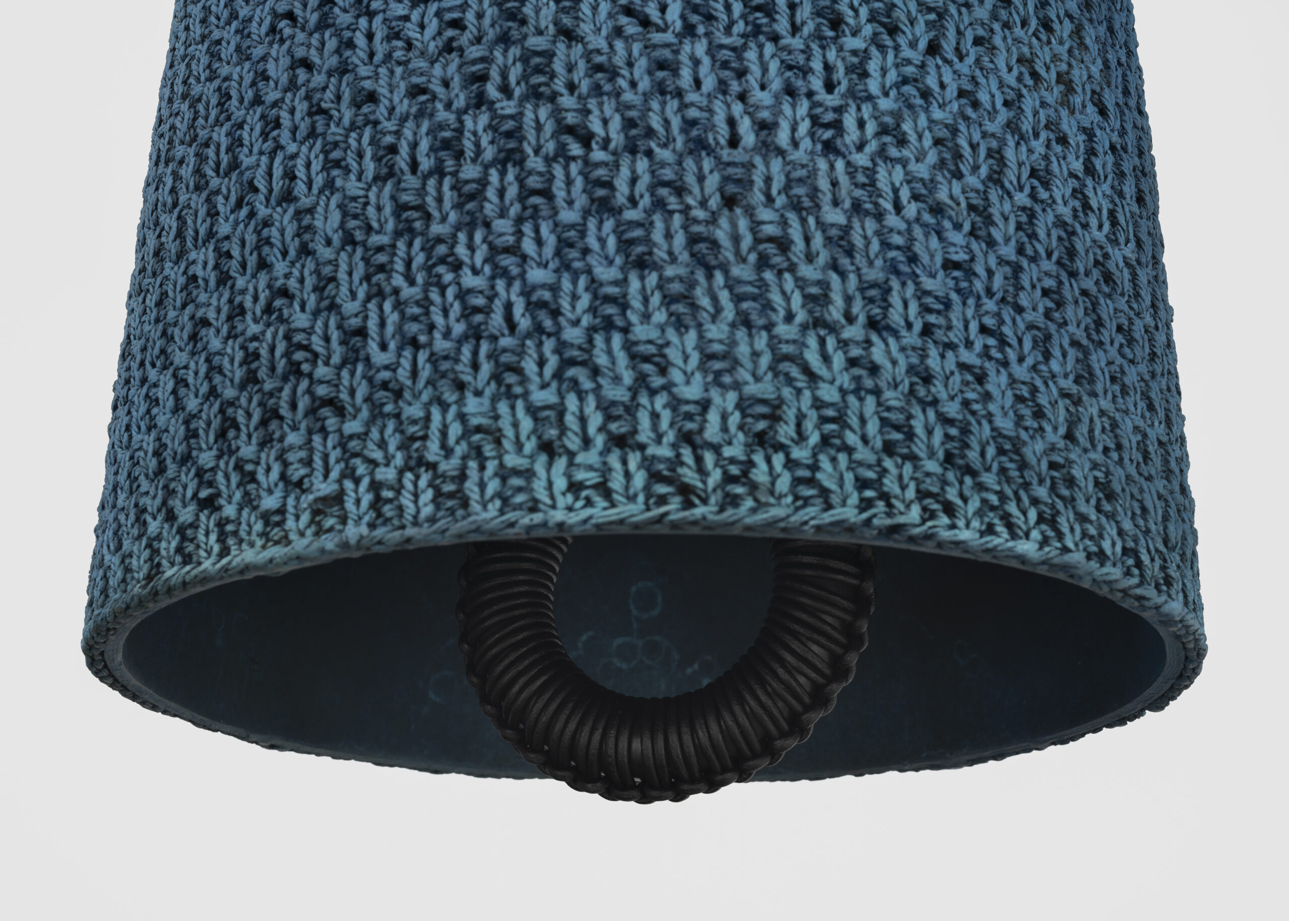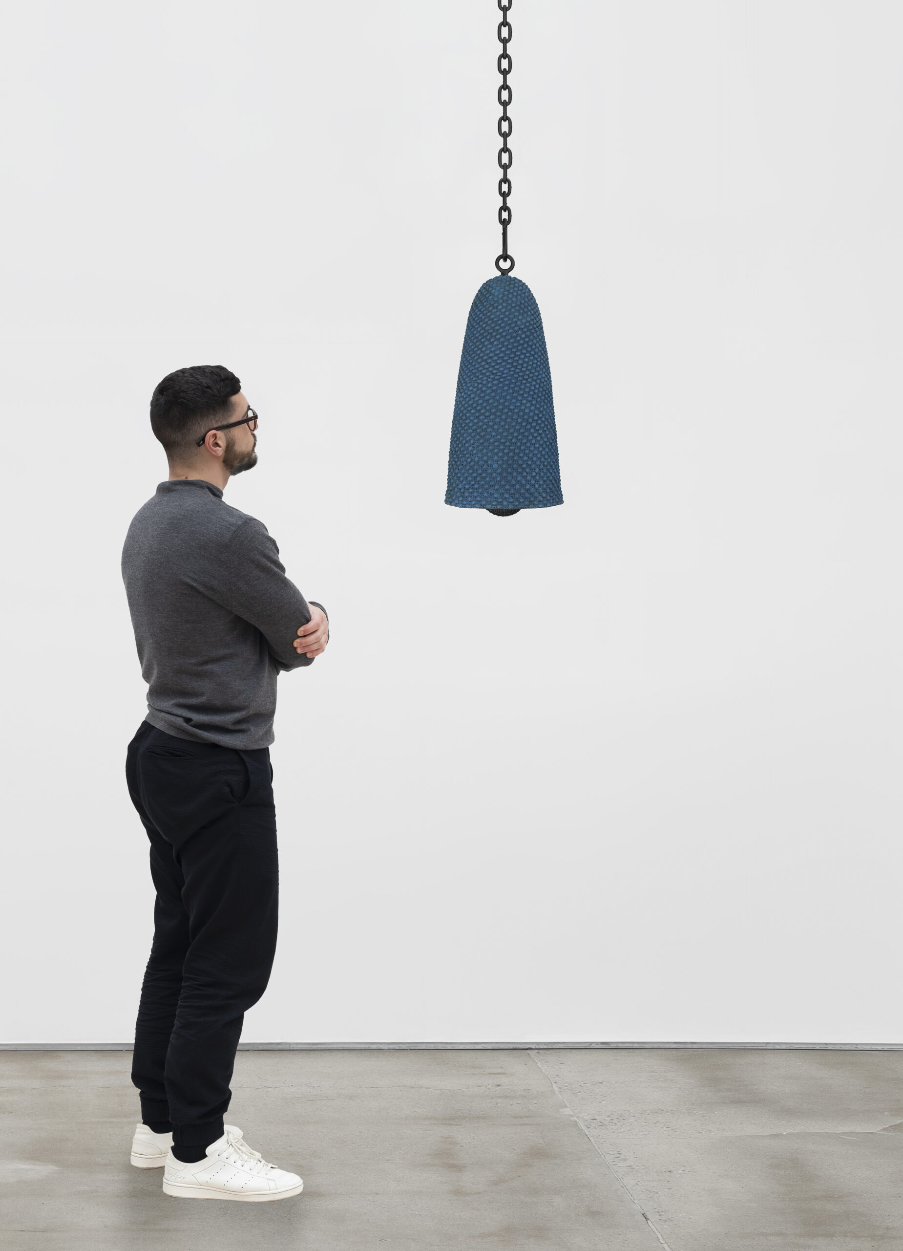 Patinated cast bronze bell, leather-wrapped polished bronze clapper, hemp shibari rope, powder-coated stainless steel hardware, powder-coated zinc-plated steel chain