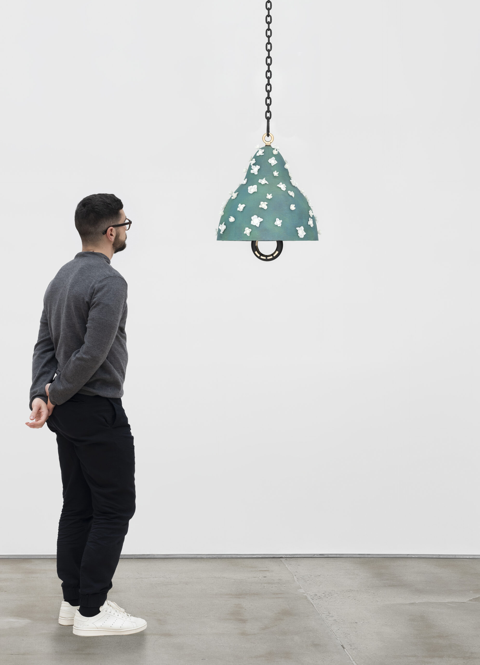 Patinated cast bronze bell, SLA 3D-printed with White ABS-Like resin, polished bronze clapper with sleeve, hemp shibari rope, polished and plated stainless steel hardware, powder coated stainless steel hardware, powder coated galvanized steel chain