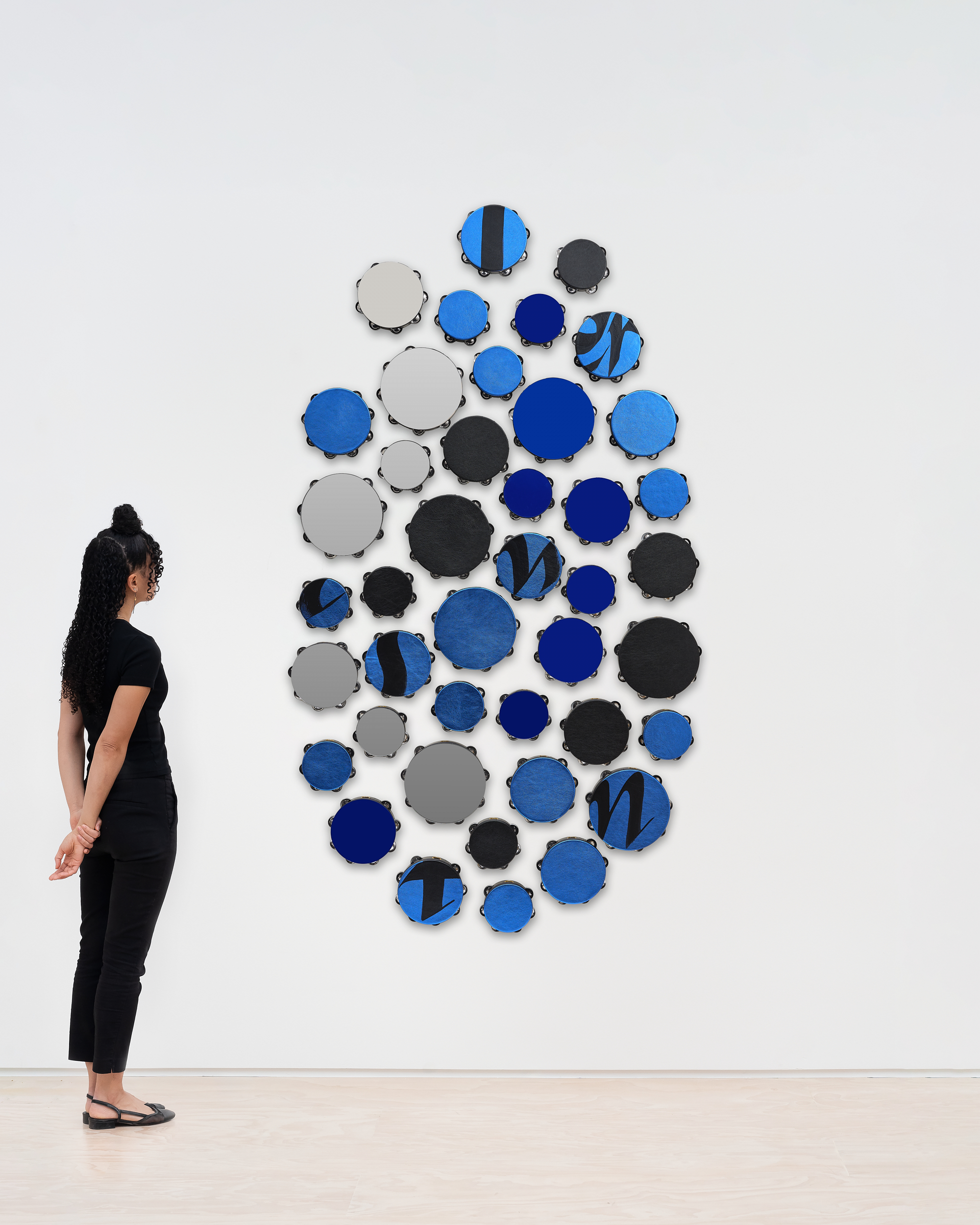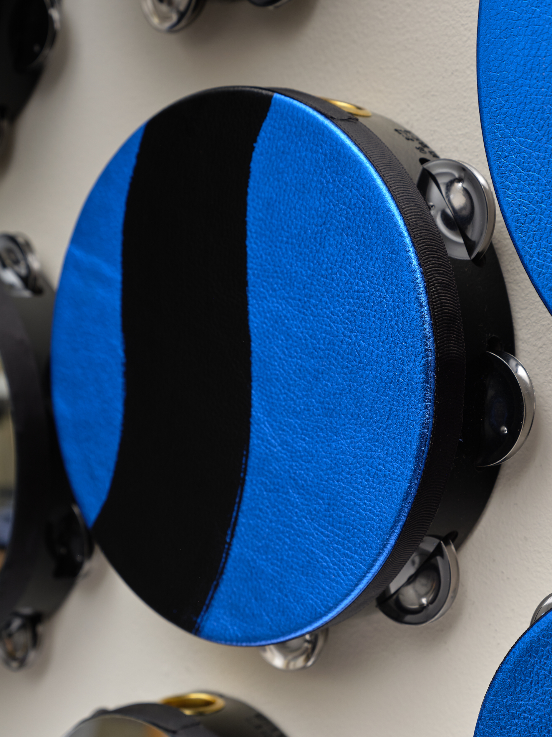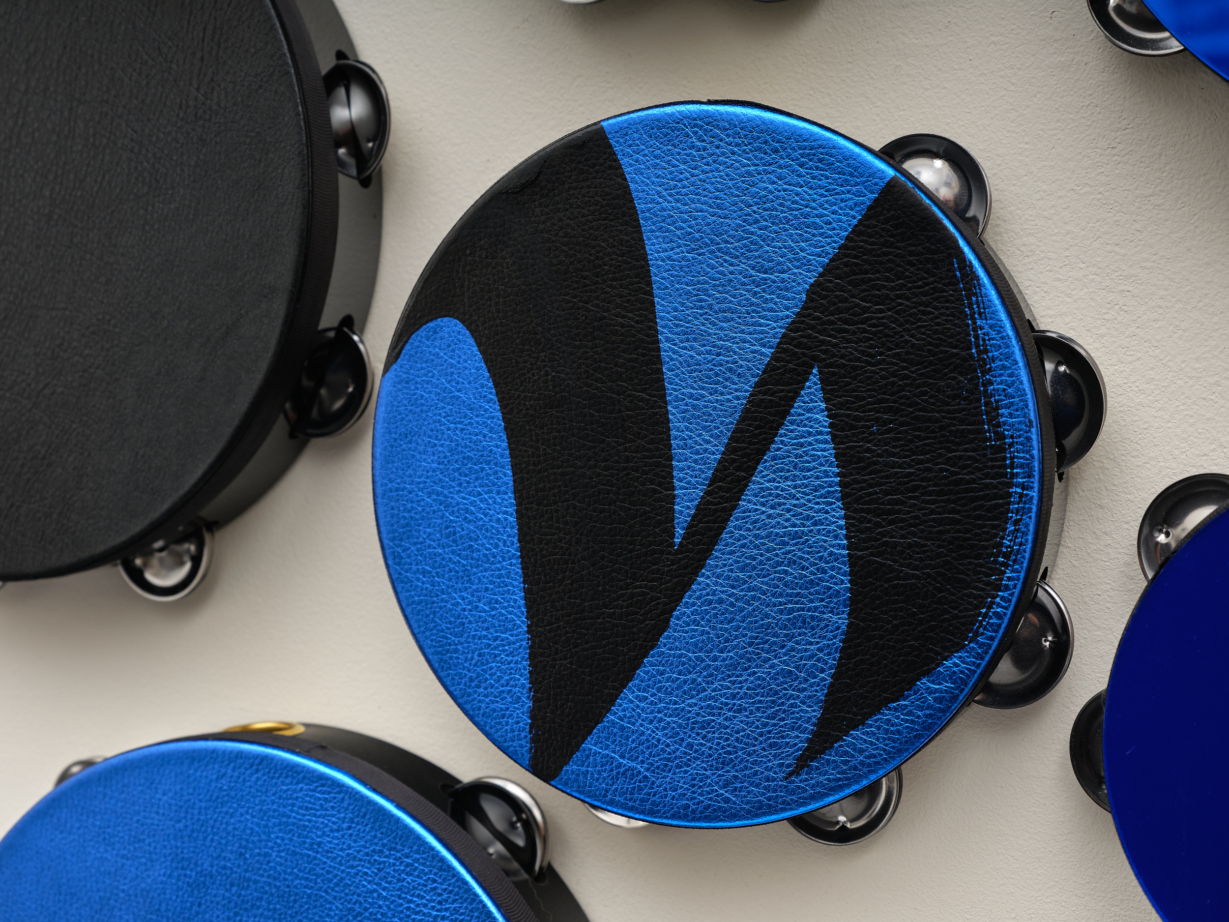 Altered tambourines with grosgrain ribbon, metallic leather, mirrored acrylic discs, and acrylic
