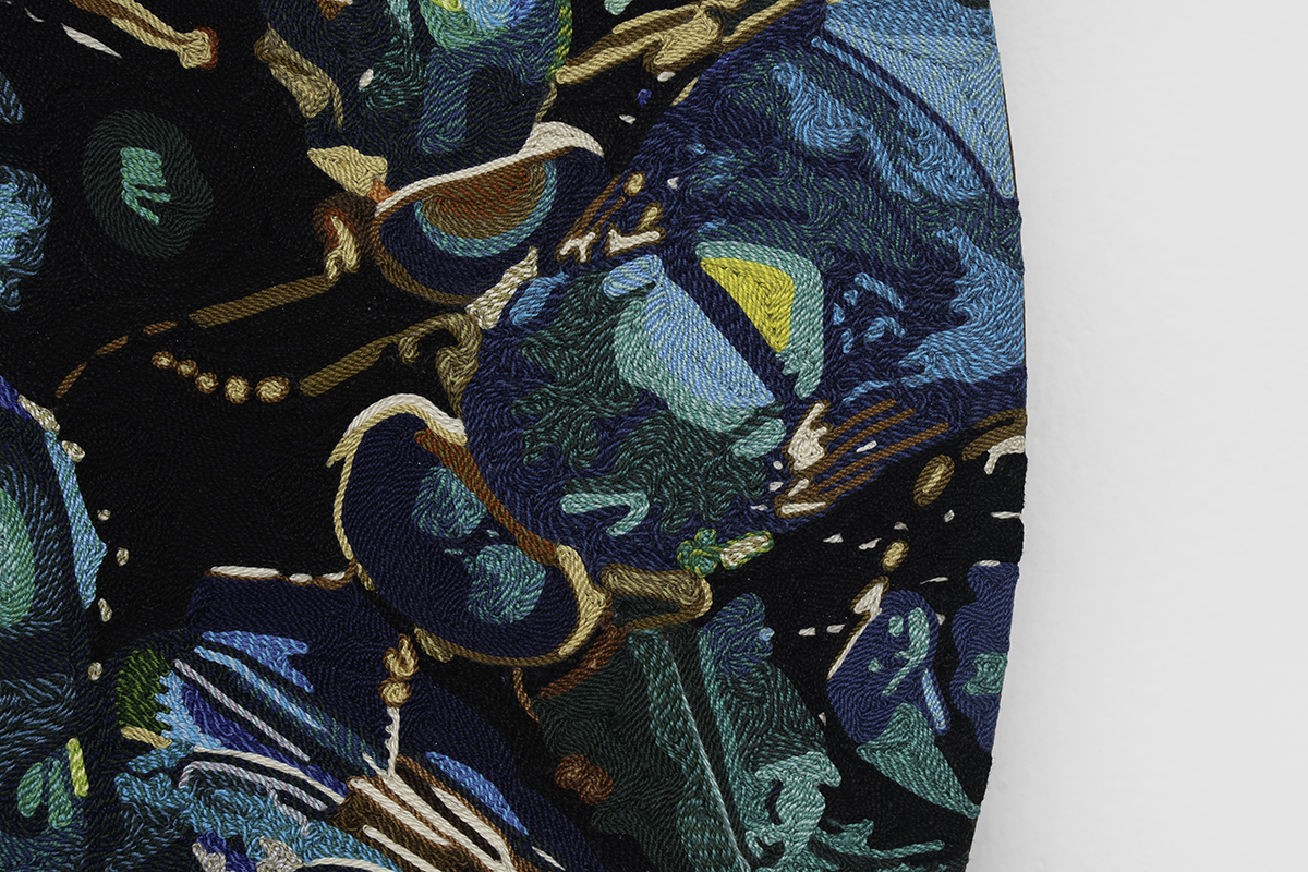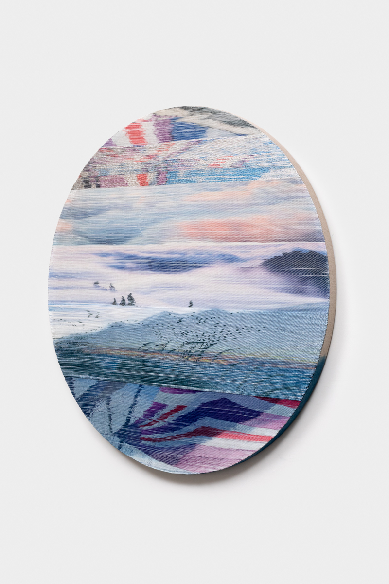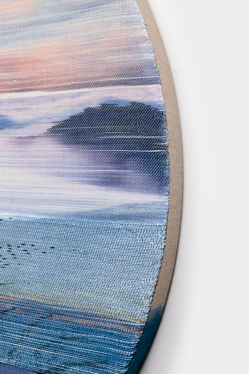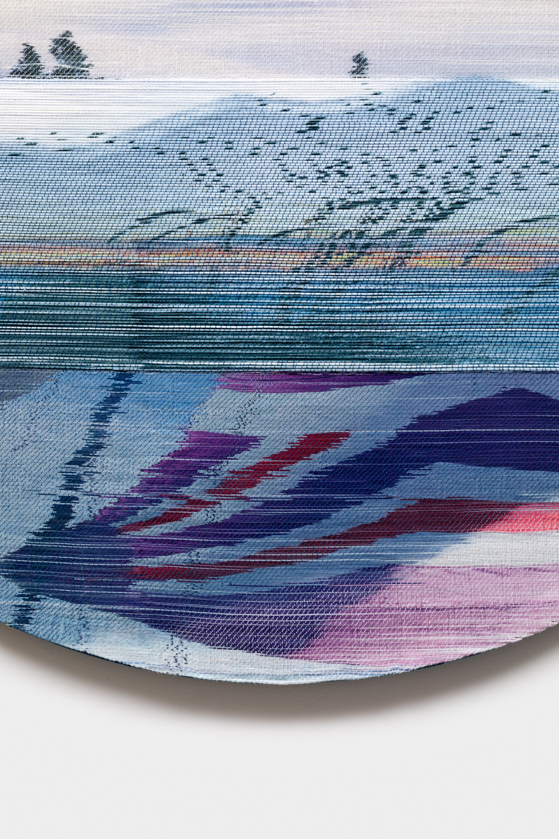 Handwoven polymer, linen, sterling silver leafed thread, dye sublimation ink, and indigo dye mounted on indigo-dyed linen canvas