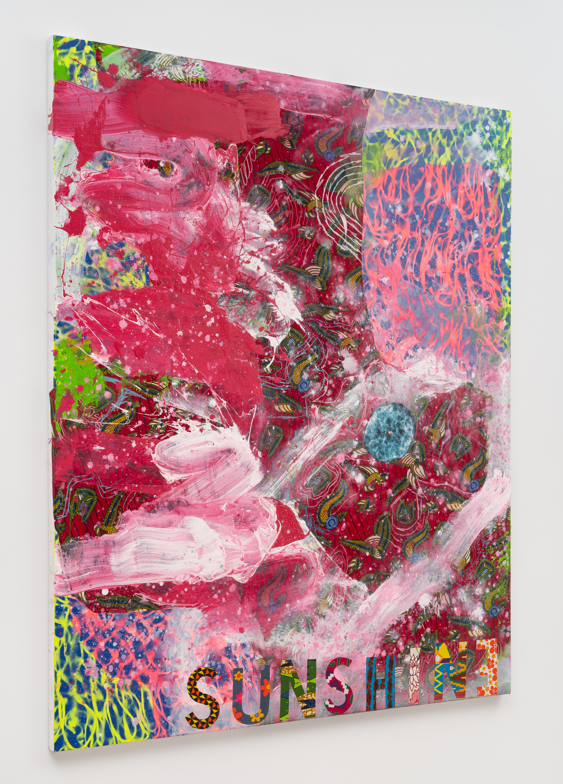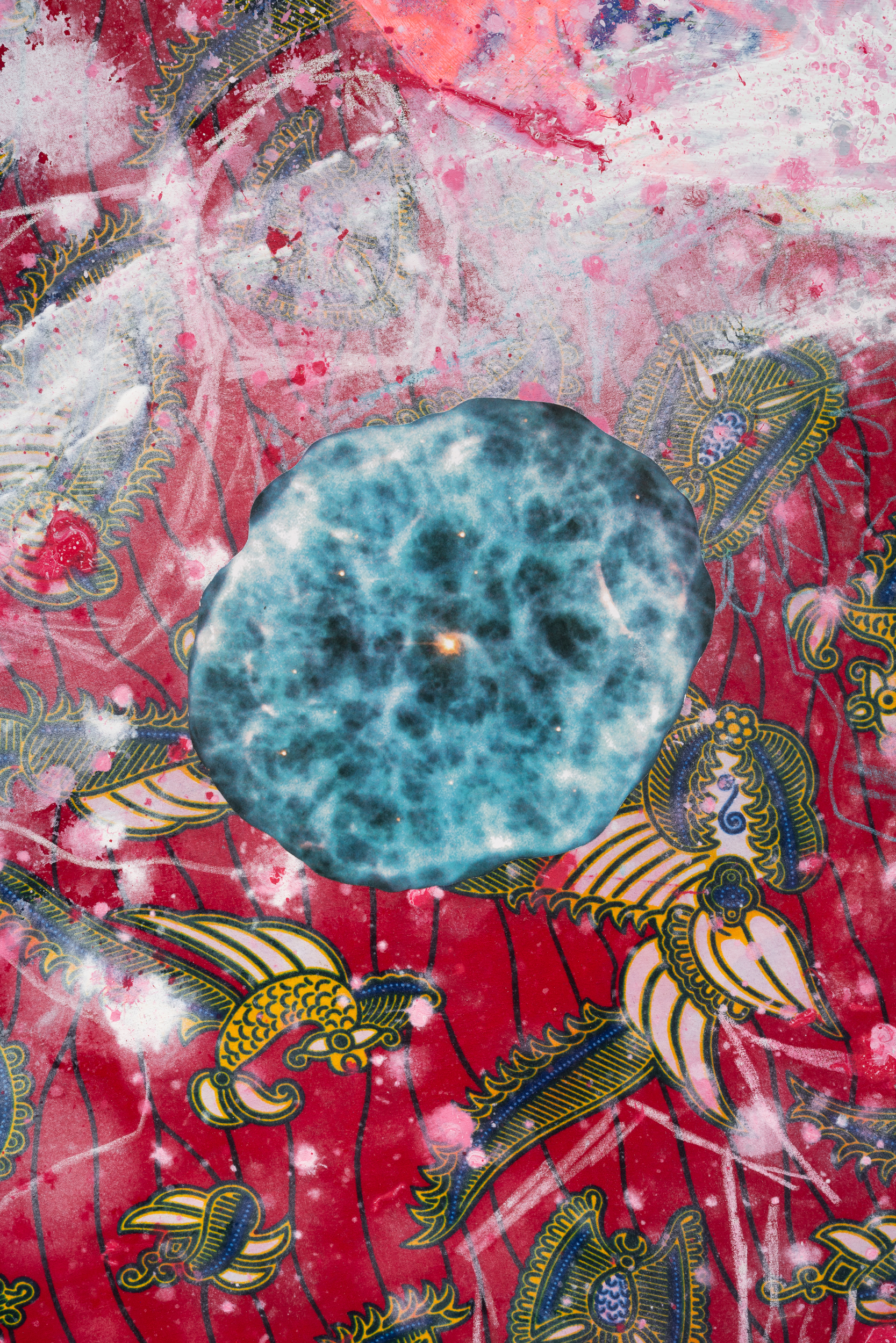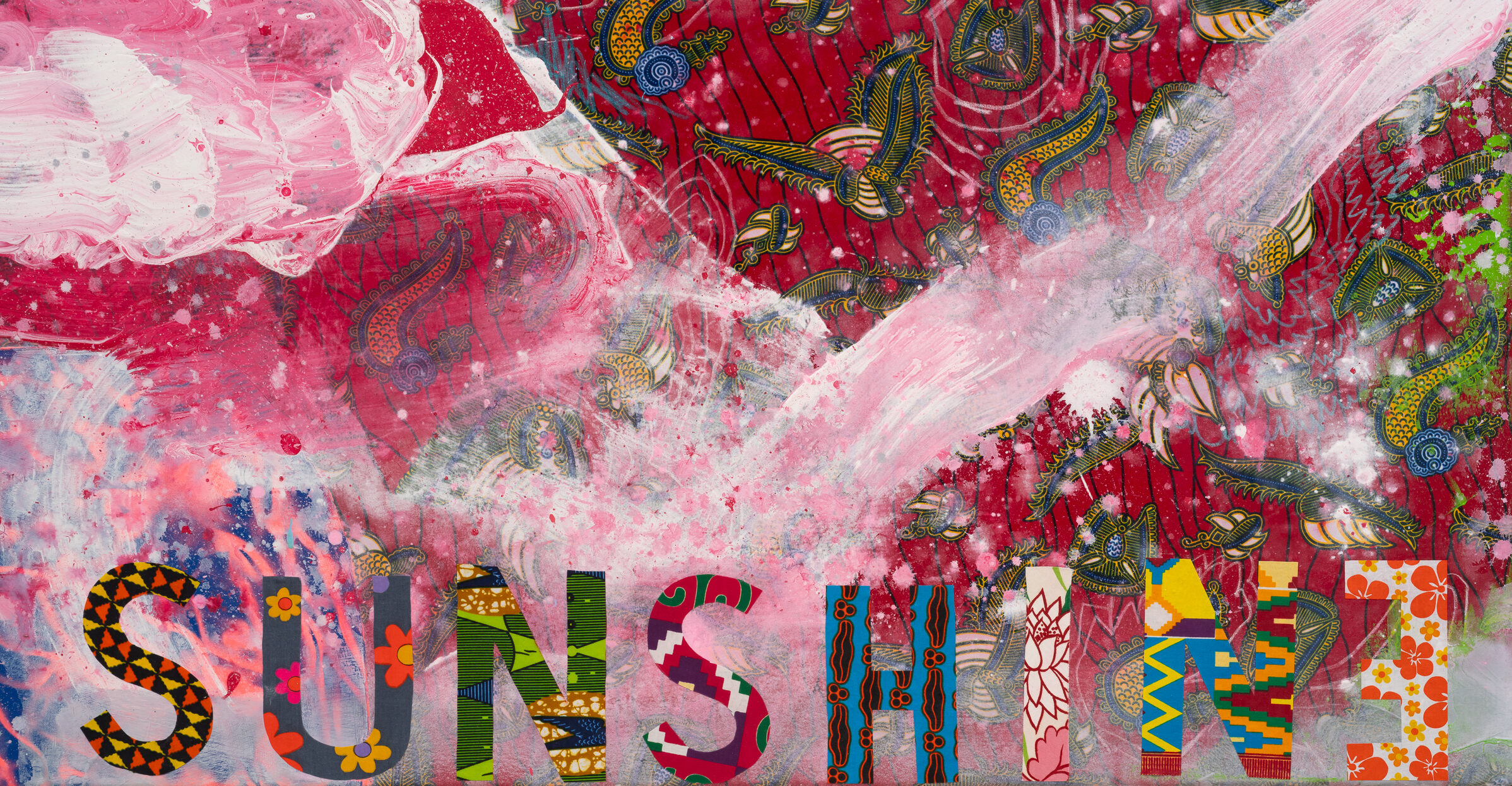 Acrylic, gouache, Ghanaian fabric, color pencil and photo collage on canvas