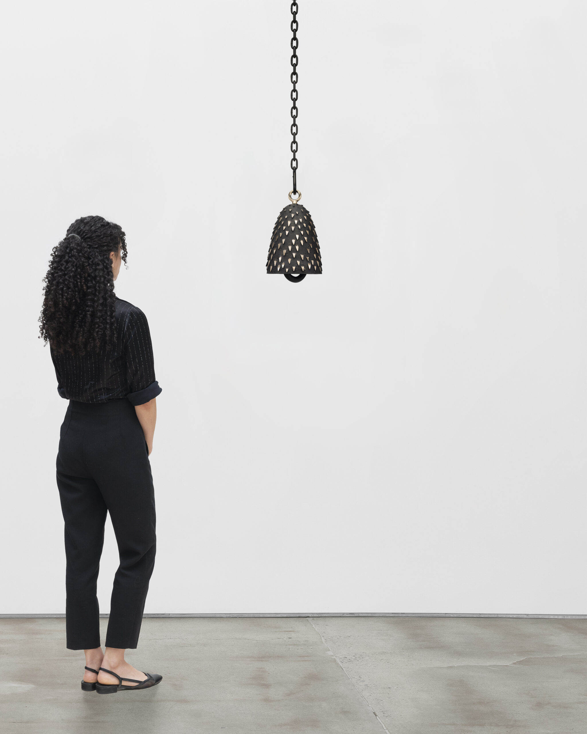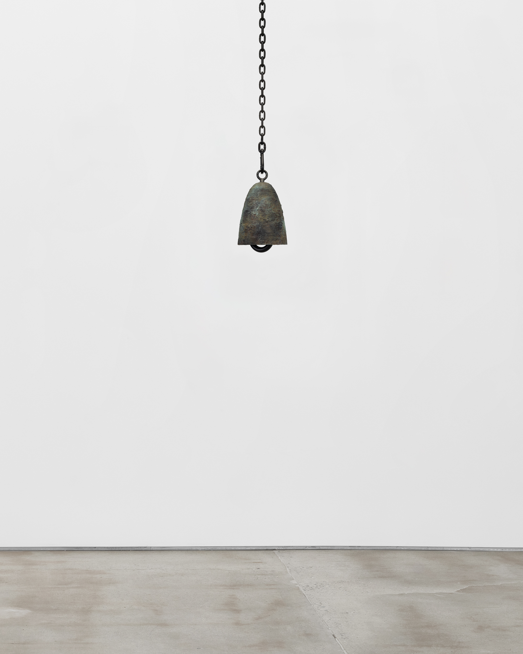 Polished and patinated cast bronze bell, polished bronze clapper with sleeve, hemp shibari rope, powder-coated stainless steel hardware, powder-coated zinc-plated steel chain