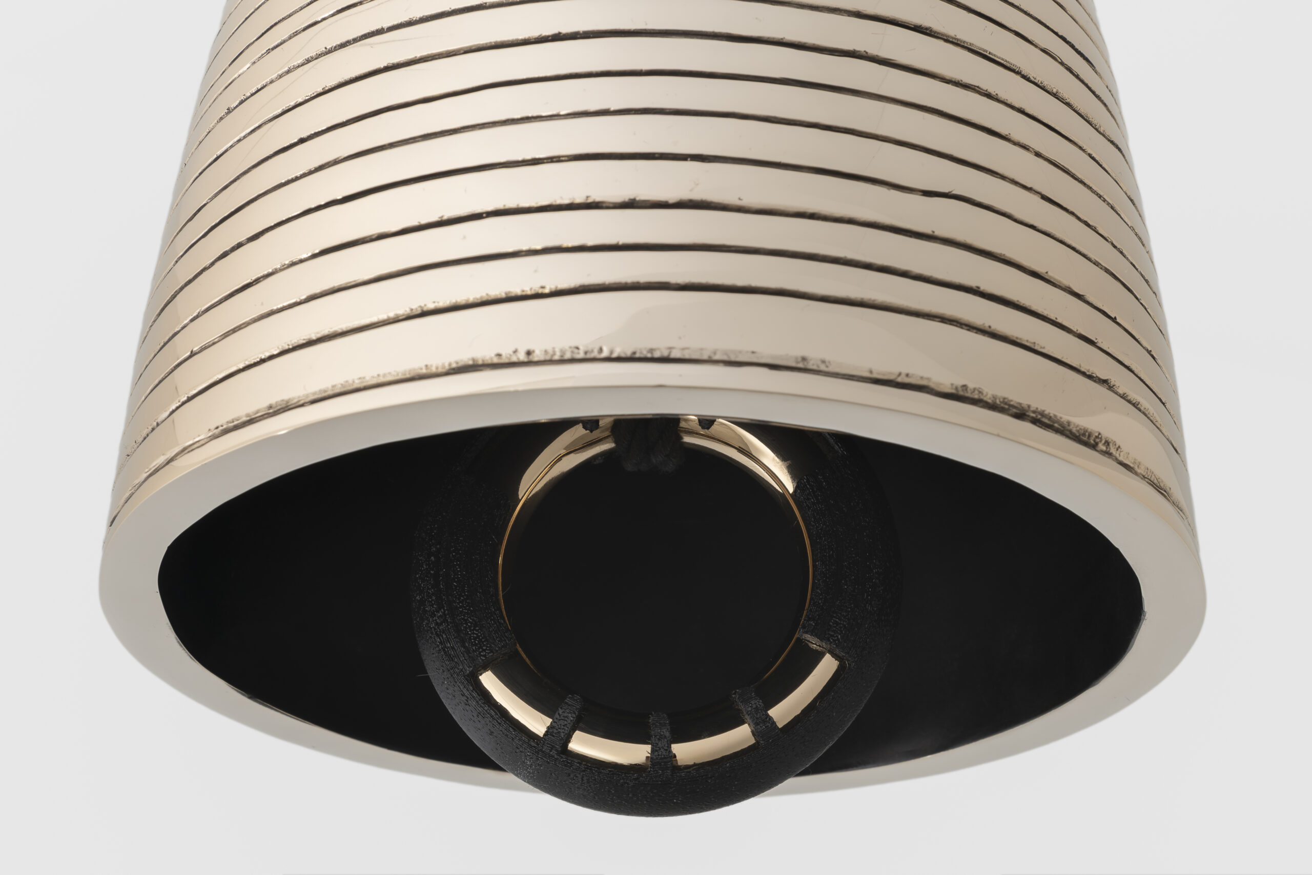 Polished and patinated cast bronze bell, solid bronze clapper, hemp shibari rope, powder-coated stainless steel hardware, powder-coated zinc-plated steel chain