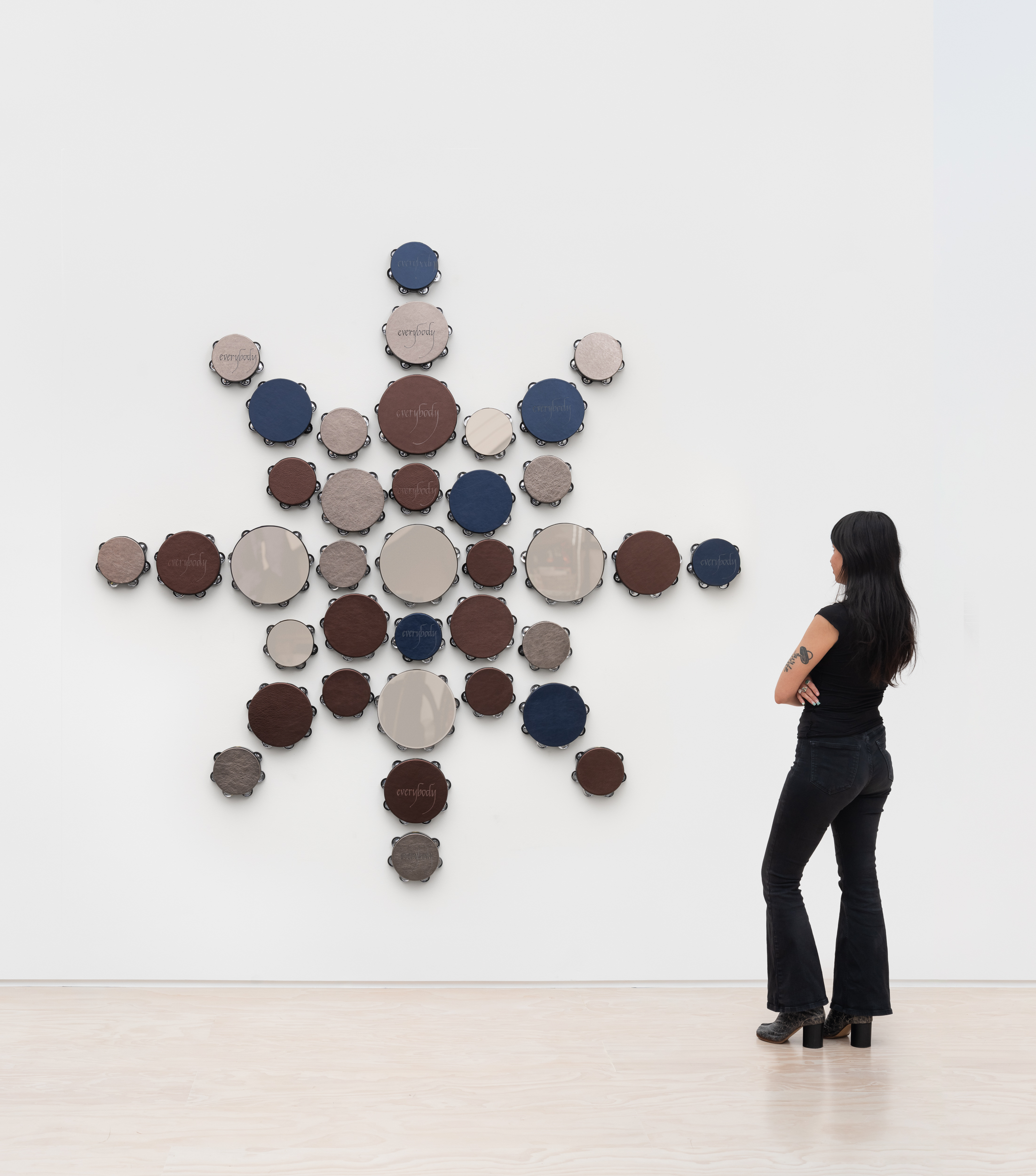 Altered tambourines, metallic bronze, pewter, and navy leather with acrylic mirrored pewter