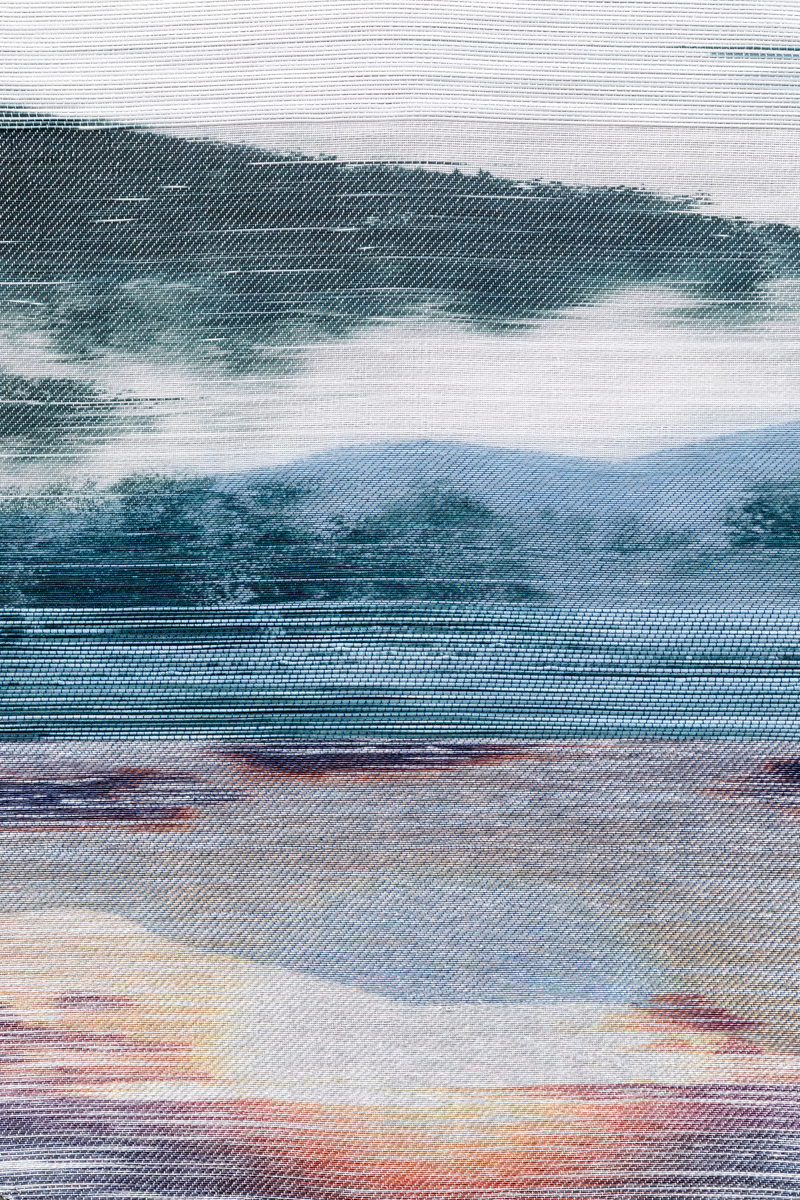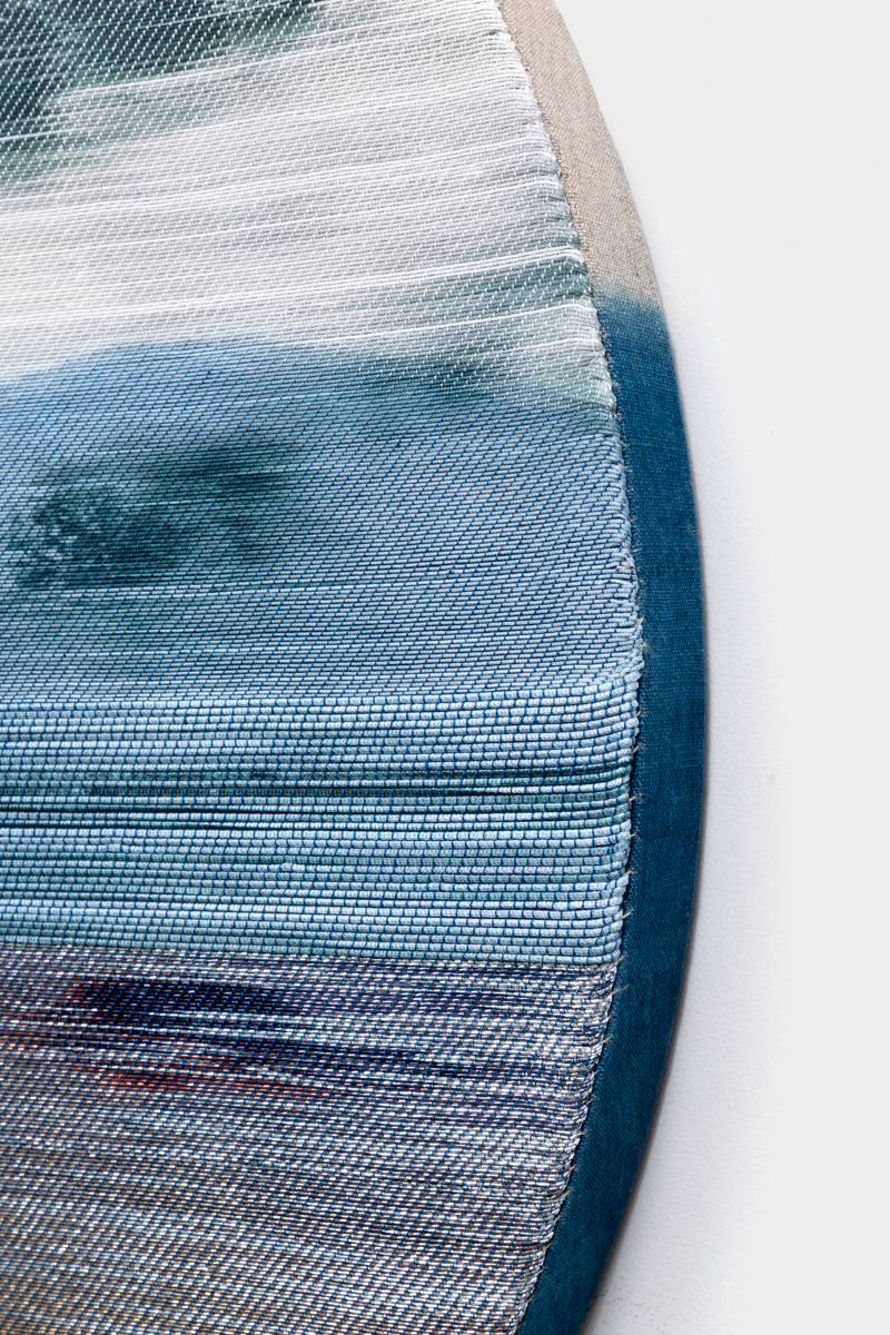 Handwoven polymer, linen, sterling silver-leafed thread, dye sublimation ink, and indigo dye mounted on indigo-dyed linen canvas