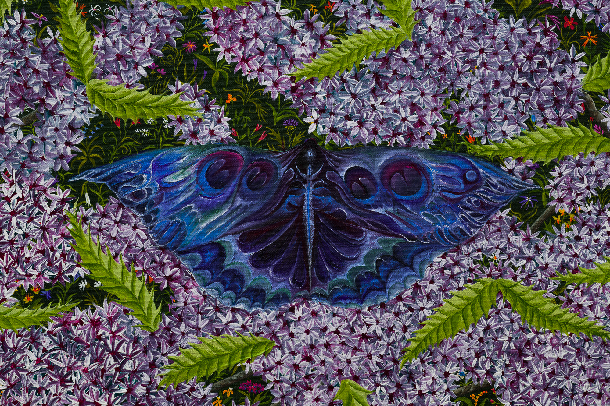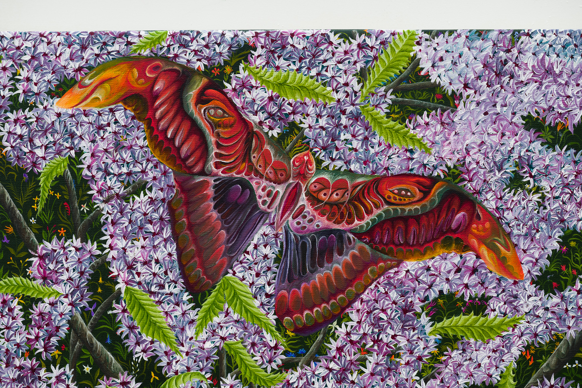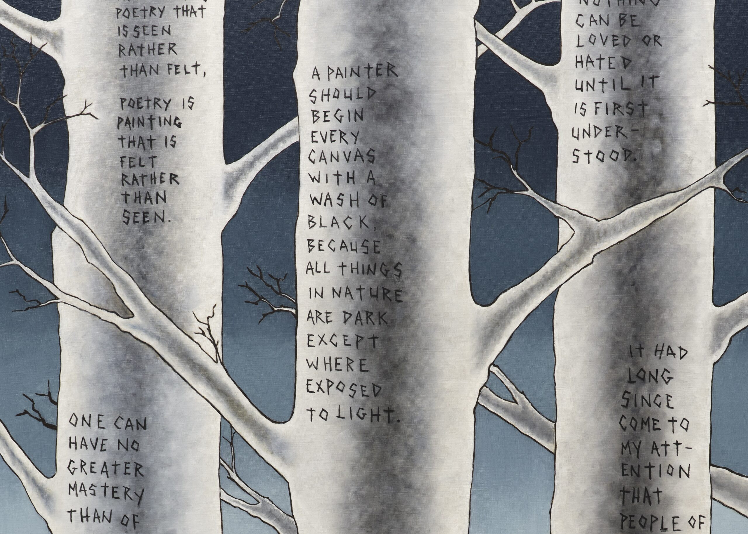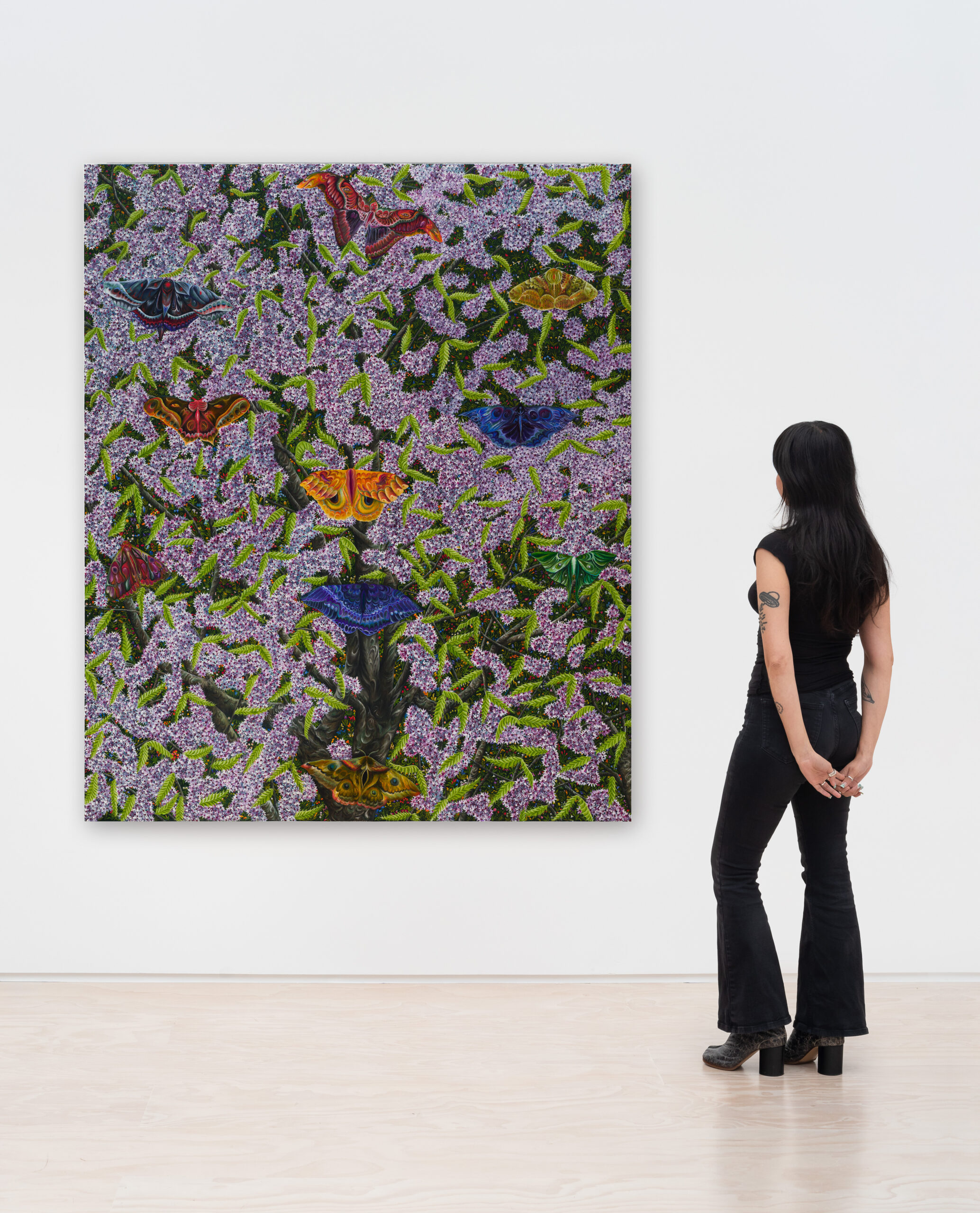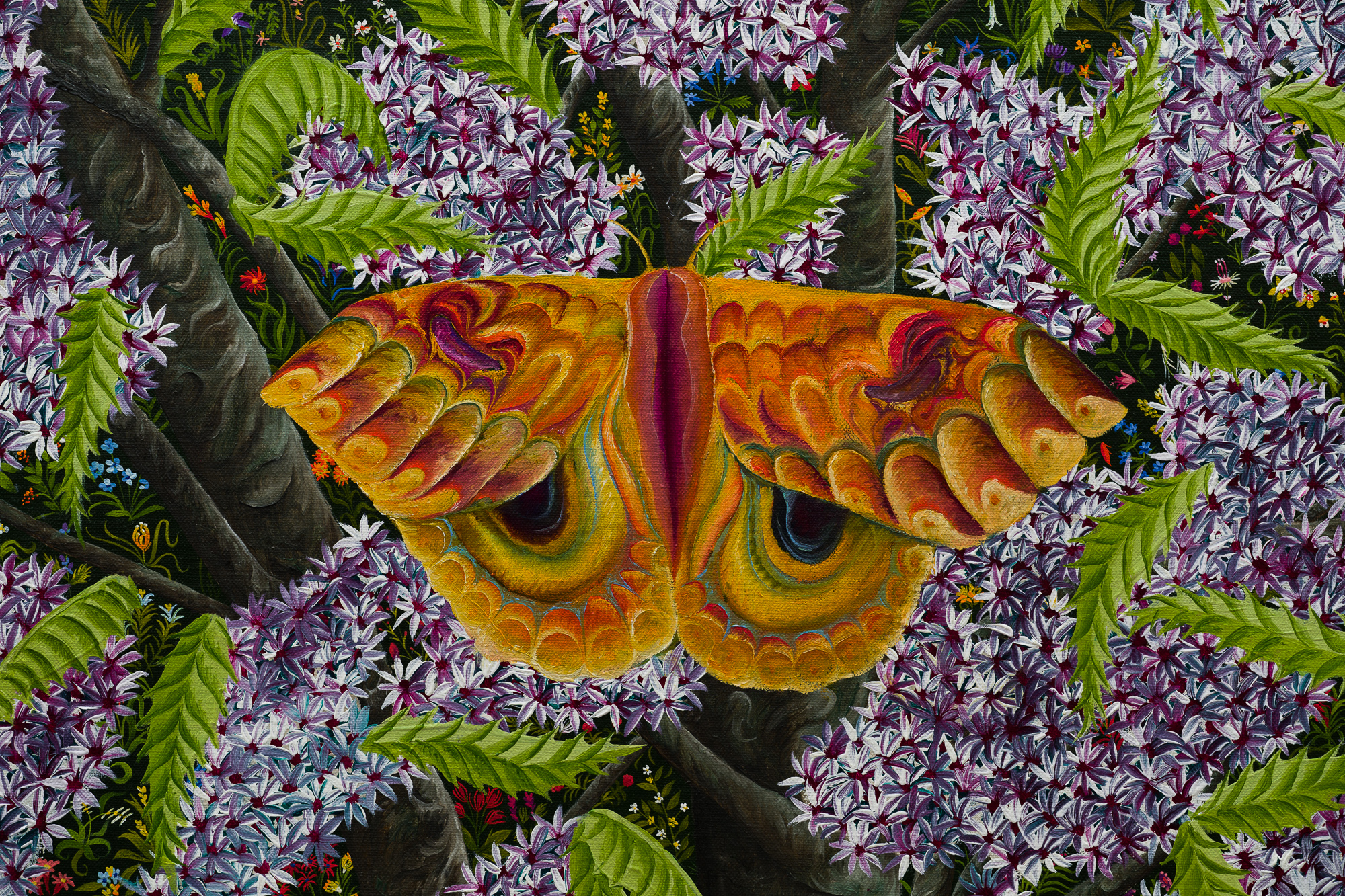 Throughout the exhibition, trees function as emotional and psychological terrain. Wood is sometimes a sculptural collaborator, where botanical forms unfurl into intricate ornamentation. The participating artists draw on the material life of trees as much as their imagery. Often incorporating reclaimed wood, bark, and other organic materials, trees are articulated as structures of rootedness, respiration, and growth.