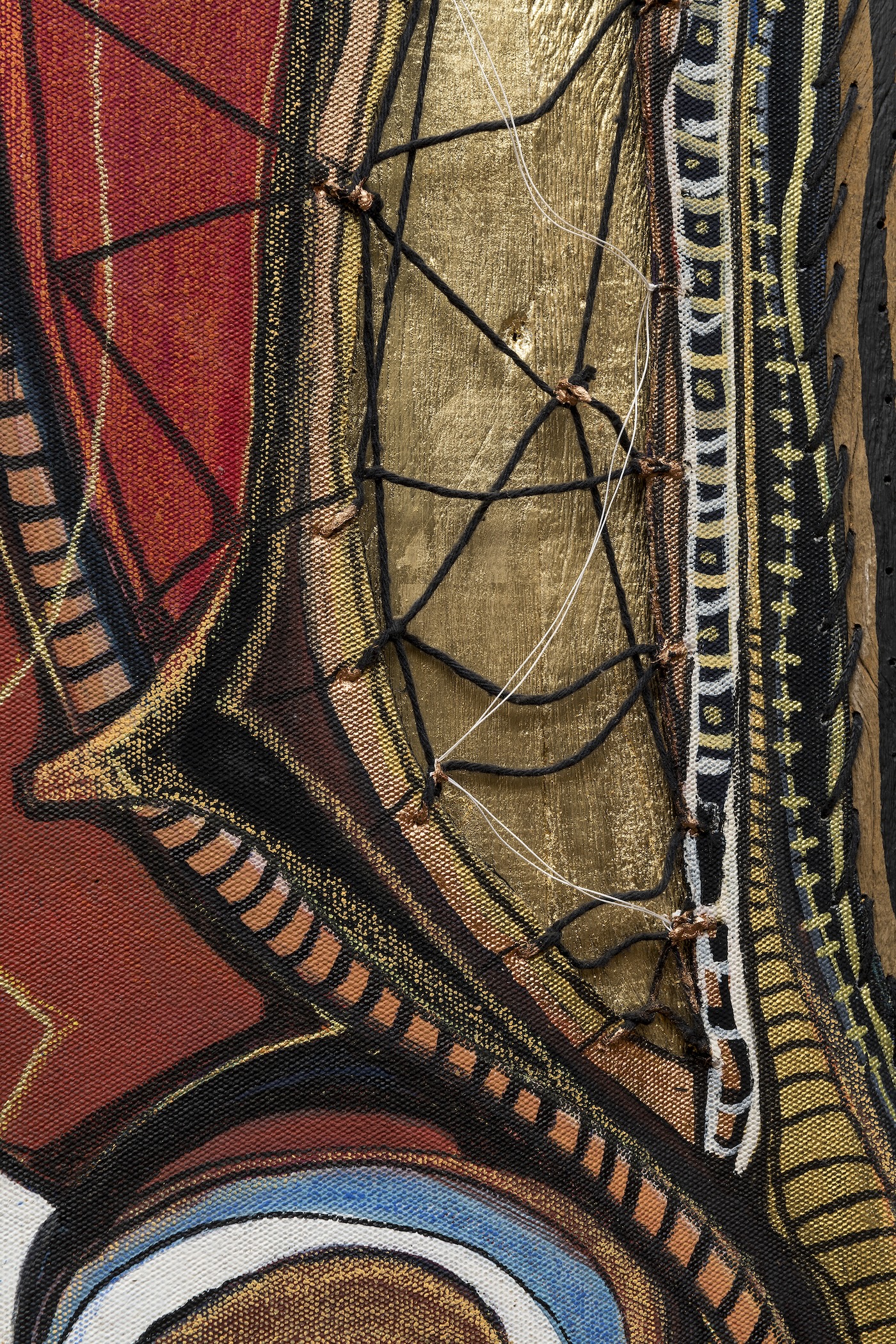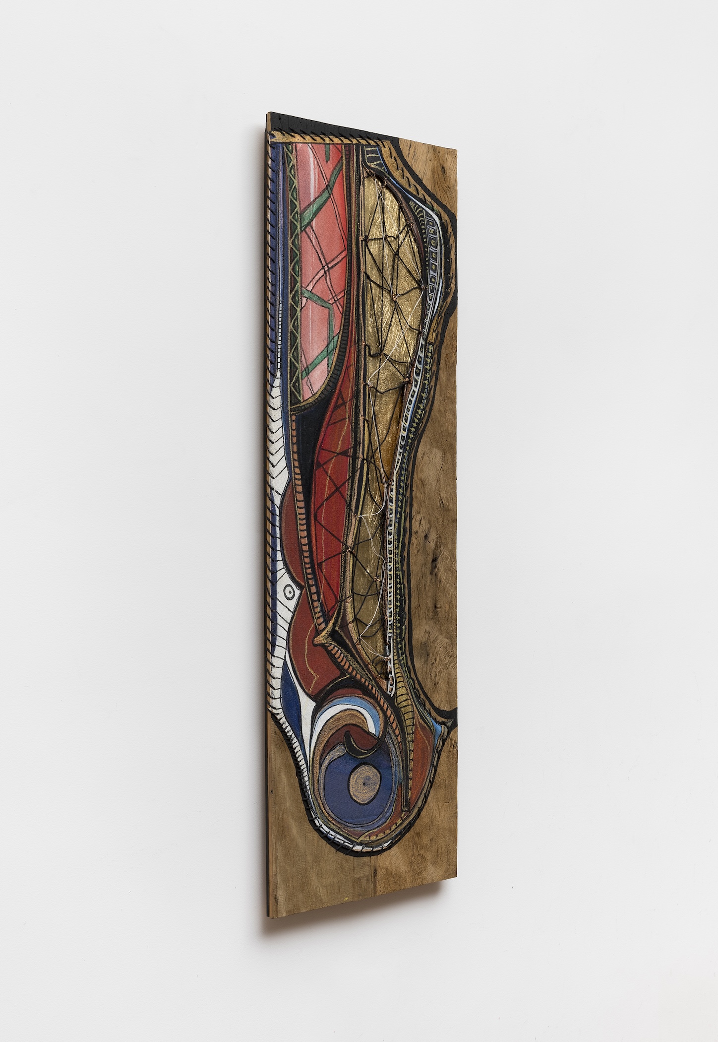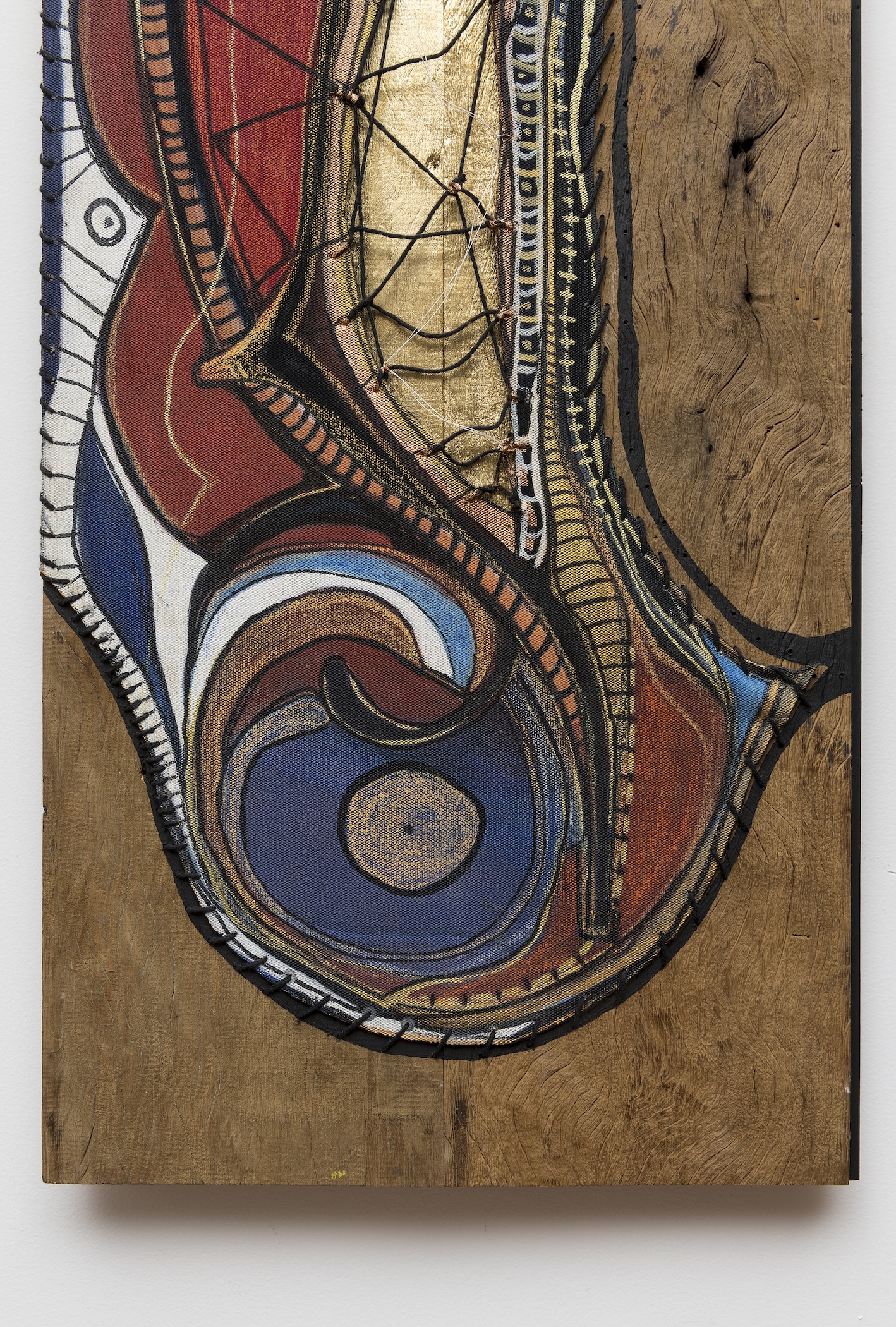 Acrylic, gold leaf, thread, and canvas on reclaimed wood