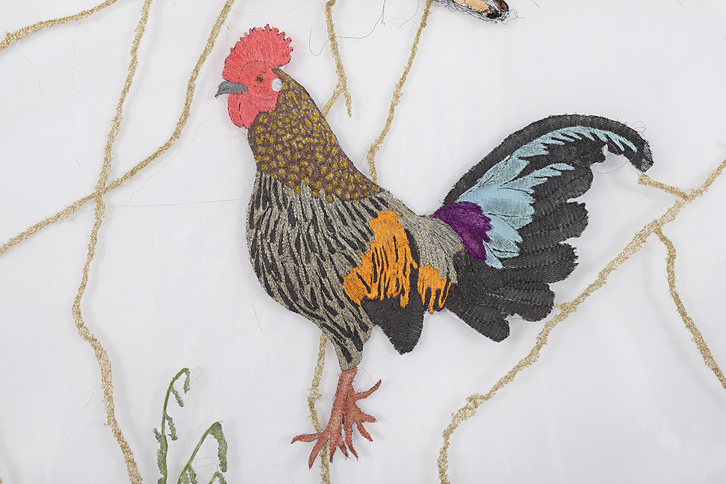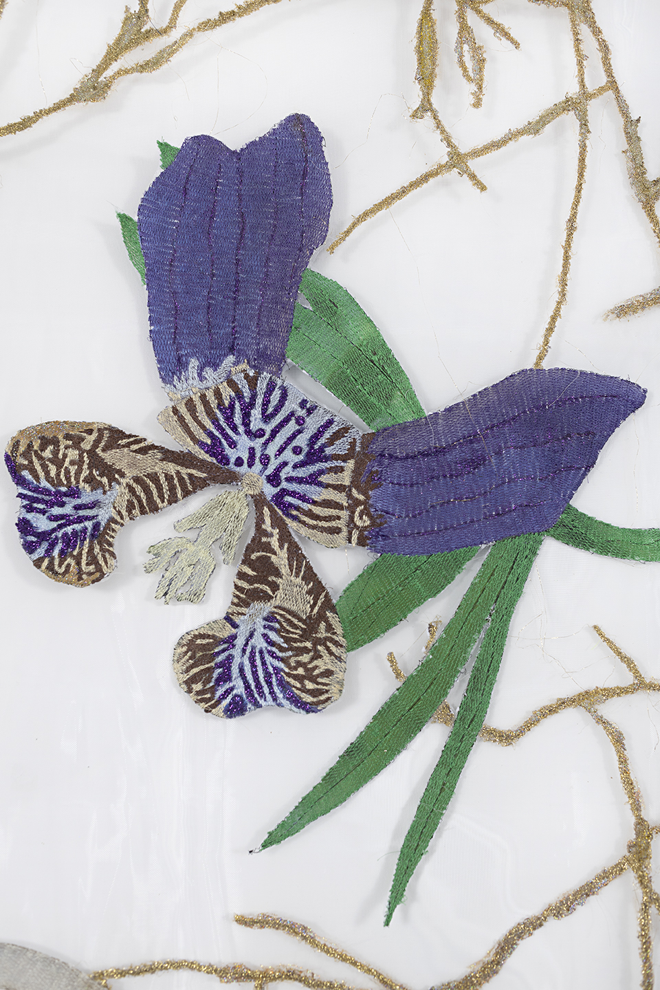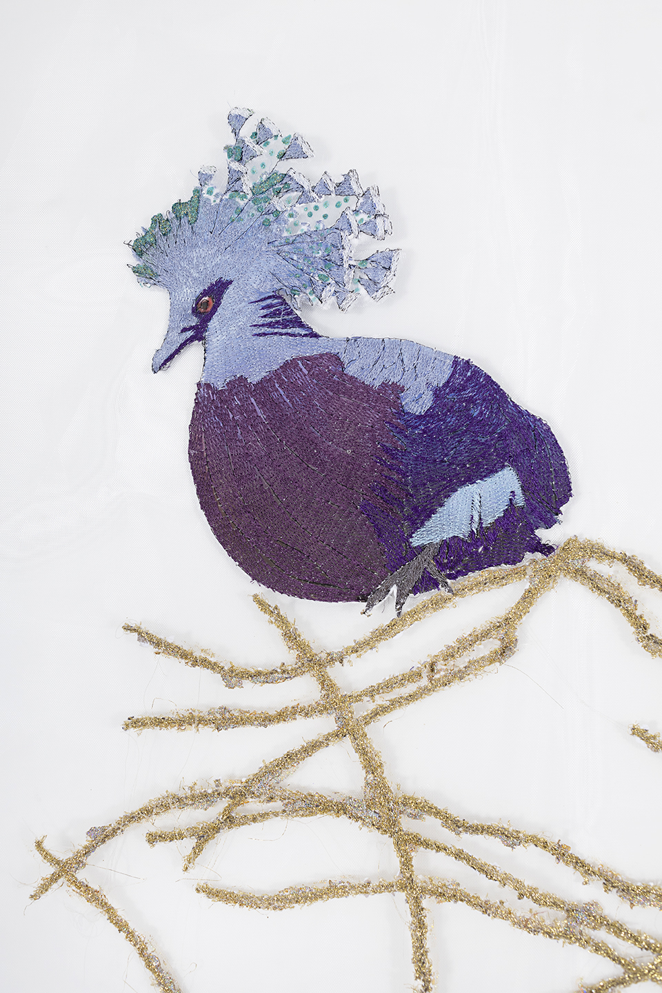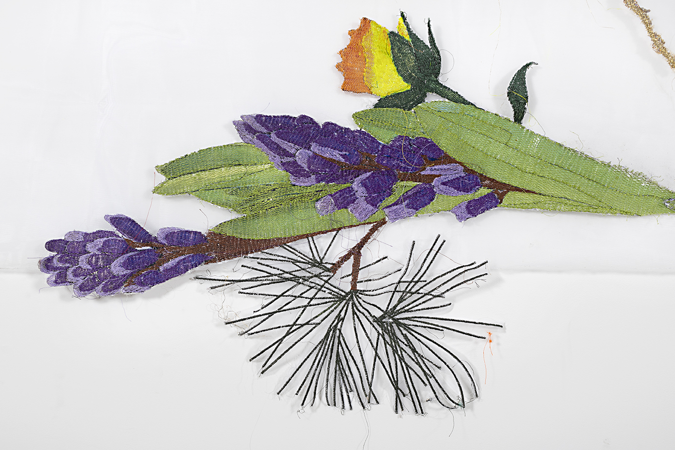 Embroidery on crinoline fabric with glitter, natural pigments, and acrylic