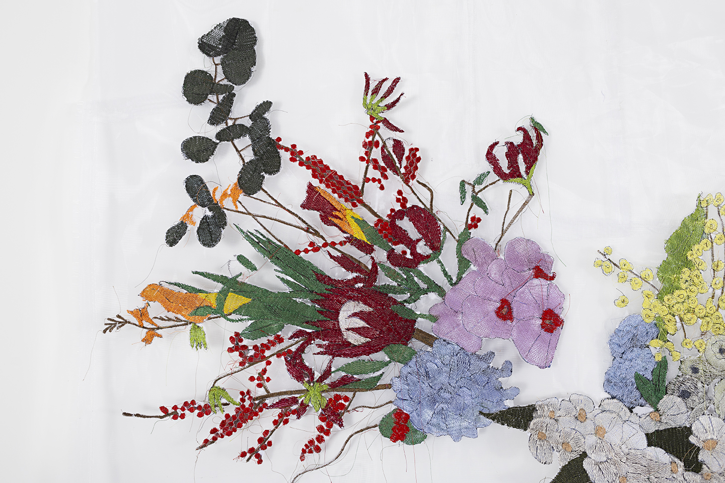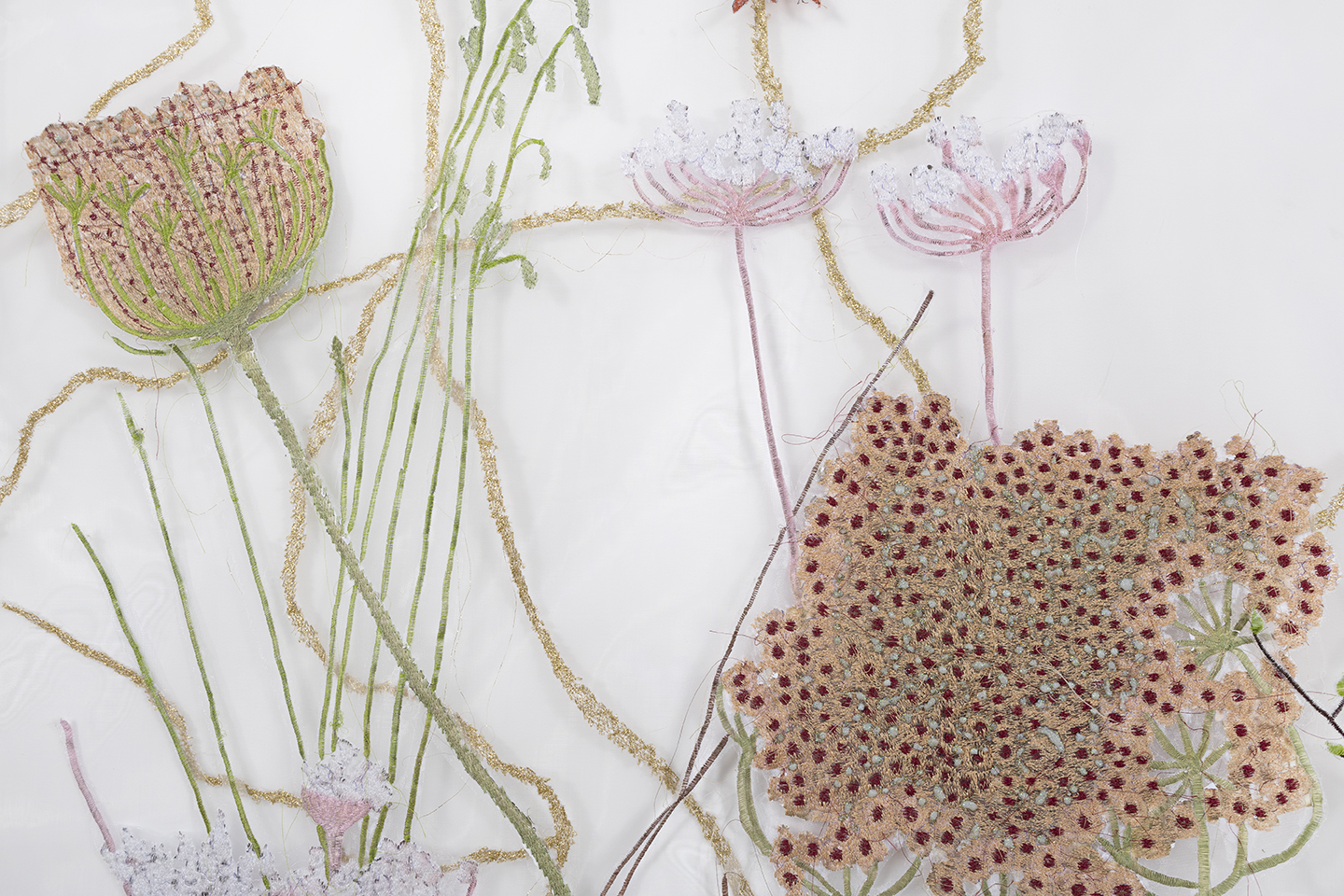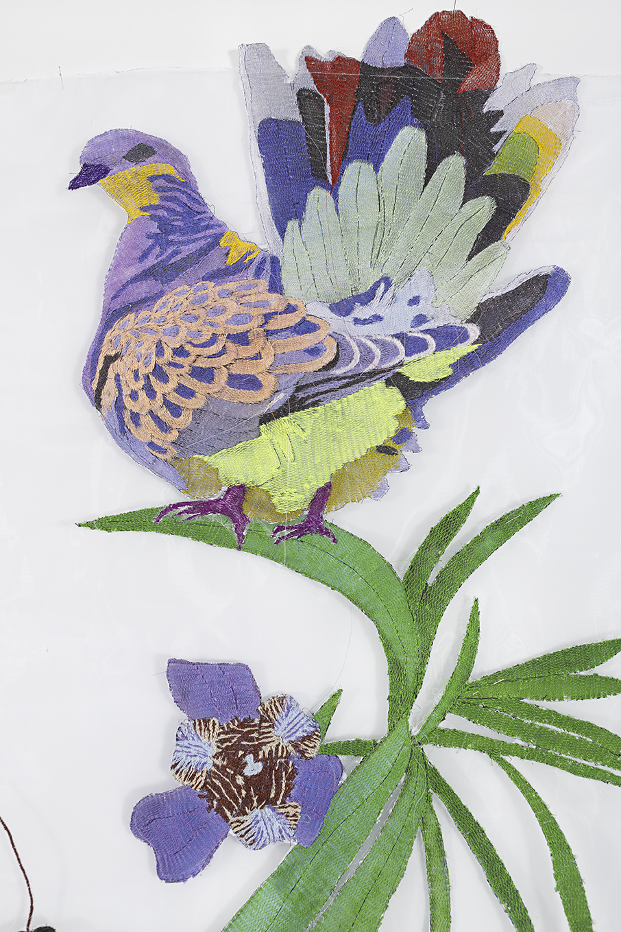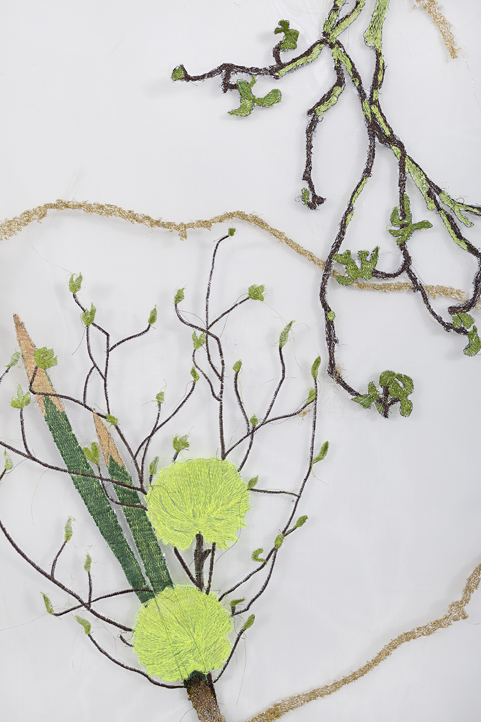 Embroidery on crinoline fabric with glitter, natural pigments, and acrylic