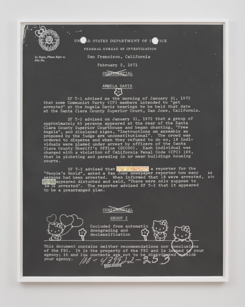 The exhibition also continues Barnette’s FBI Drawings series, examining the FBI’s targeting of her father’s involvement in the Black Panther Party when he founded the Compton chapter in California in 1968. This series takes scans of her father’s FBI file and re-engineers individual pages, enlarging them to five by four feet and overlaying them with exuberant, playful symbols such as flowers and the character Hello Kitty to denigrate modes of empire, surveillance and power. Here, Barnette’s practice throws the bracketing of a collective political past into crisis, shining a light on continued racial injustice. The slow, labor-intensive act of making these drawings gives Barnette the time to meditate on the bravery, politics, and the real lives of people who dared to change the world.
